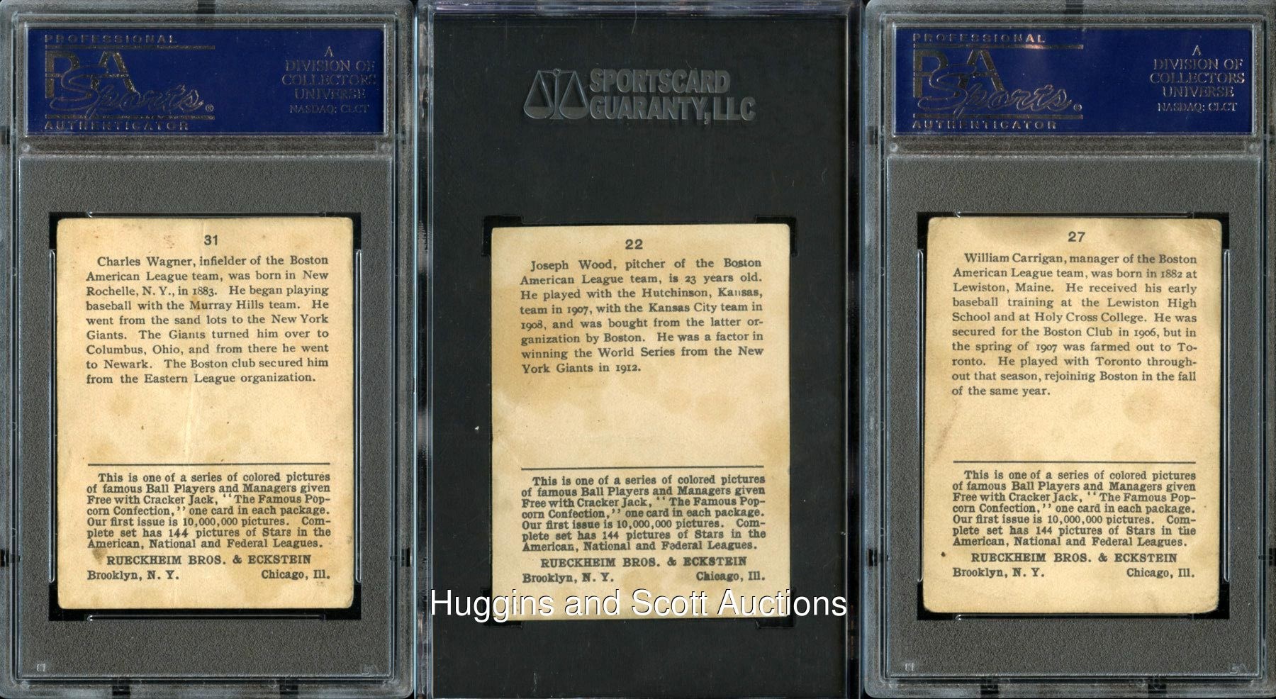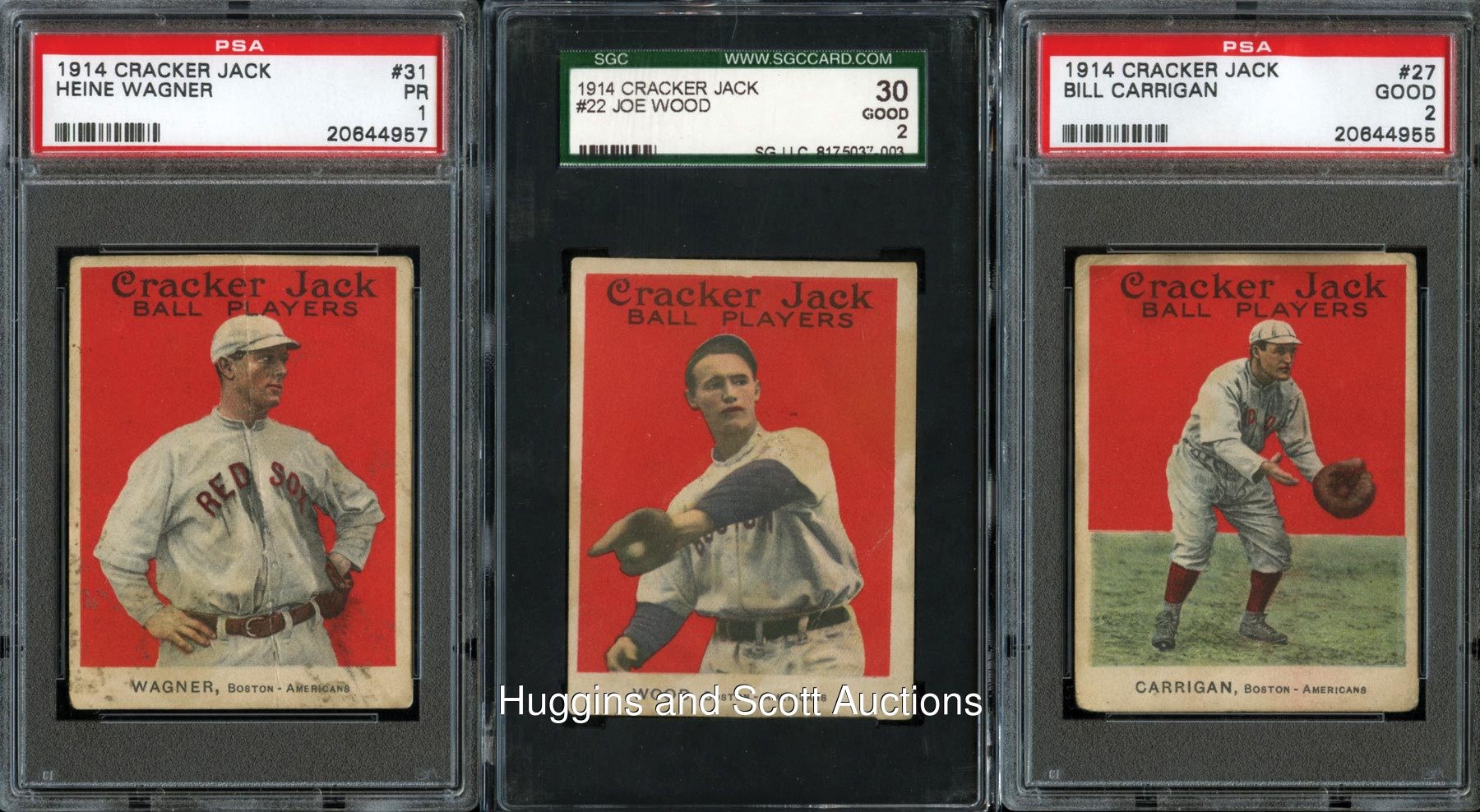 Eye-catching trio of 1914 Cracker Jack Boston Red Sox cards. Each judged by either PSA or SGC. Included are lovely century-old treasures of the following: 1.) #22 Wood (SGC 30); 2.) #27 Carrigan (PSA 2) and 3.) #31 He. Wagner (PSA 1).
