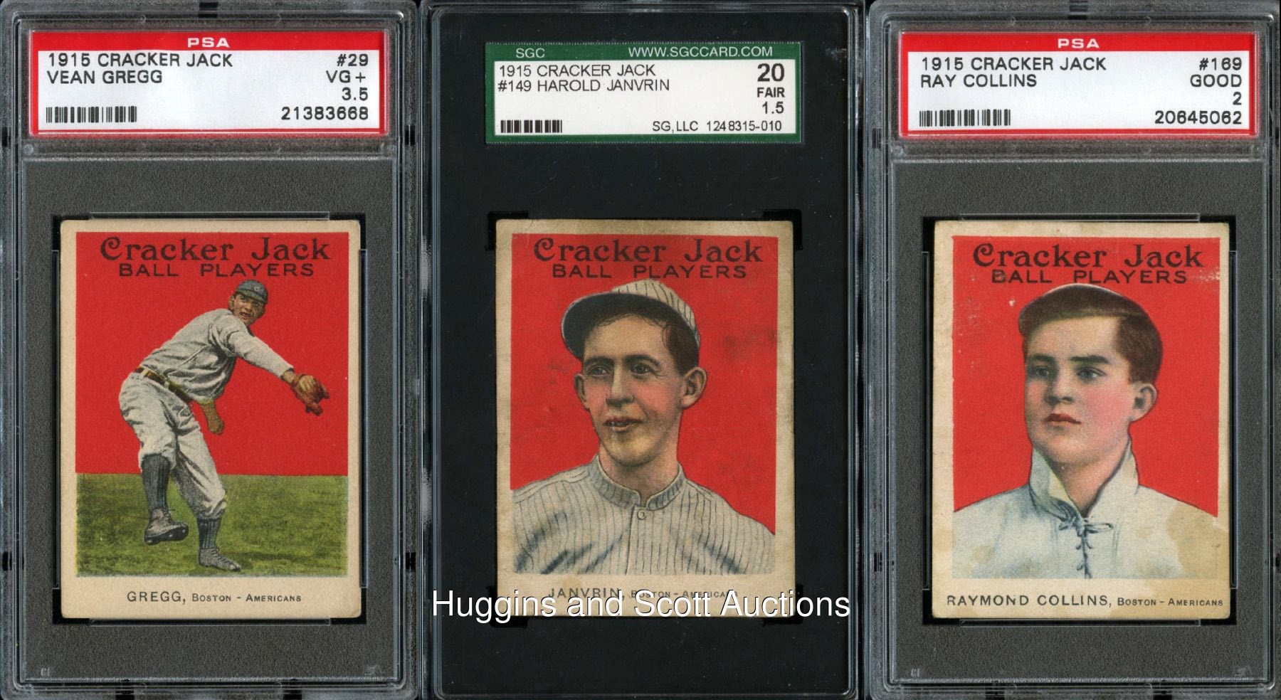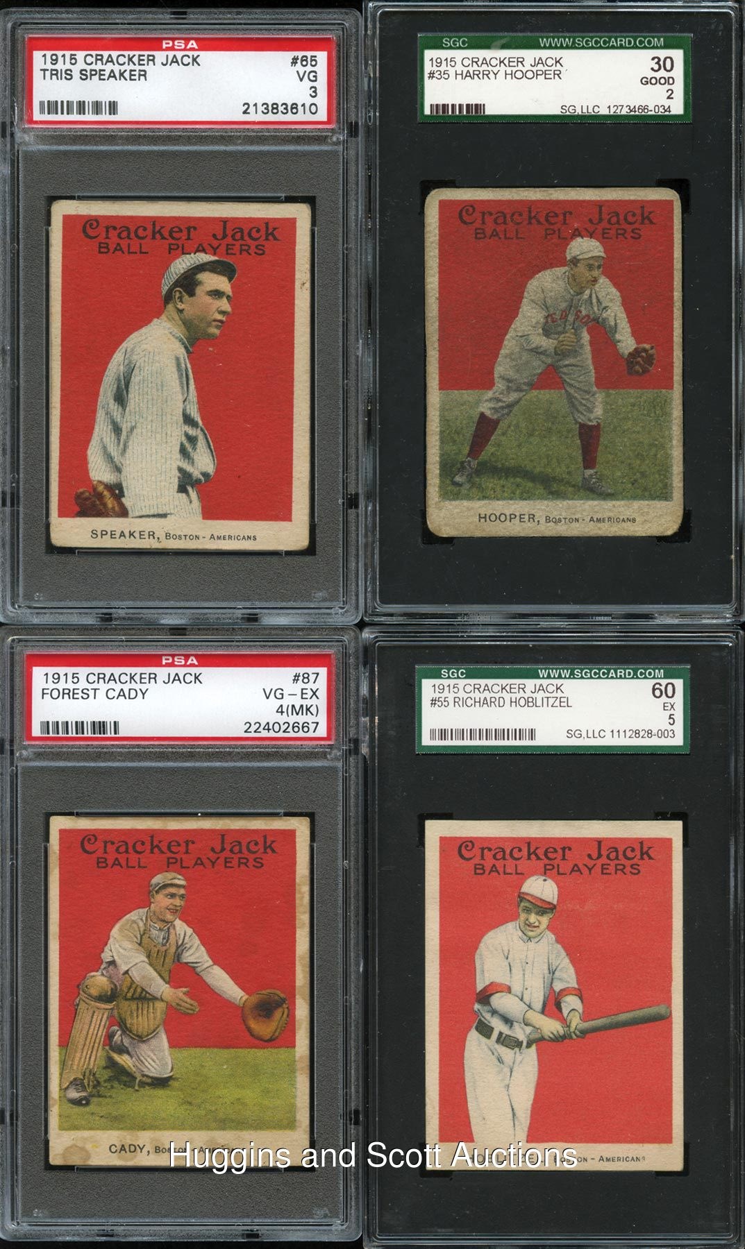 The 1915 World Series Champion Boston Red Sox are gloriously portrayed with the offered 1915 Cracker Jack near team set of (7/10) graded cards. Includes: #29 Gregg (PSA 3.5), #35 Hooper (SGC 30), #55 Hoblitzel (SGC 60), #65 Speaker (PSA 3), #87 Cady (PSA 4, mk), #149 Janvrin (SGC 20) and #169 R. Collins (PSA 2). Missing only #22 Wood, #27 Carrigan and #31 He. Wagner for completion.
