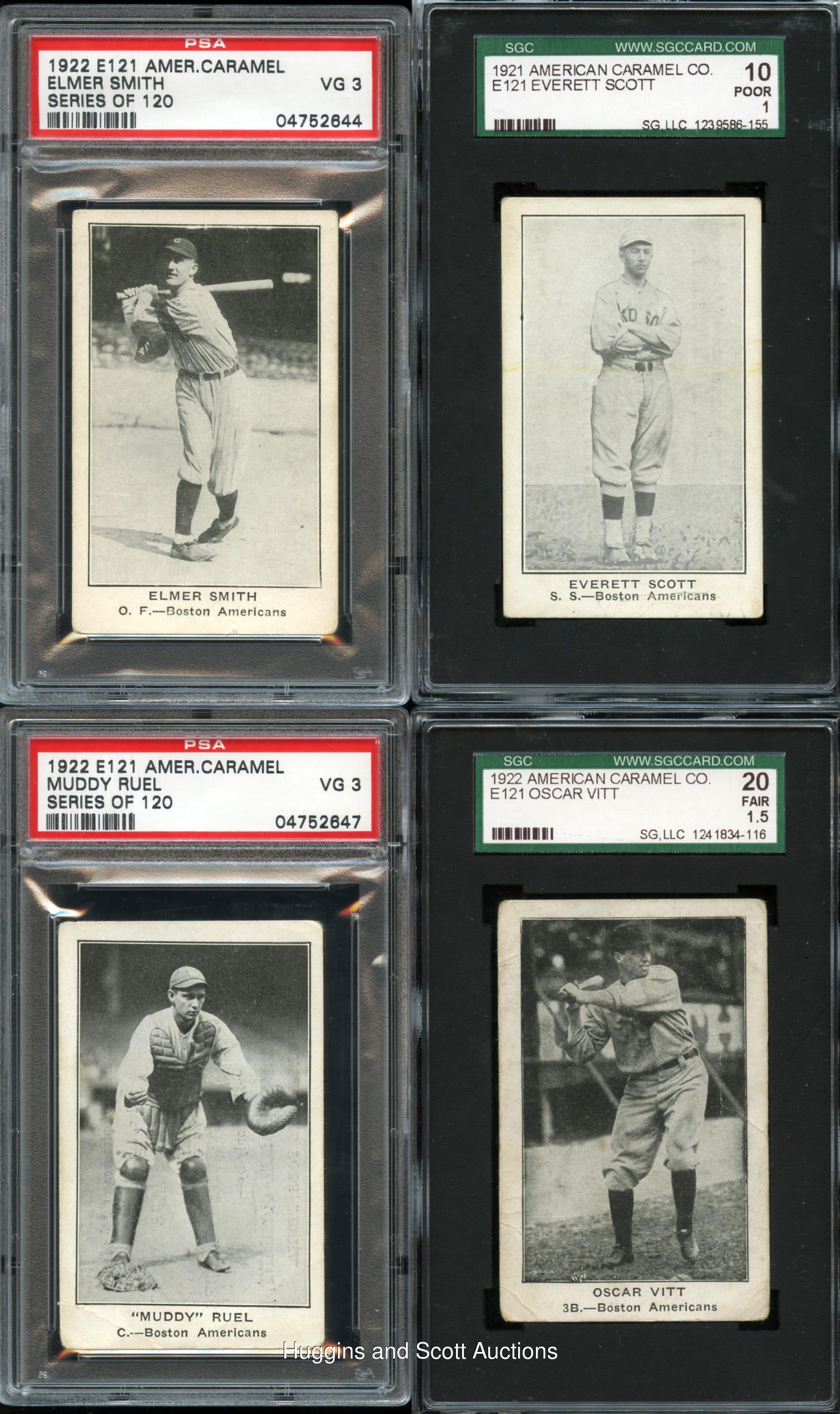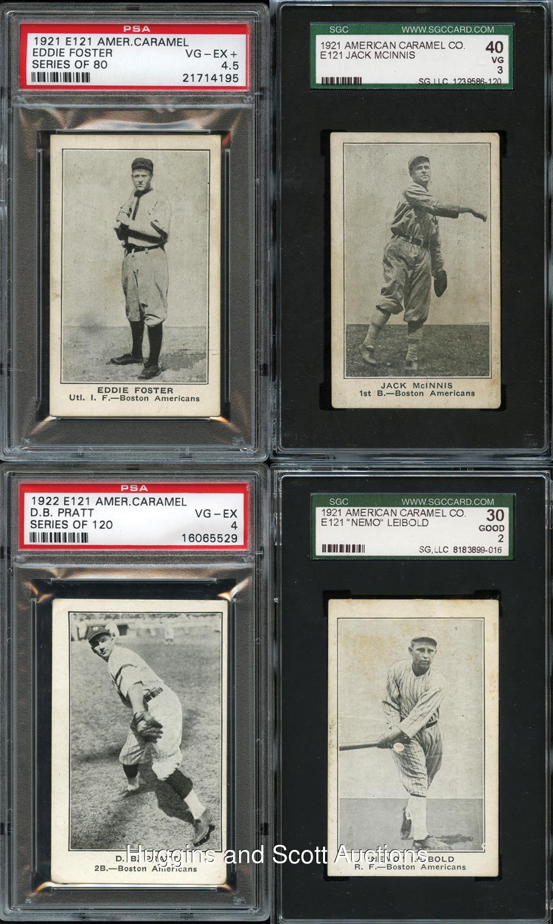 Each graded by either PSA or SGC. Gallery of eight 1921-22 E121 American Caramel Series of 80/120 Boston Red Sox graded cards. Includes: 1921 E121 American Caramel Series of 80: (4 cards) with Foster (PSA 4.5), Leibold (SGC 30), McInnis (SGC 40), Scott (SGC 10, due to reverse back stamp); 1922 E121 American Caramel Series of 120: (4 cards) with Pratt (PSA 4), Ruel (PSA 3), E. Smith (PSA 3) and Vitt (SGC 20).