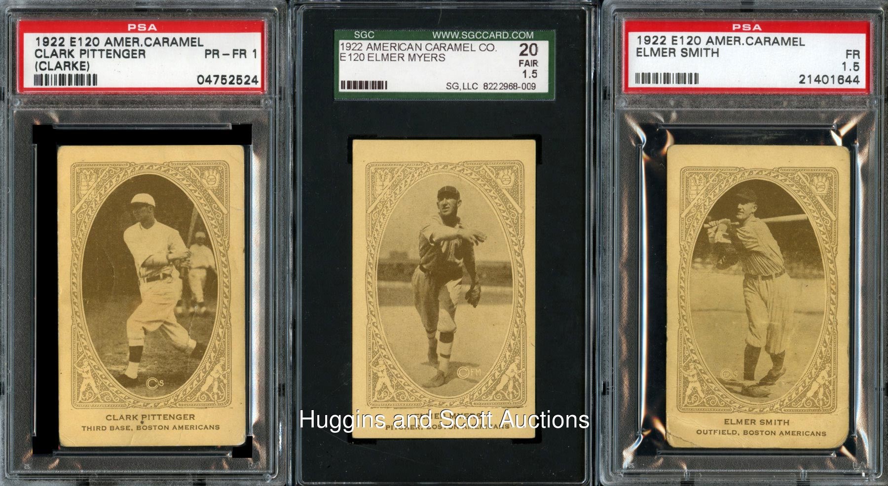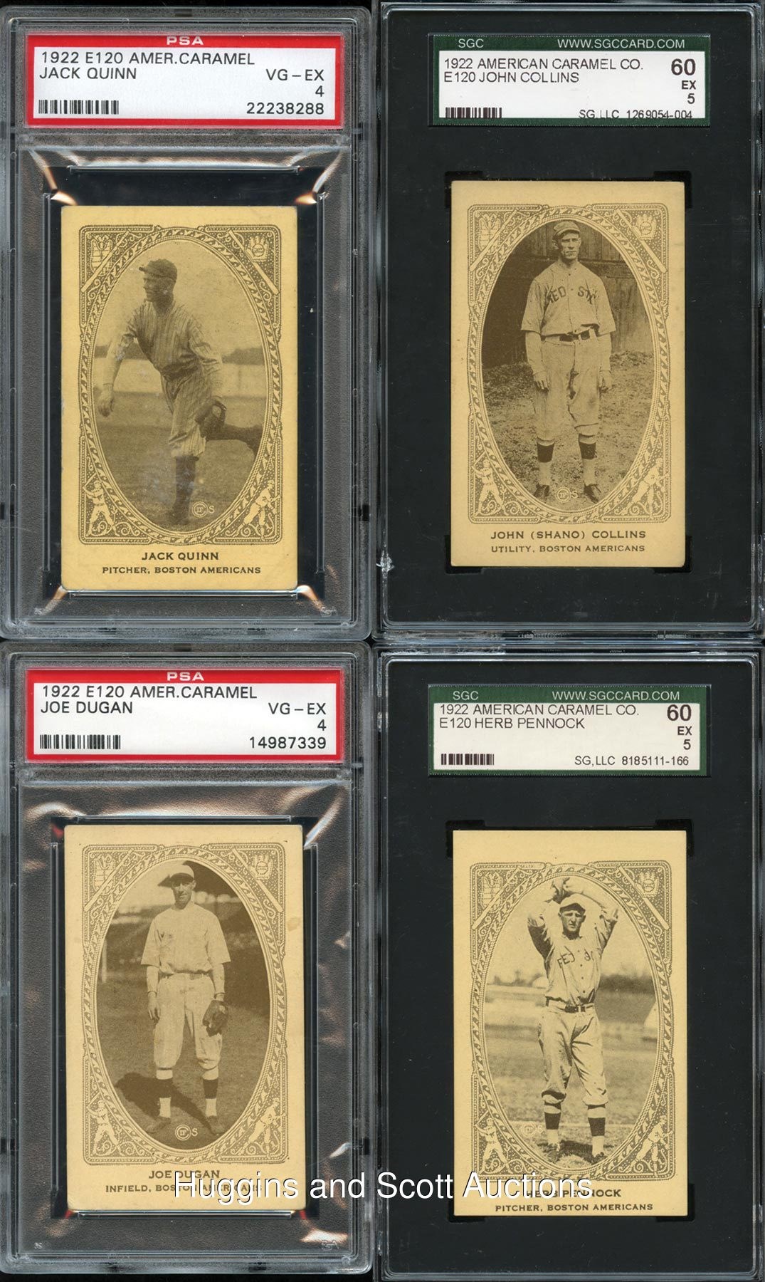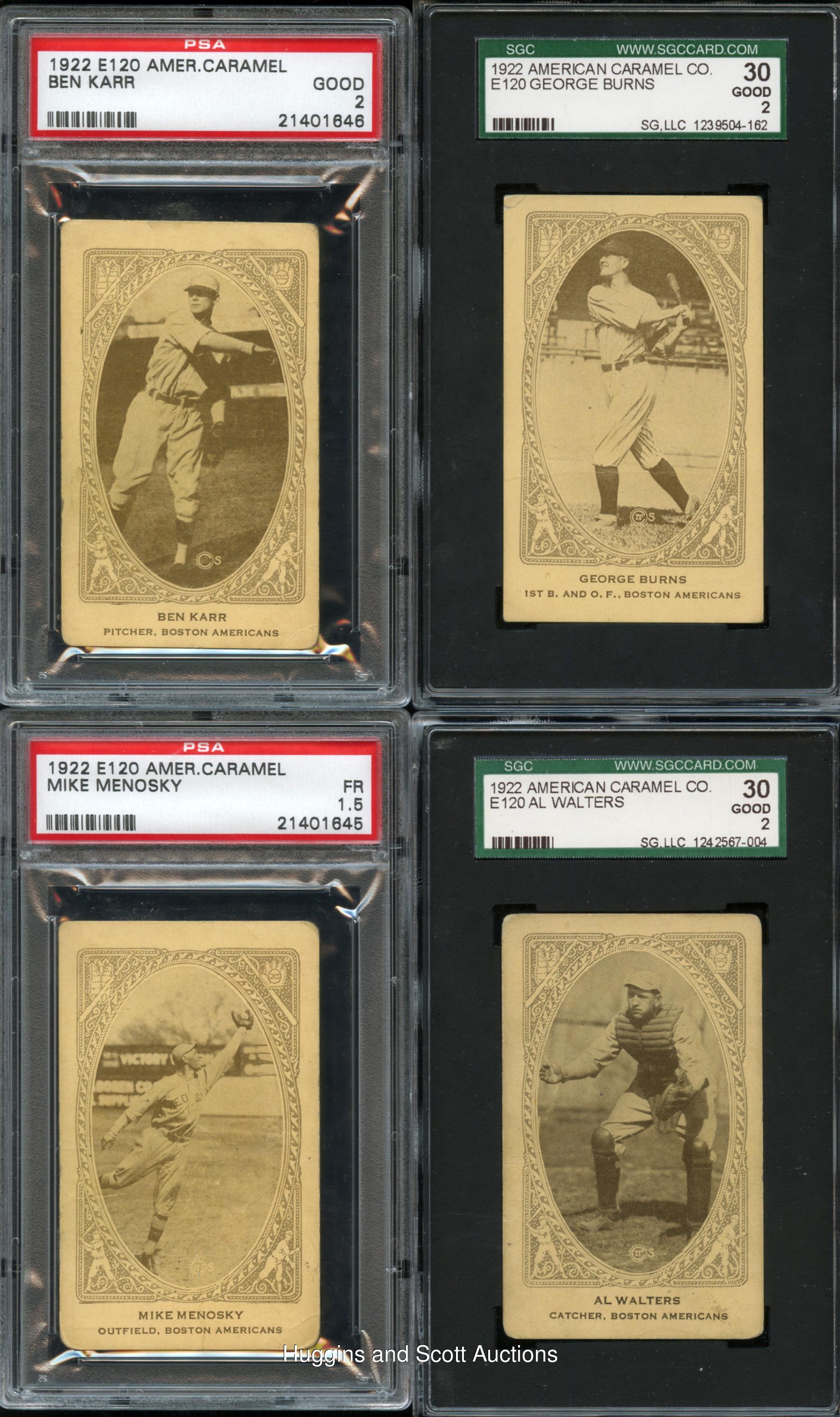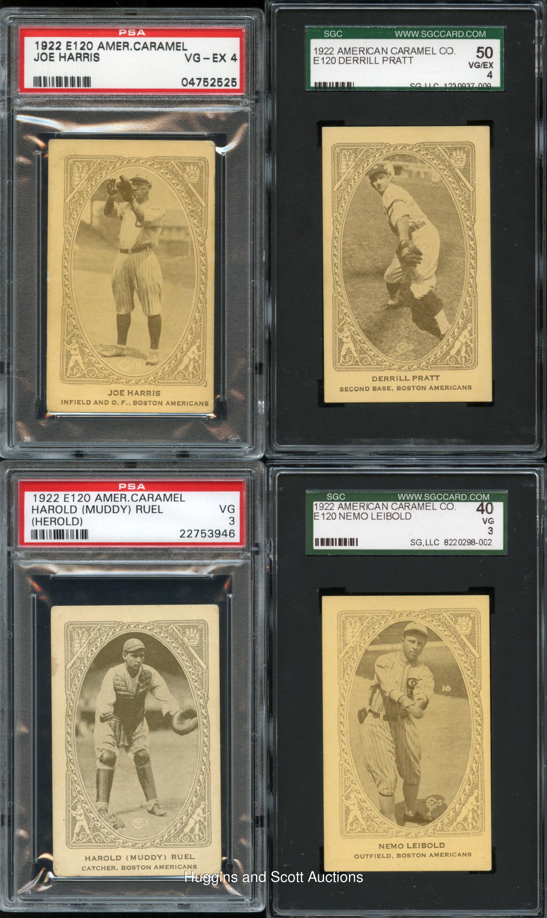 First in the hearts of Beantown and last in the American League. This 1922 E120 American Caramel Series of 240 Boston Red Sox team set features (15) graded cards of the lovable squad. Includes: Burns (SGC 30), J. Collins (SGC 60), Dugan (PSA 4), J. Harris (PSA 4), Karr (PSA 2), Leibold (SGC 40), Menosky (PSA 1.5), Myers (SGC 20), Pennock (SGC 60), Pittenger (PSA 1), Pratt (SGC 50), Quinn (PSA 4), Ruel (PSA 3), E. Smith (PSA 1.5) and Walters (SGC 30).