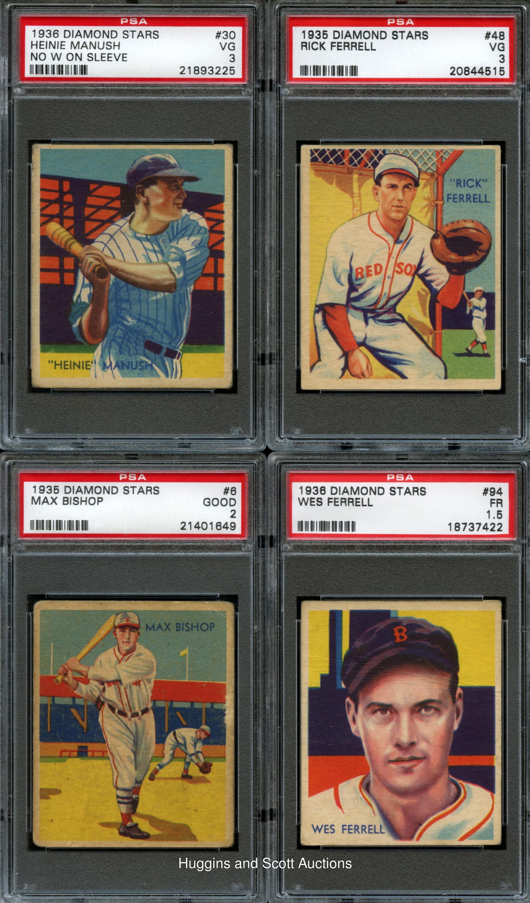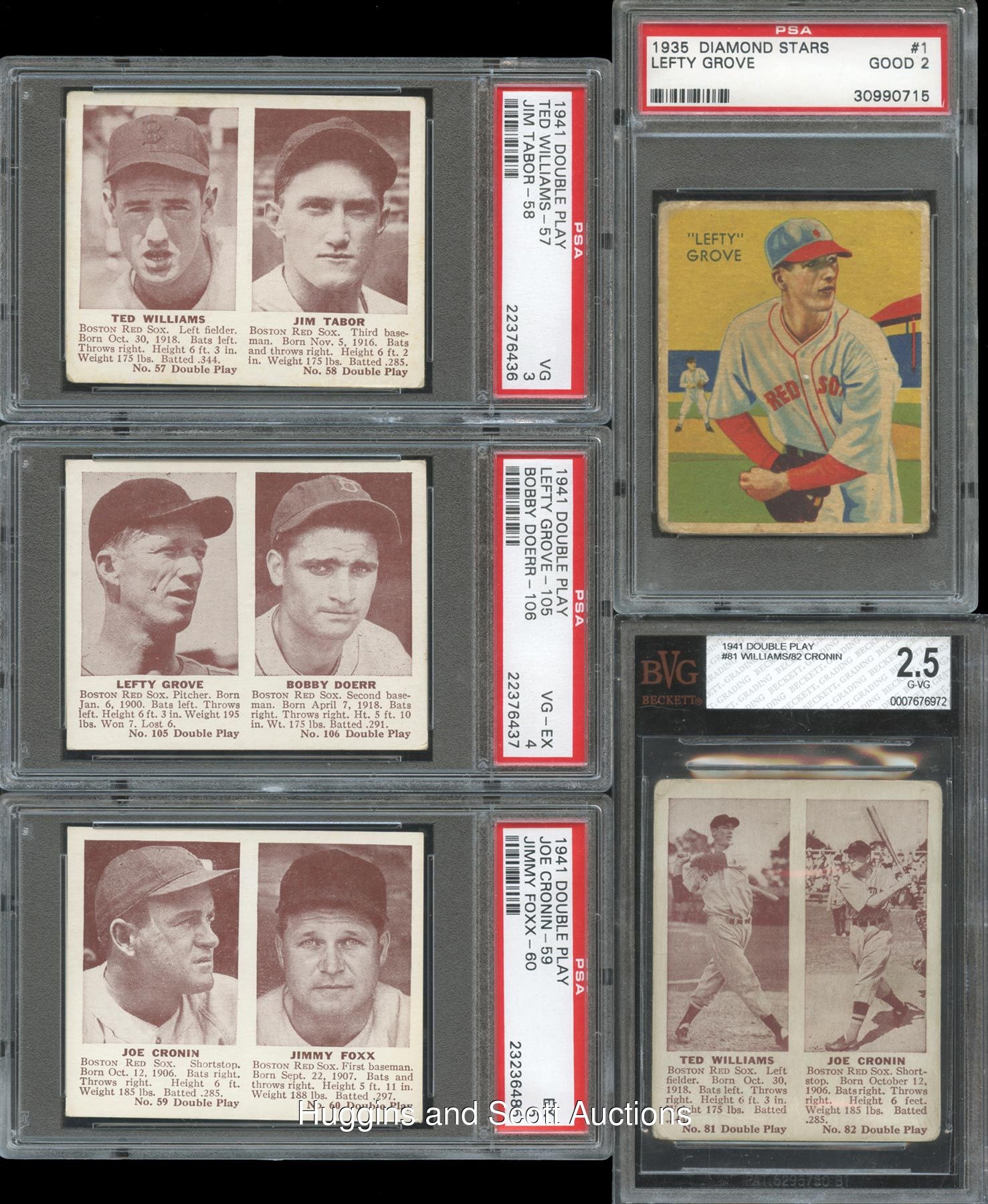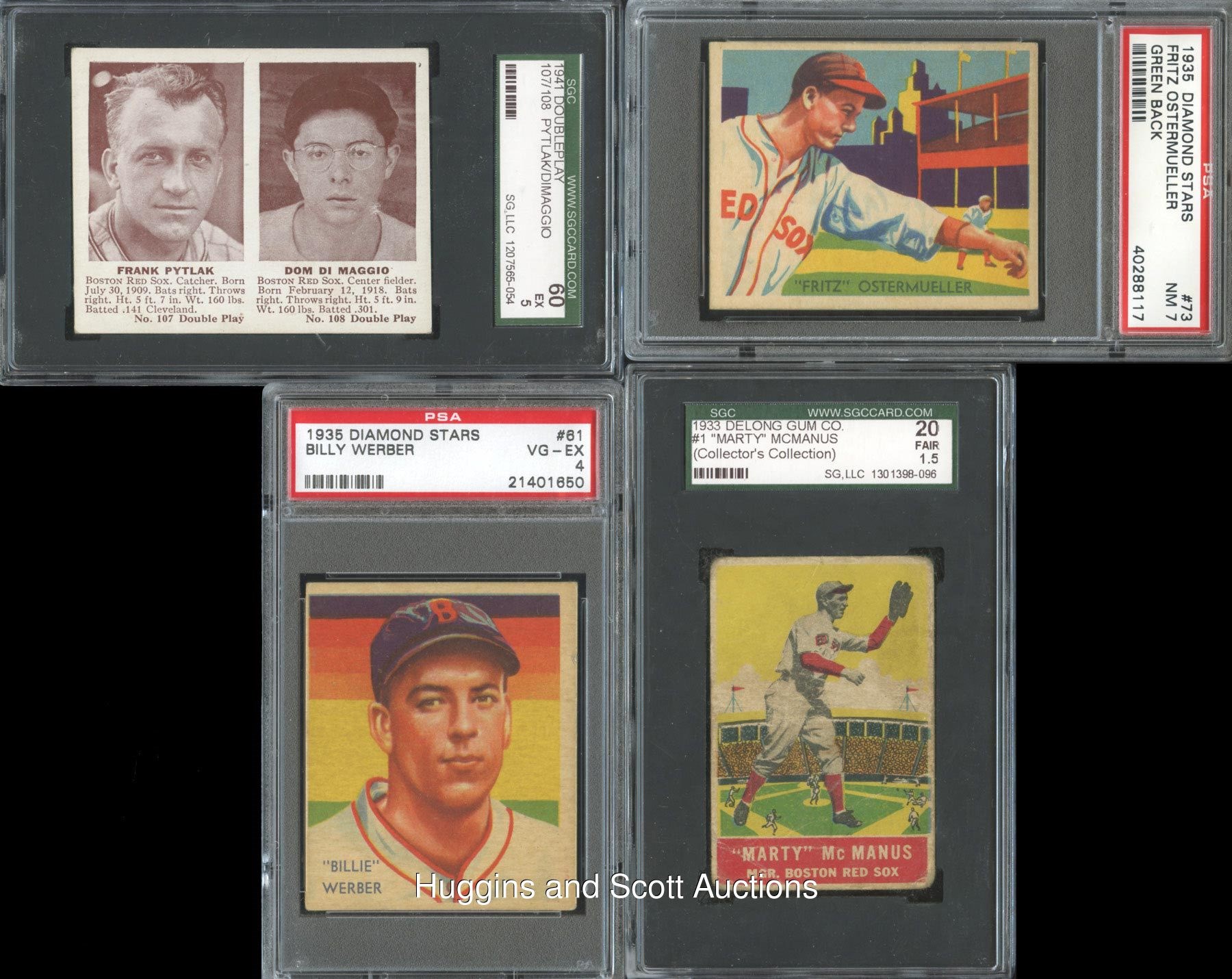 Pre-War Red Sox Collectors! Dig a little deeper and secure these three 1933-1941 Boston Red Sox graded team sets. Includes: 1933 DeLong: #1 McManus (SGC 20); 1934-36 Diamond Stars set: (7 cards) with #1 Grove (PSA 2), #6 Bishop (PSA 2), #30 Manush (PSA 3, No “W” on Sleeve), #48 R. Ferrell (PSA 3), #61 Werber (PSA 4), #73 Ostermueller (PSA 7), #94 W. Ferrell (PSA 1.5); 1941 Double Play set: (5 cards) with #57 T. Williams/58 (PSA 3), #59 Cronin/Foxx (PSA 5), #81 T. Williams/#82 Cronin (BVG 2.5), #105 Grove/#106 Doerr (PSA 4) and #107/#108 D. DiMaggio (SGC 60).