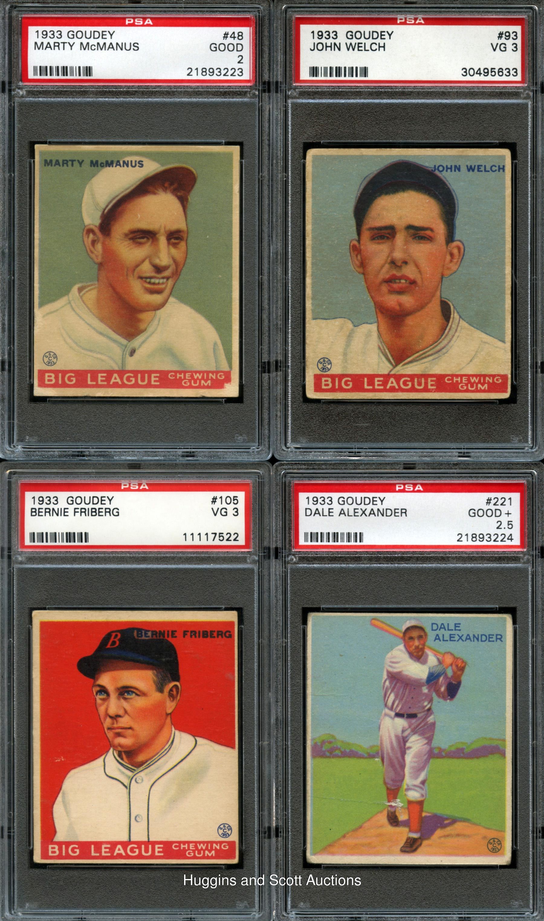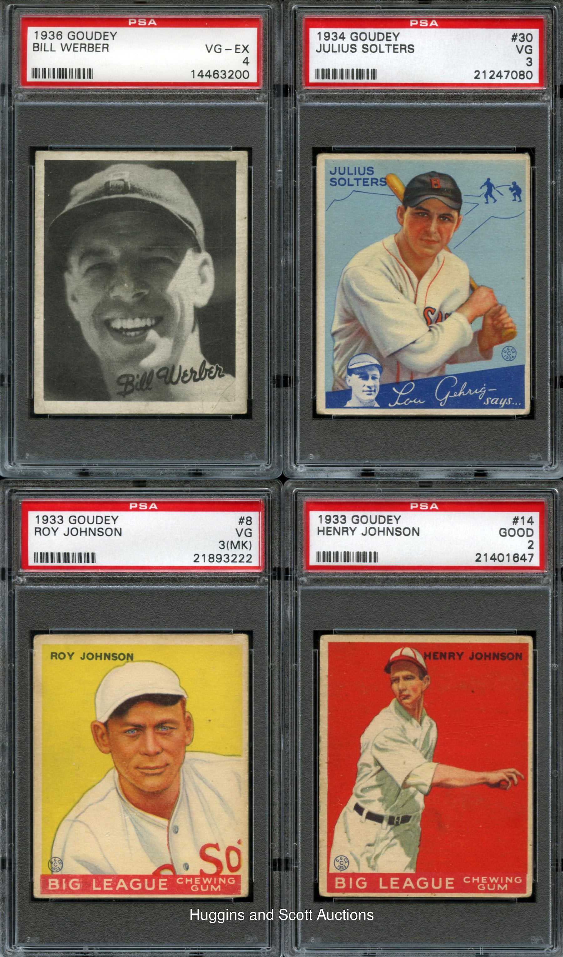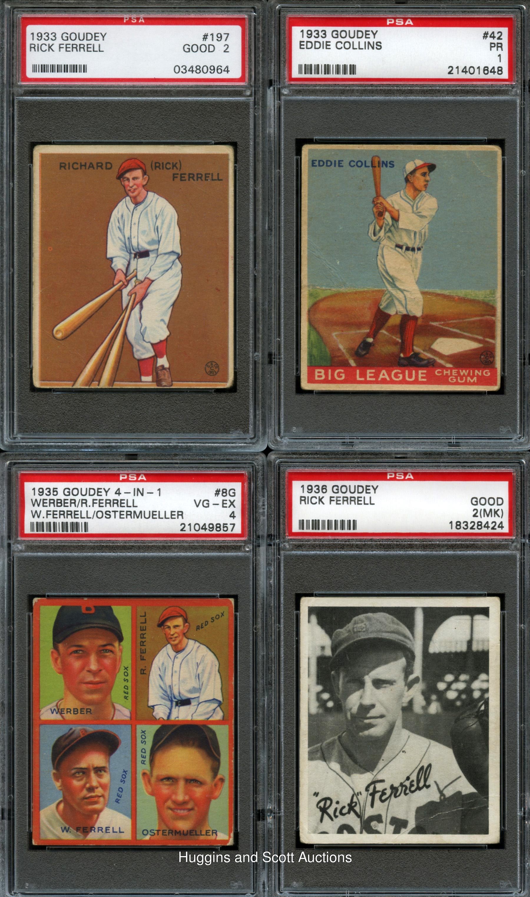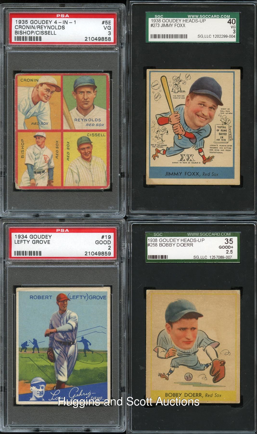 Spotlighted are six 1933-1941 Goudey Baseball Boston Red Sox complete/near graded team sets. Includes: 1933 Goudey set: (8 cards) with #8 (PSA 3, mk), #14 (PSA 2), #42 E. Collins (PSA 1), 48 (PSA 2), 93 (PSA 3), 105 (PSA 3), #197 R. Ferrell (PSA 2), 221 (PSA 2.5); 1934 Goudey set: (4 cards) with #19 Grove (PSA 2), 30 (PSA 3), 75 (SGC 60), 93 (SGC 55); 1935 Goudey Four-in-One set: (2 cards) with Cronin/Reynolds (PSA 3), R. Ferrell/W. Ferrell (PSA 4); 1936 Goudey set: (2 cards) with R. Ferrell (PSA 2, mk), Werber (PSA 4); 1938 Goudey near: (3 cards, missing #249 Foxx, #271 Vosmik, #282 Doerr) with #247 (PSA 3), #258 Doerr RC (SGC 35), #273 Foxx (SGC 40) and 1941 Goudey: #6 Dickman (PSA Authentic, Yellow Background).