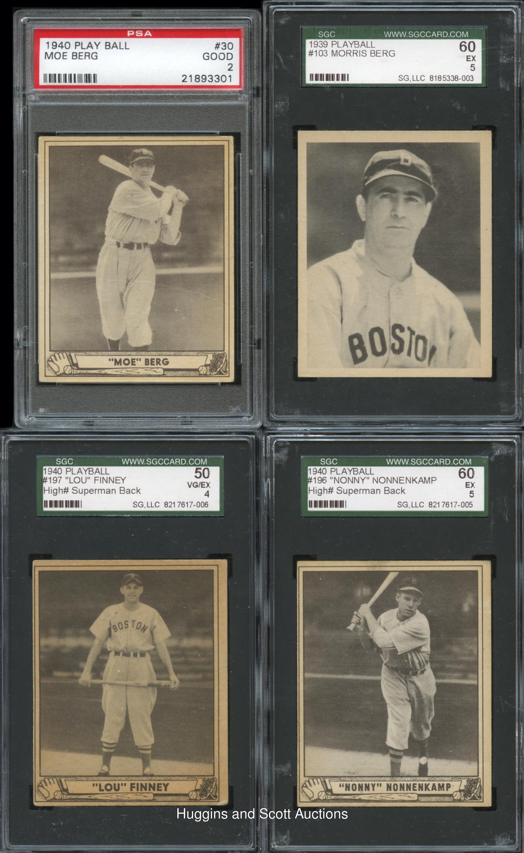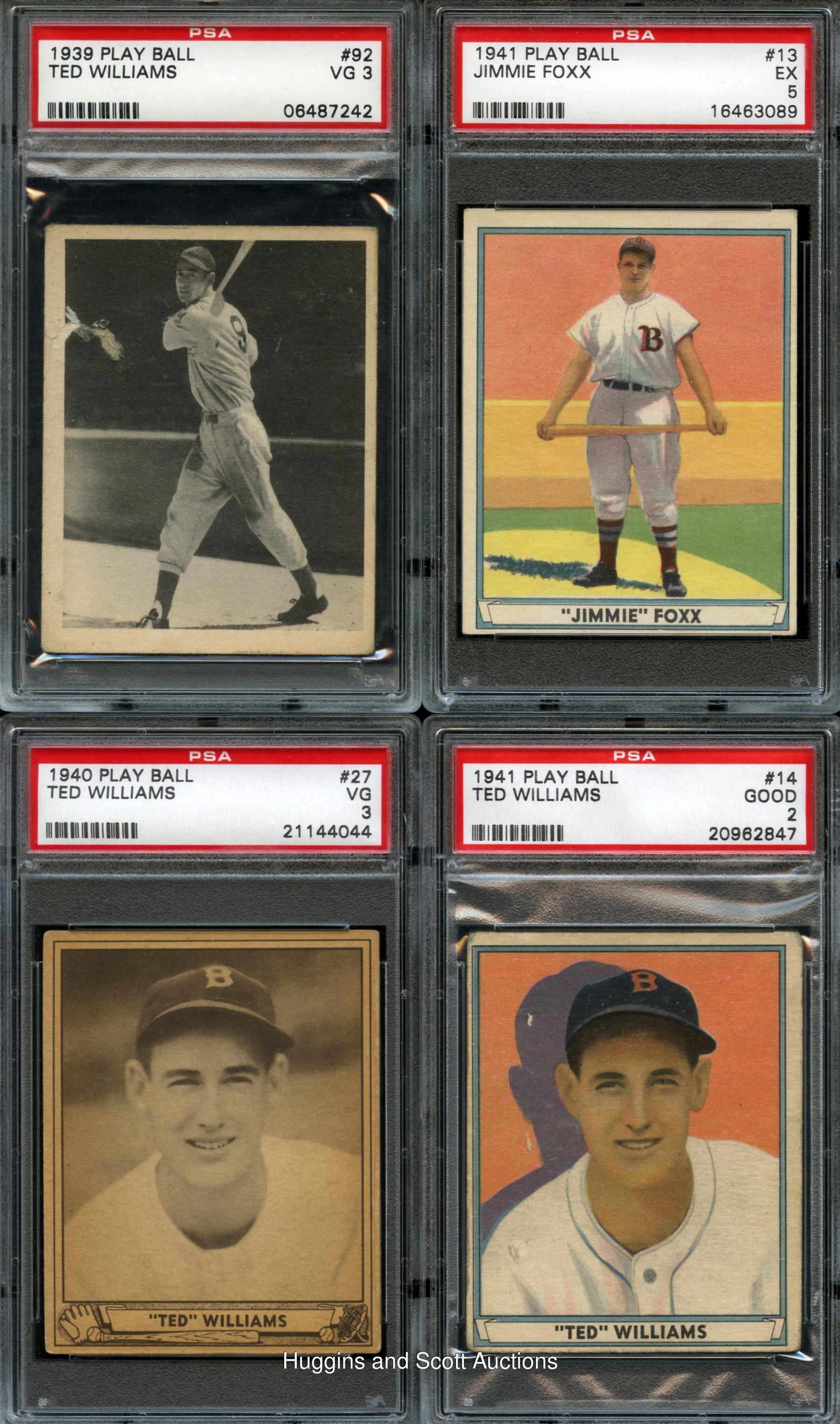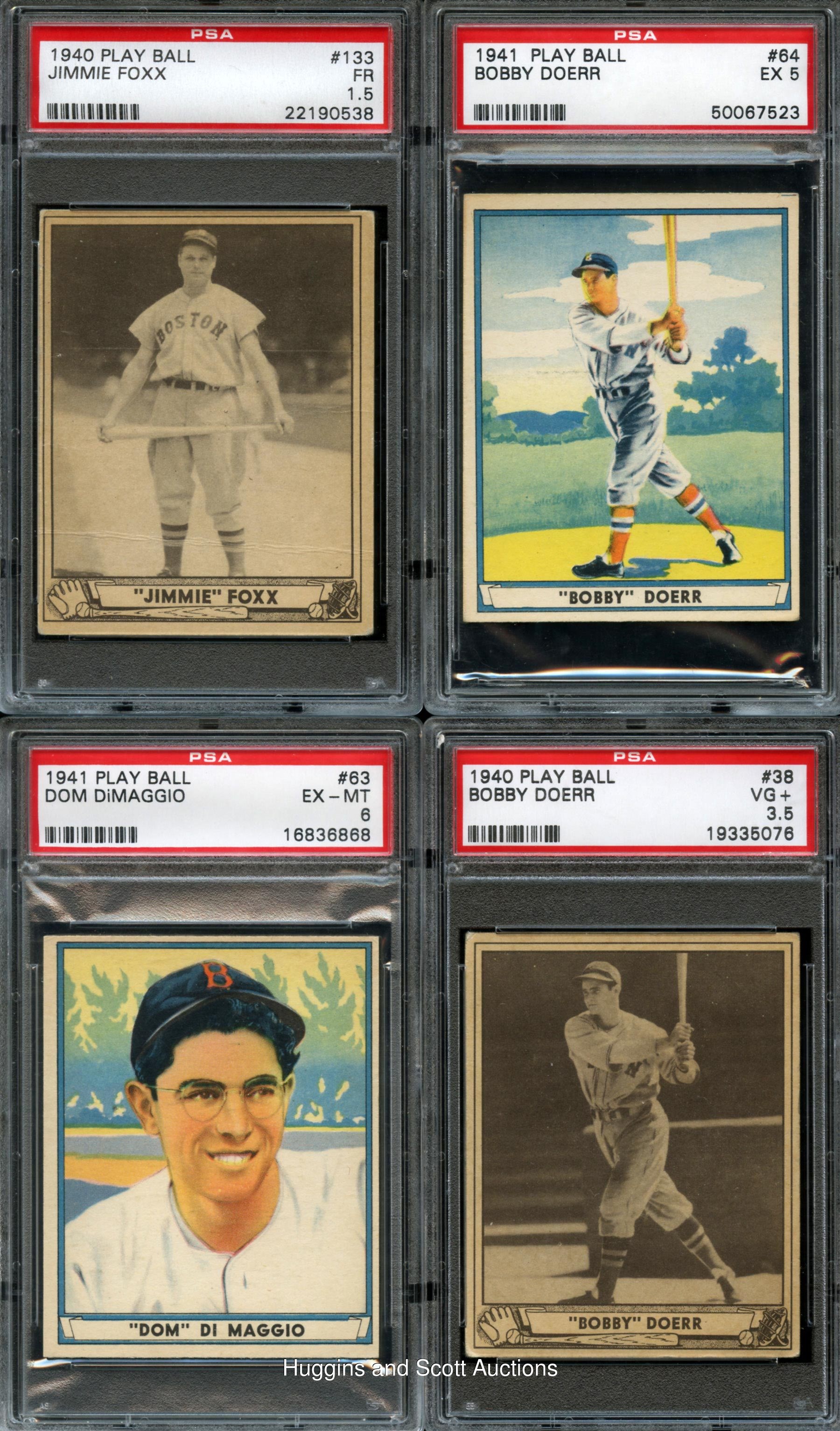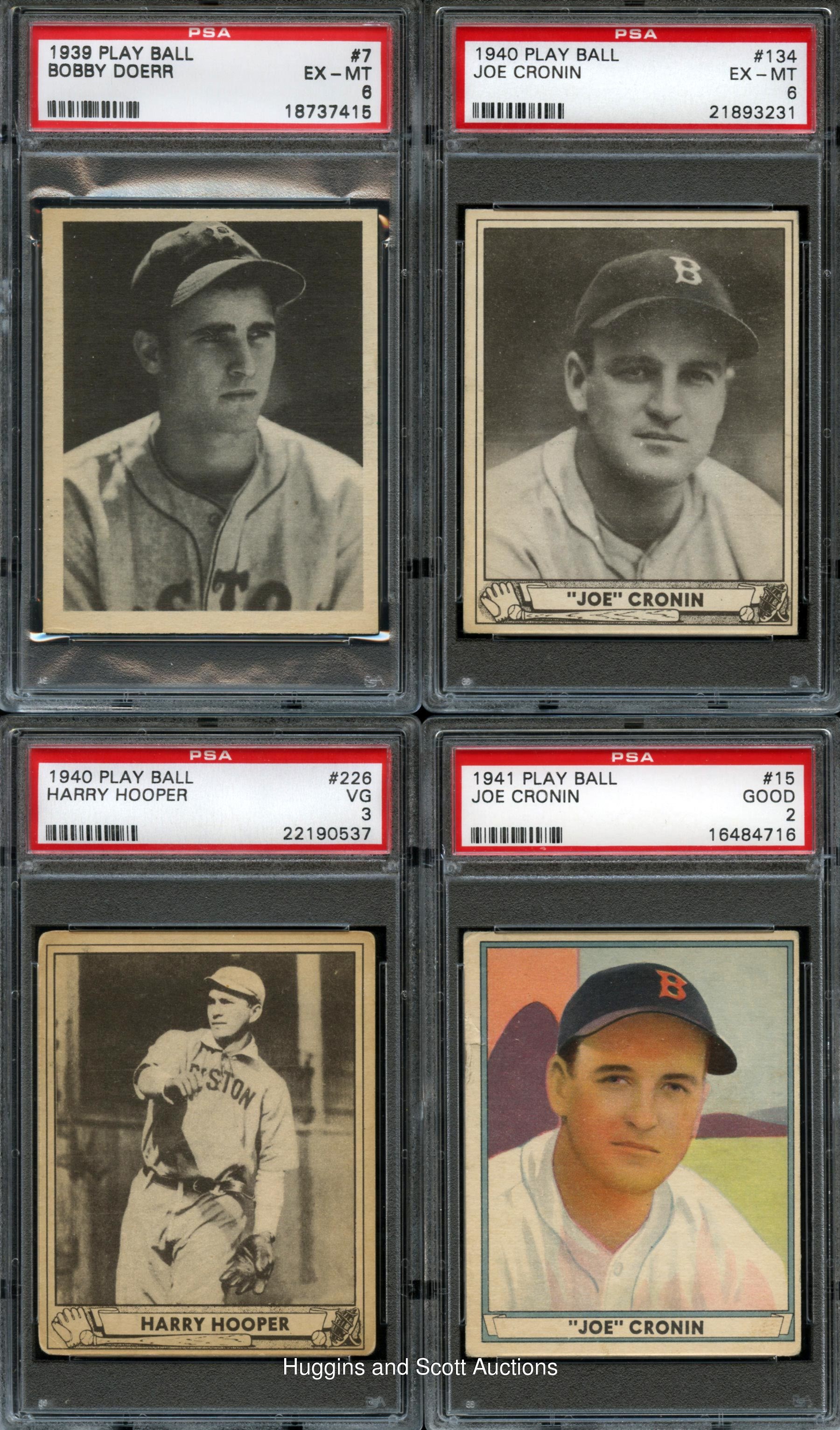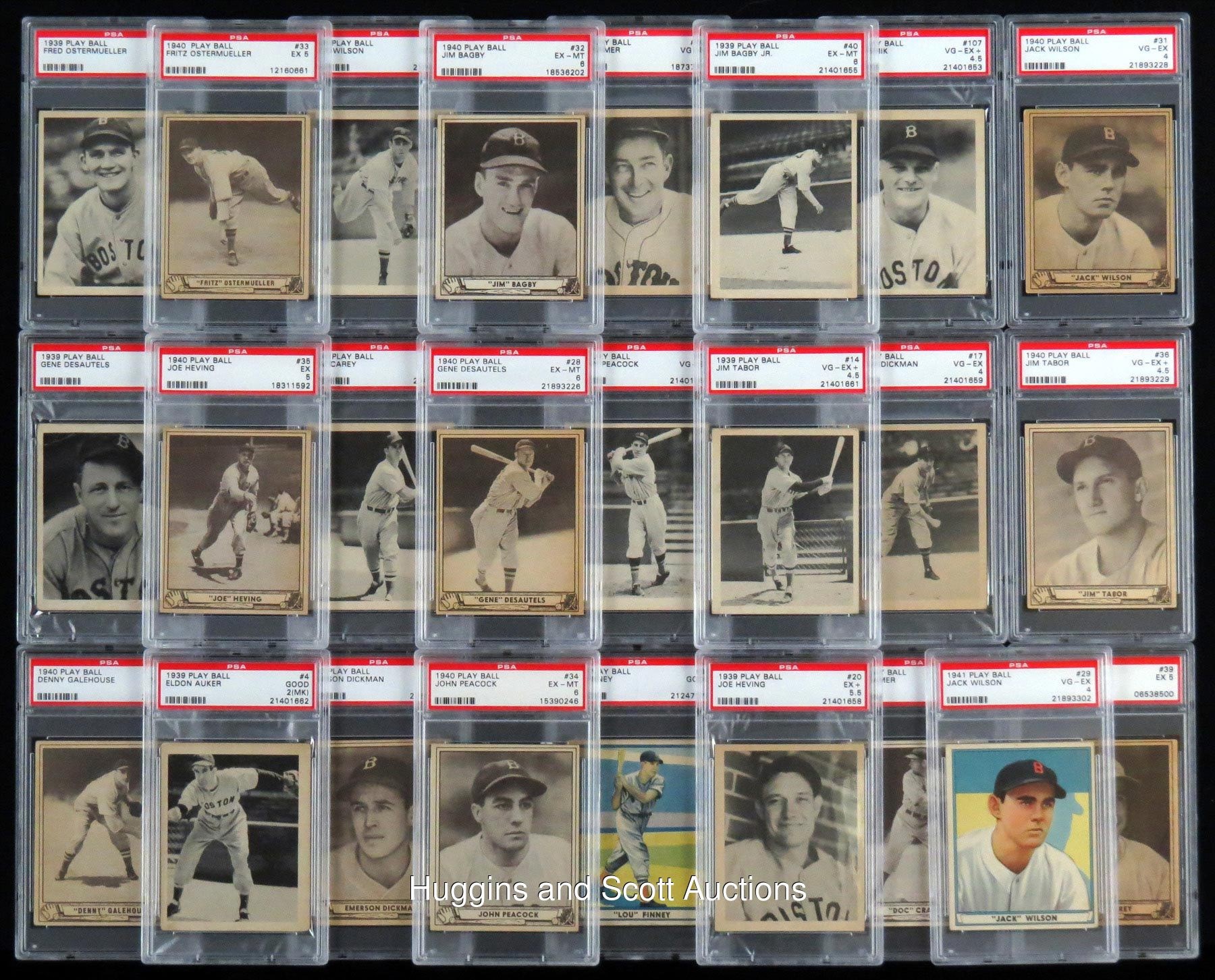 “Teddy Ballgame”, “The Beast” and a sterling cast of Hall of Famers and stars form the offered 1939-1941 Play Ball Boston Red Sox team set run. Each graded by either PSA or SGC. Includes: 1939 Play Ball set: (15 cards) with PSA 6: (2 cards) with #7 Doerr, 40; PSA 5.5: #20; SGC 60: #103 Berg; PSA 4.5: (2 cards) with #14, 107; PSA 4: (5 cards) with #16, 17, 27, 29, 101; PSA 3: (2 cards) with #62, #92 T. Williams RC; PSA 2: #4 (mk); PSA 1: #116; 1940 Play Ball set: (19 cards) with PSA 6: (4 cards) with #28, 32, 34, #134 Cronin; PSA 5: (4 cards) with #29 (mk), 33, 35, 39; SGC 60: #196 (Superman back); PSA 4.5: #36; PSA 4: (2 cards) with #31, 198 (mk); SGC 50: #197 (Superman back); PSA 3.5: #38 Doerr; PSA 3: (2 cards) with #27 T. Williams, #226 Hooper; PSA 2: (2 cards) with #30 Berg, 37 (mk); PSA 1.5: #133 Foxx; 1941 Play Ball set: (7 cards) with PSA 6: #63 D. DiMaggio; PSA 5: (2 cards) with #13 Foxx, #64 Doerr; PSA 4: #29; PSA 2: (3 cards) with #14 T. Williams, #15 Cronin and 30.