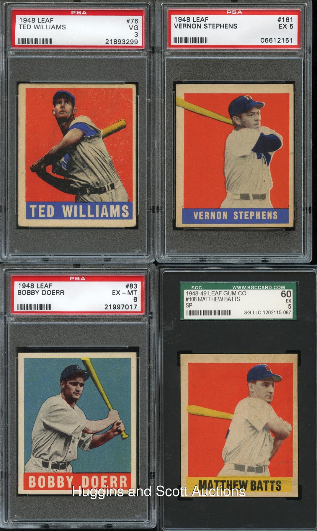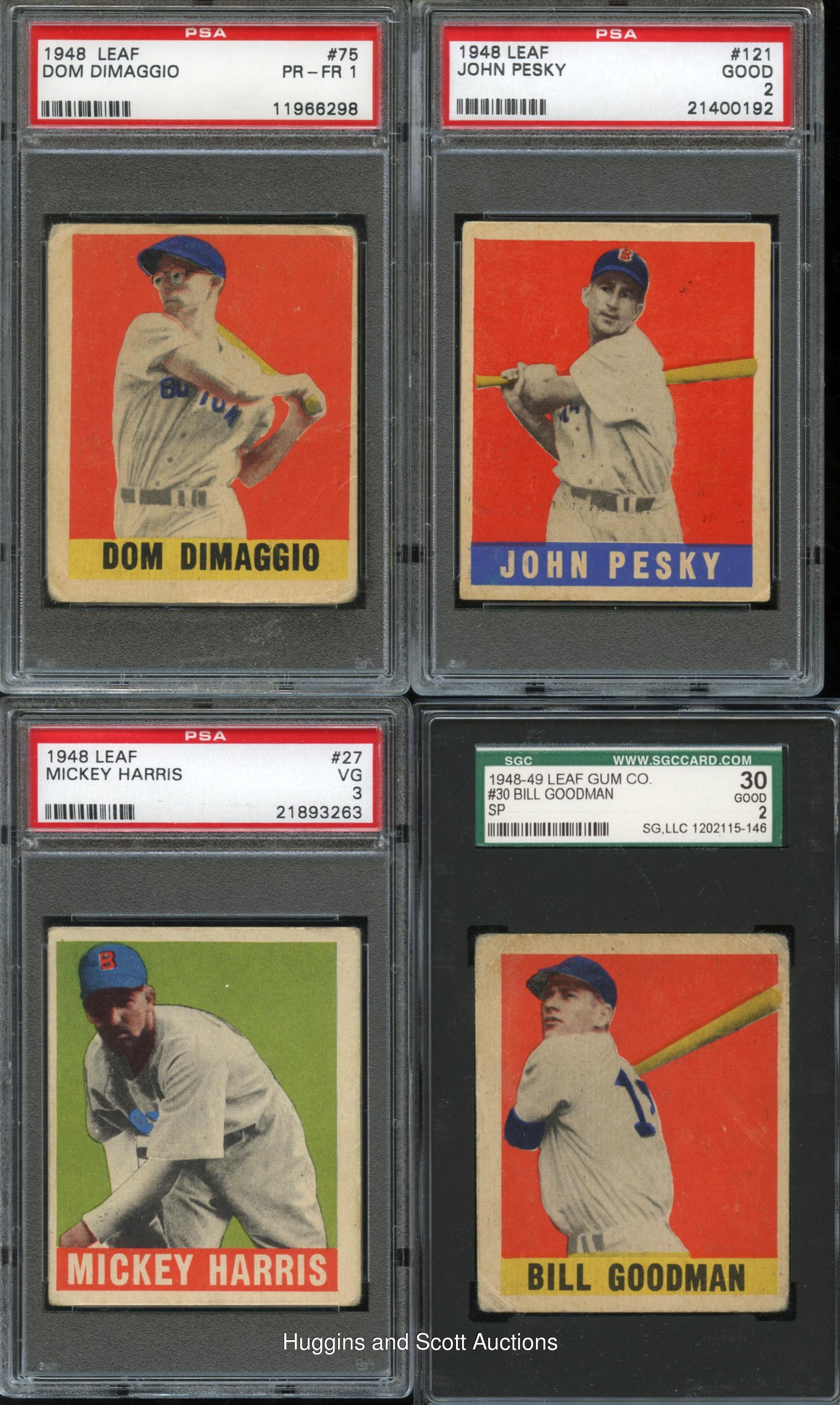 Hall of Famers and shortprints are the foundation for the offered 1948-49 Leaf Baseball Boston Red Sox team set of eight graded cards. Includes: #27 M. Harris (PSA 3), #30 Goodman SP (SGC 30), #75 D. DiMaggio (PSA 1), #76 T. Williams (PSA 3), #83 Doerr (PSA 6), #108 Batts SP (SGC 60), #121 Pesky SP (PSA 2) and #161 Stephens SP (PSA 5).