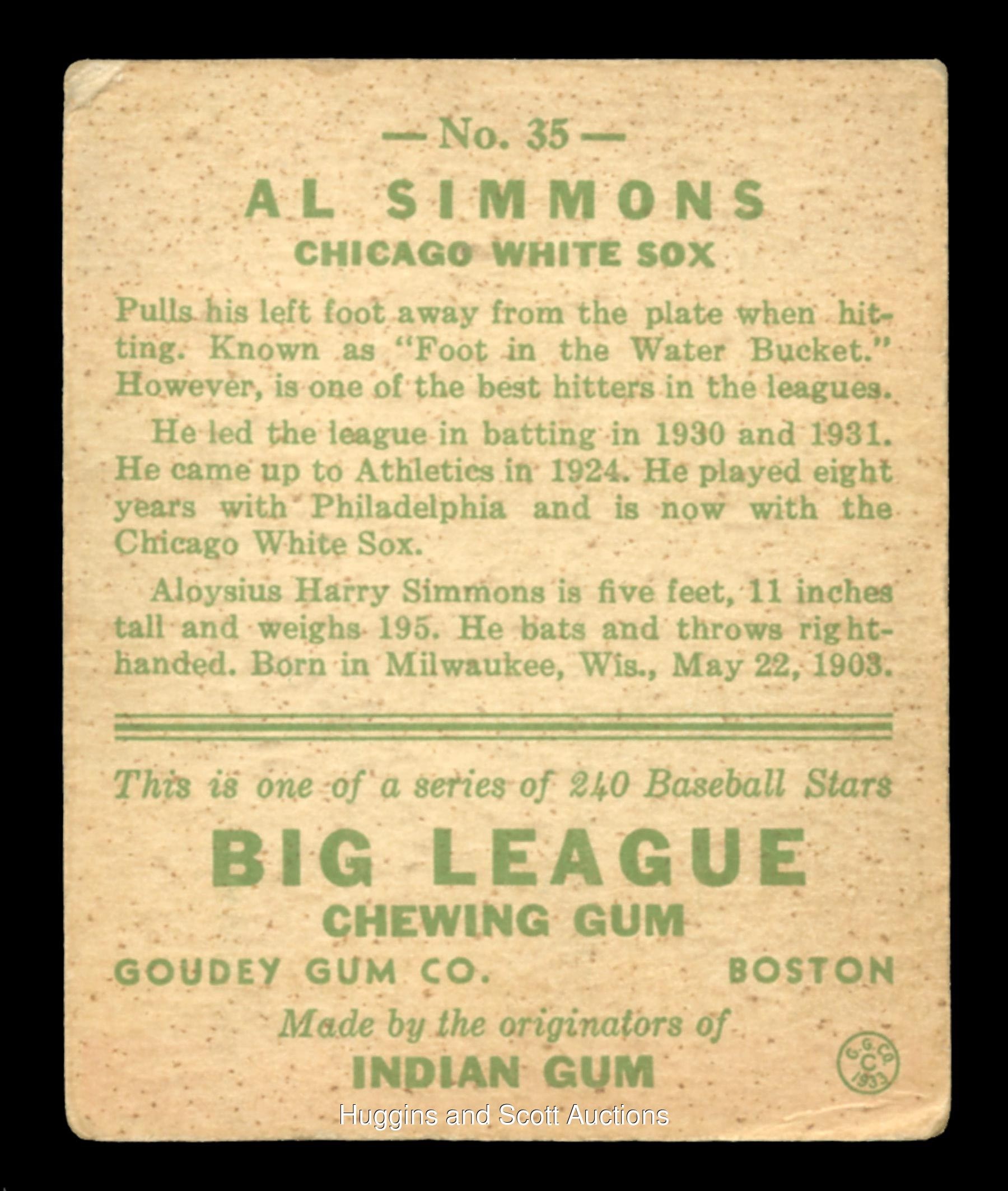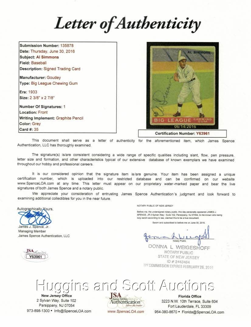 1933 Goudey #35 Al Simmons Signed Card - Full JSA LOA