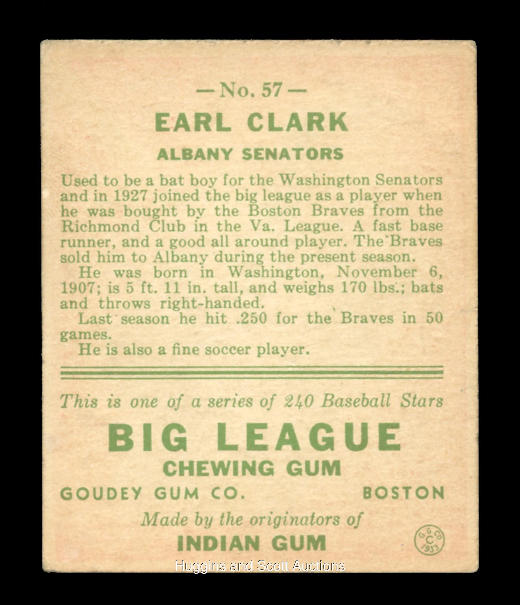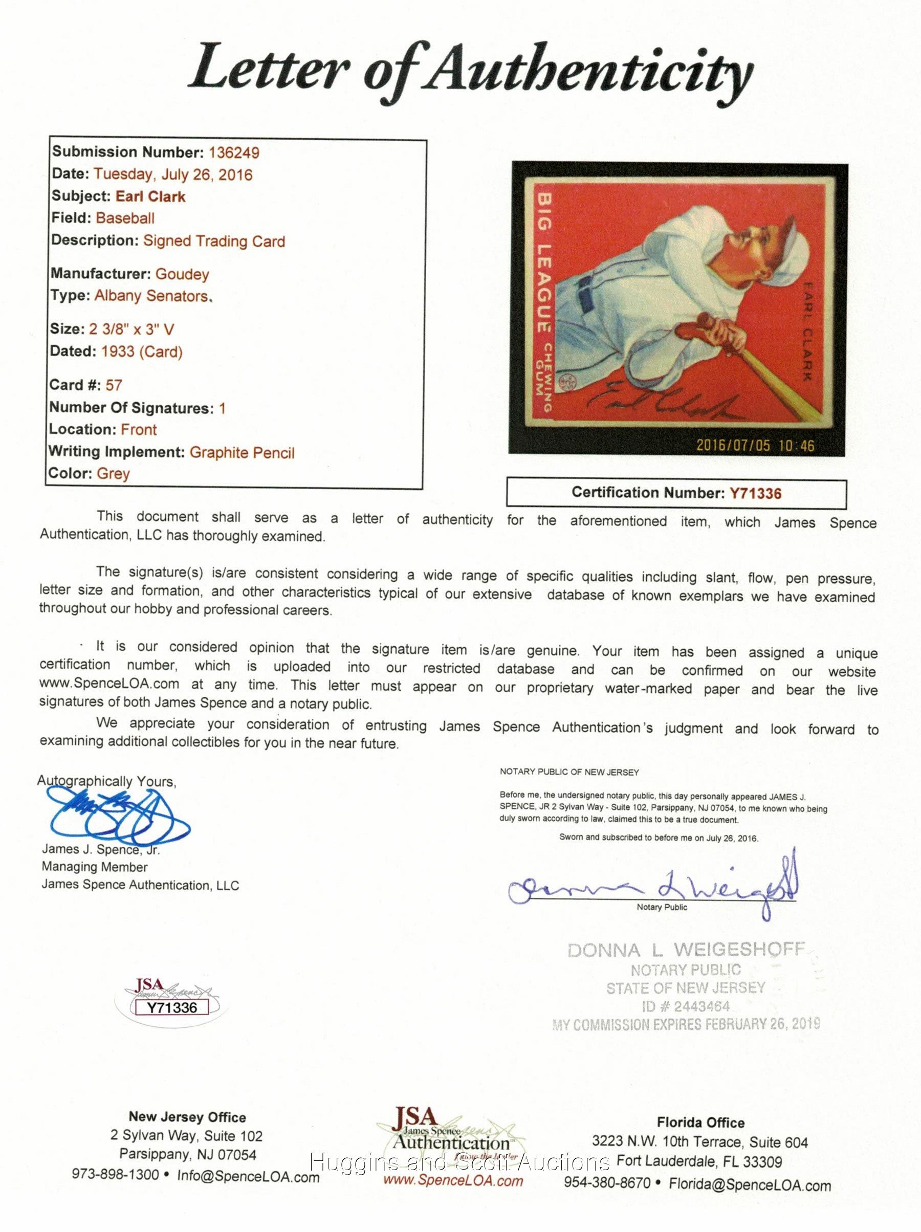Signature: "8-9" Medium: P Card: VG-EX Notes: The "Holy Grail" of "33 Goudey signed cards. Deceased January 1938 in car crash at just 30 years old, leaving only a very short window of time for autographs. First example ever offered at auction. Previously undocumented. Full LOA from JSA.