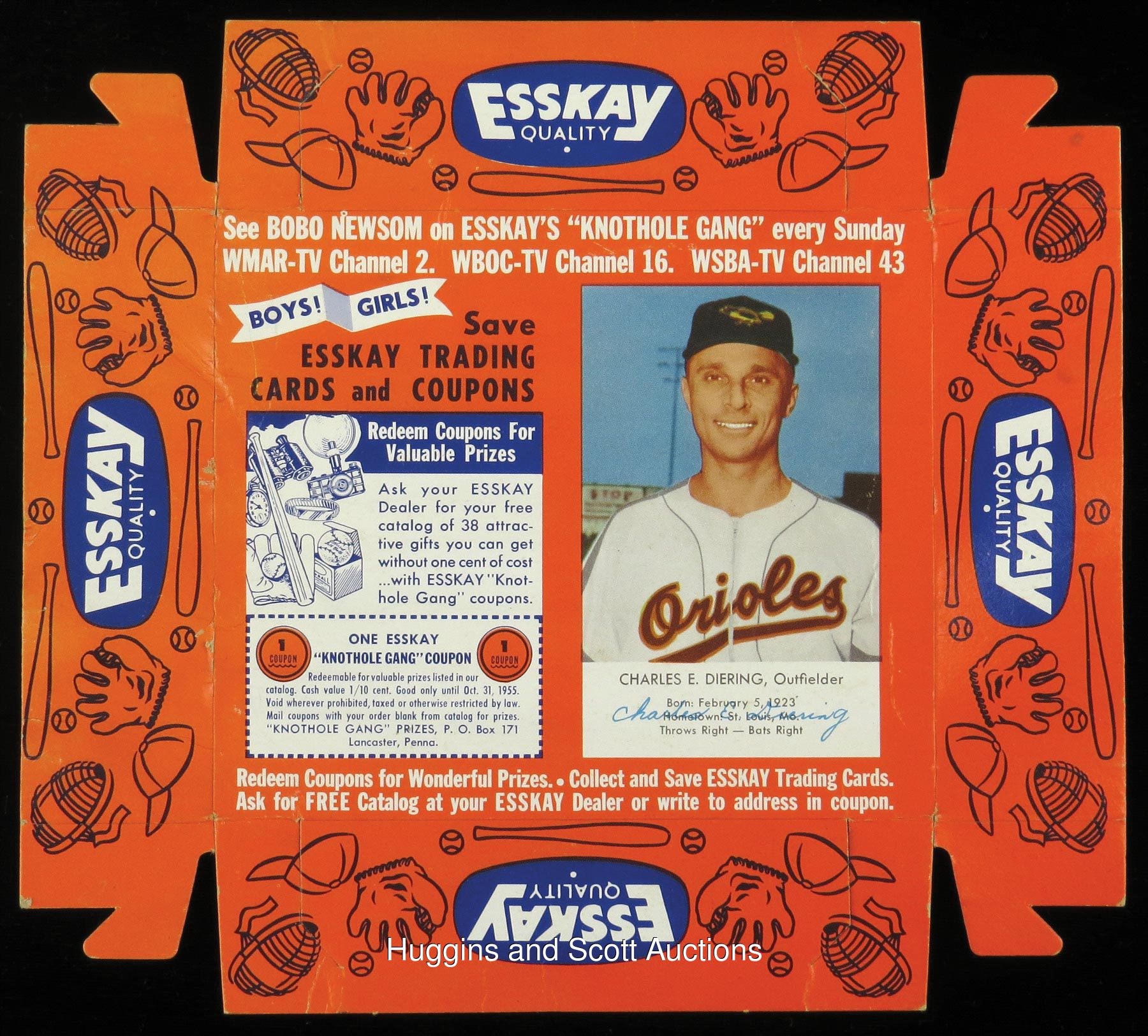 Extraordinary 1955 Esskay Meats Chuck Diering complete box! The portrait of the inaugural Oriole is framed by a “Knothole Gang” coupon, vibrant advertising text and an ornate baseball equipment design scheme. Moderate creasing traces vertically through the right perimeter of the card while additional wrinkling is scattered along the left portion of the collectible. All four tabs are tightly attached to the container and crease-free. Minimal cardboard bowing and even hot dog meat impressions do not disrupt the overall appearance of this survivor.