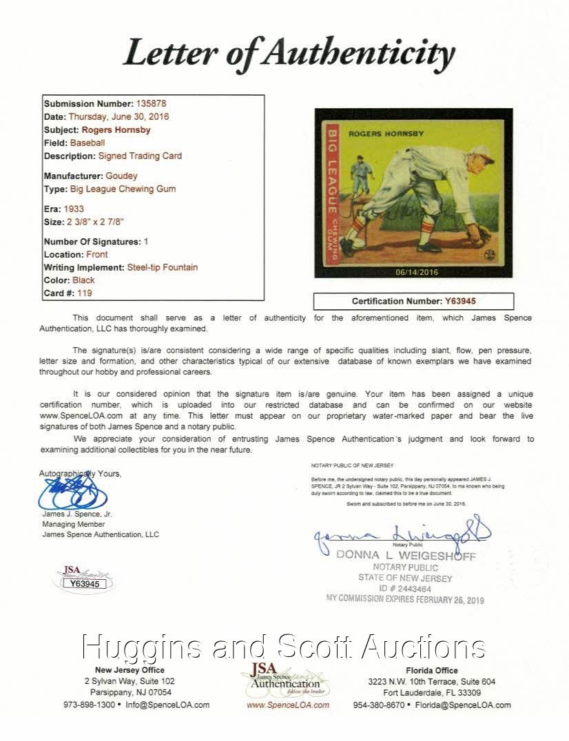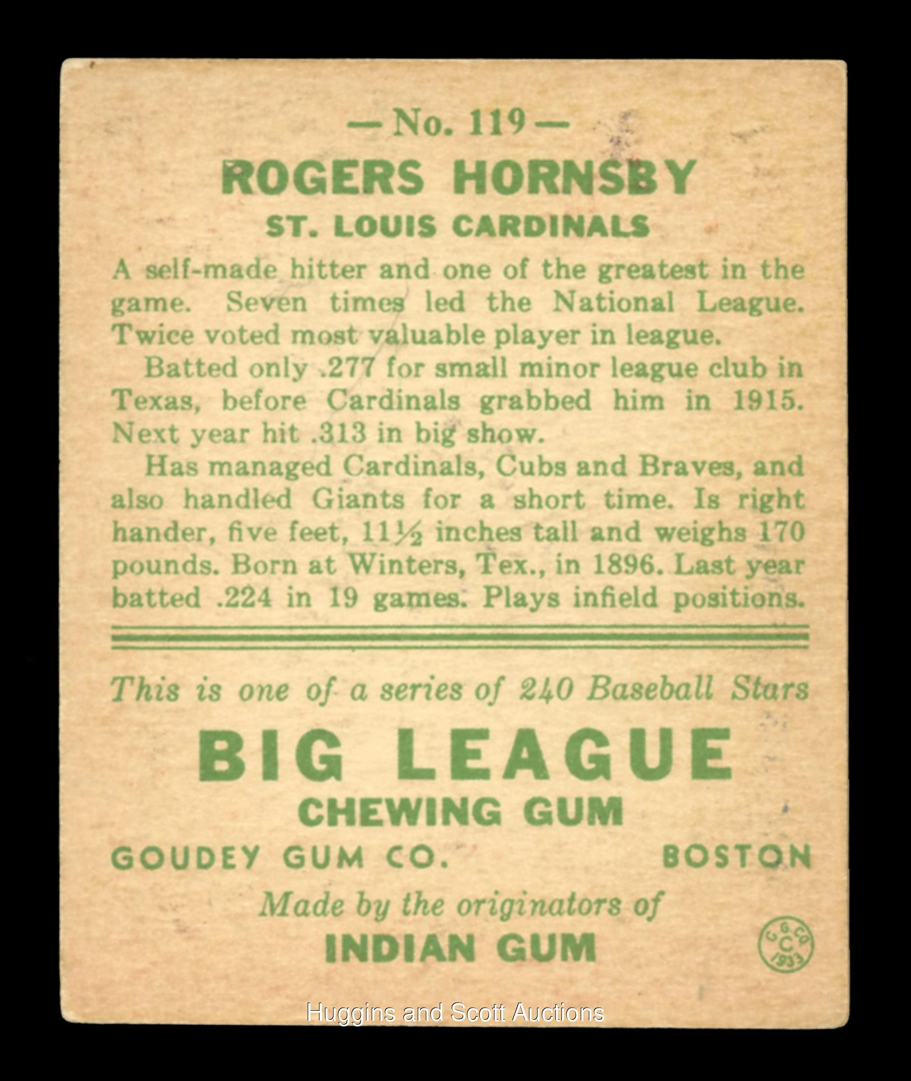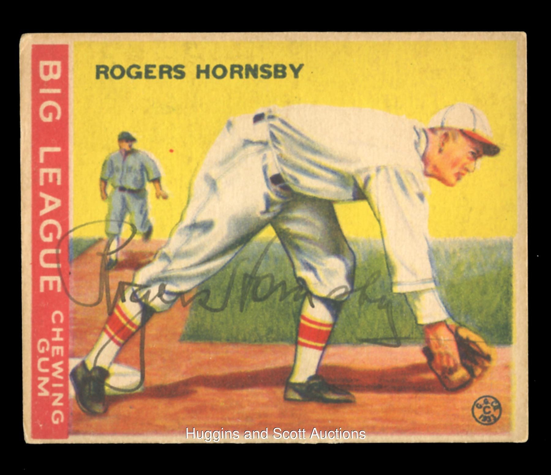 Signature: "7" Medium: FP Card: VG-EX Notes: First example ever offered at auction. To put the rarity and value into perspective, our recent May auction saw a signed copy of the "33 Goudey set"s other Hornsby card, #188, sell for over $7,000—despite a double-stroked "R."