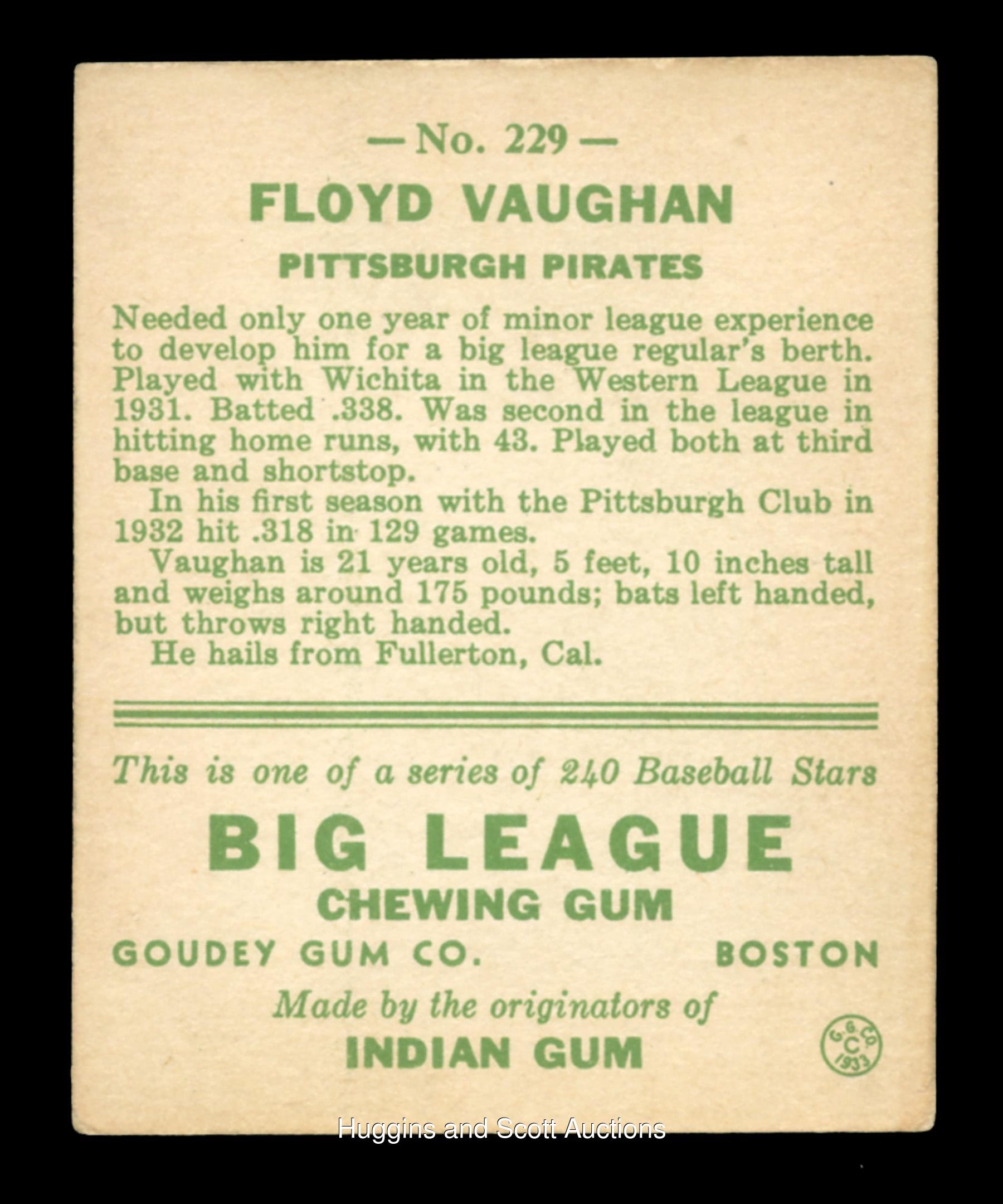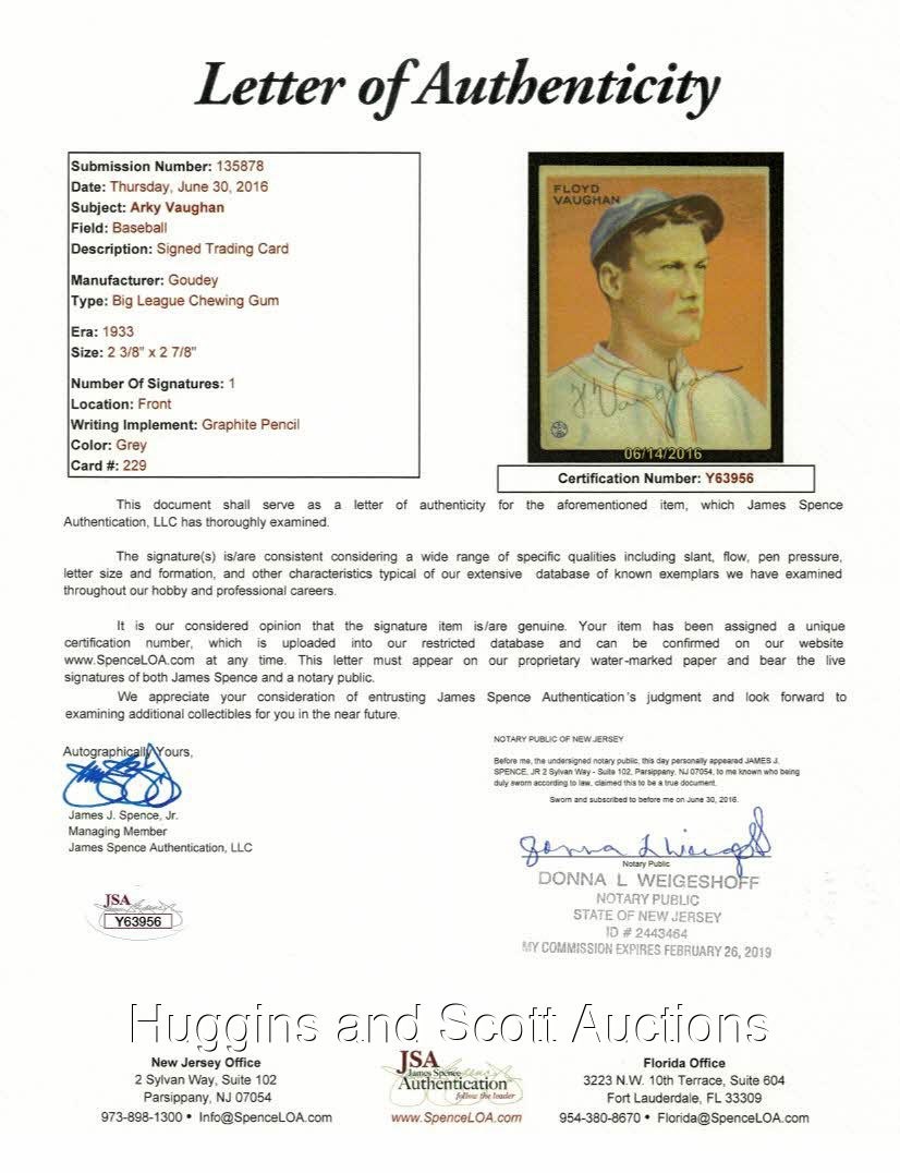 1933 Goudey #229 Arky Vaughan Signed Card - Full JSA LOA