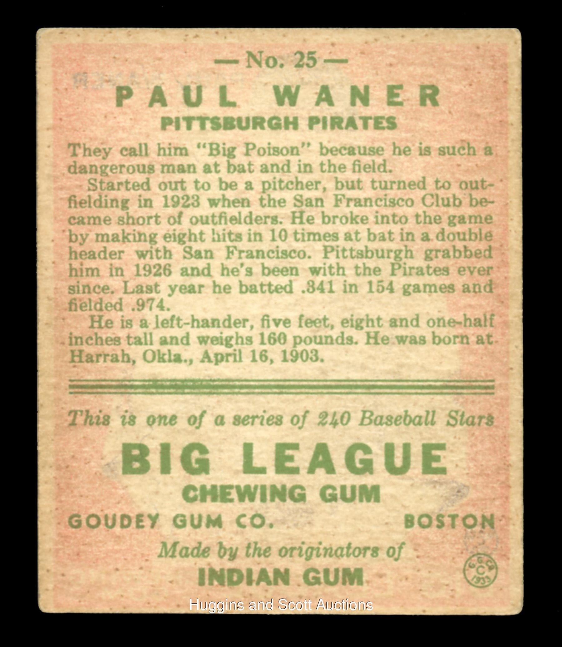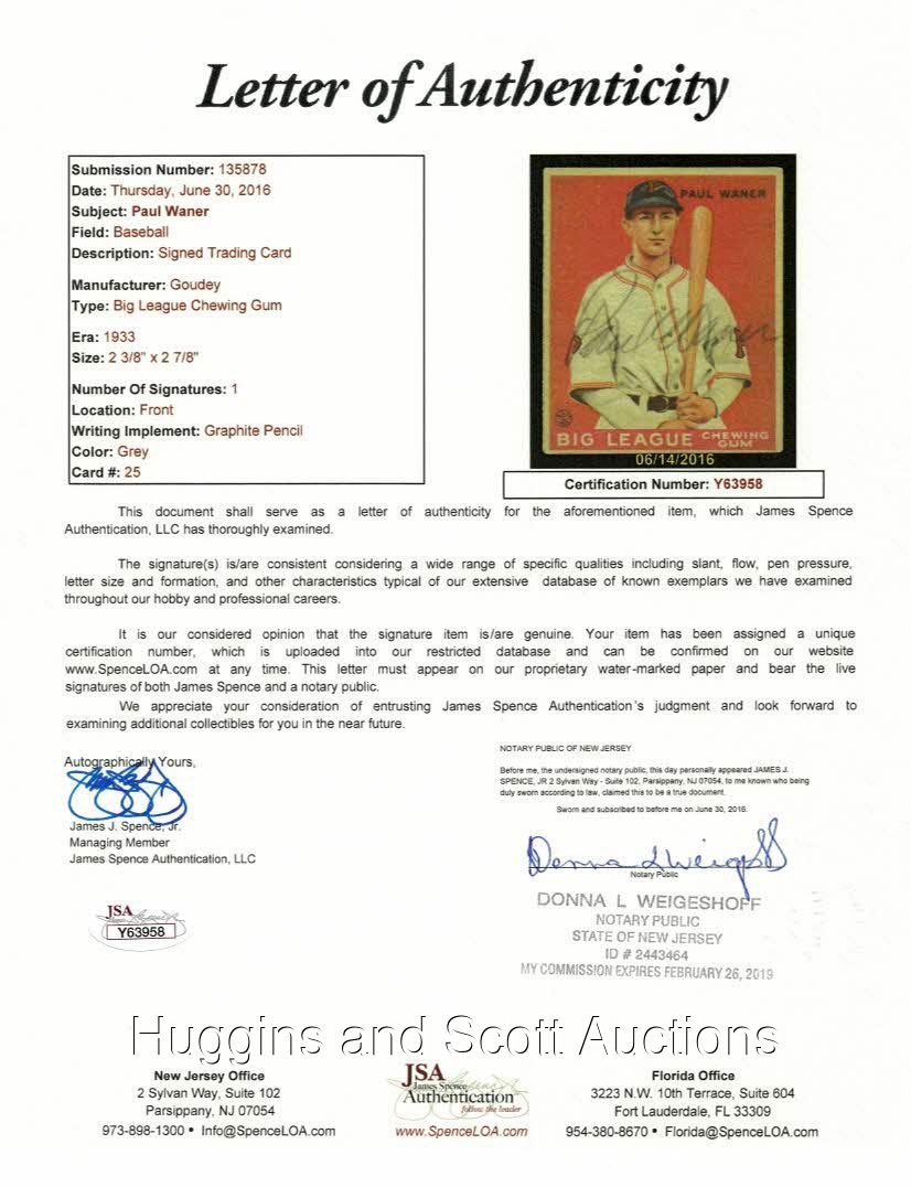 1933 Goudey #25 Paul Waner Signed Card - Full JSA LOA