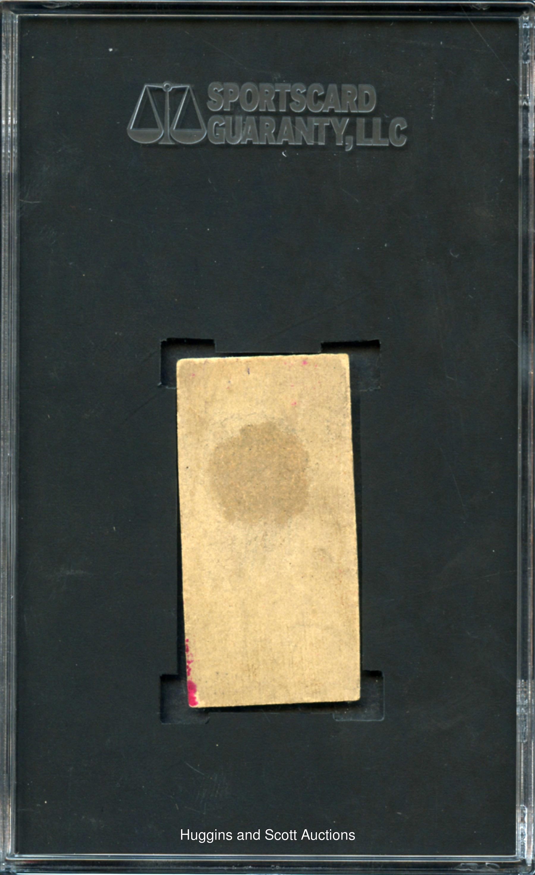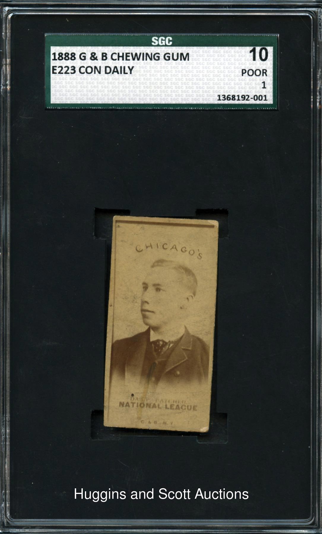 Nineteenth Century Type Card! Produced by Green and Blackwell of New York City, the 1888 E223 G&B Chewing Gum designation holds the distinction of being the first true baseball gum issue in trading card history. The diminutive series is extremely scarce and features multiple sepia images that were also released with the 1887 Four Base Hits and 1888 N403 Yum Yum Tobacco issues. A total of 117 copies of all subjects have been judged by either PSA or SGC. Graded 10 Poor 1 by SGC, this Con Daily portrait was just uncovered by our Maryland-based consignor. The clear portrait of the dapper Chicago backstop presents remarkably well with only a dab of reverse residue and coloring along the bottom left edge accounting for the assessment. It should be noted that the reverse coloring does not protrude the surface. One of only three graded by SGC and none by PSA.