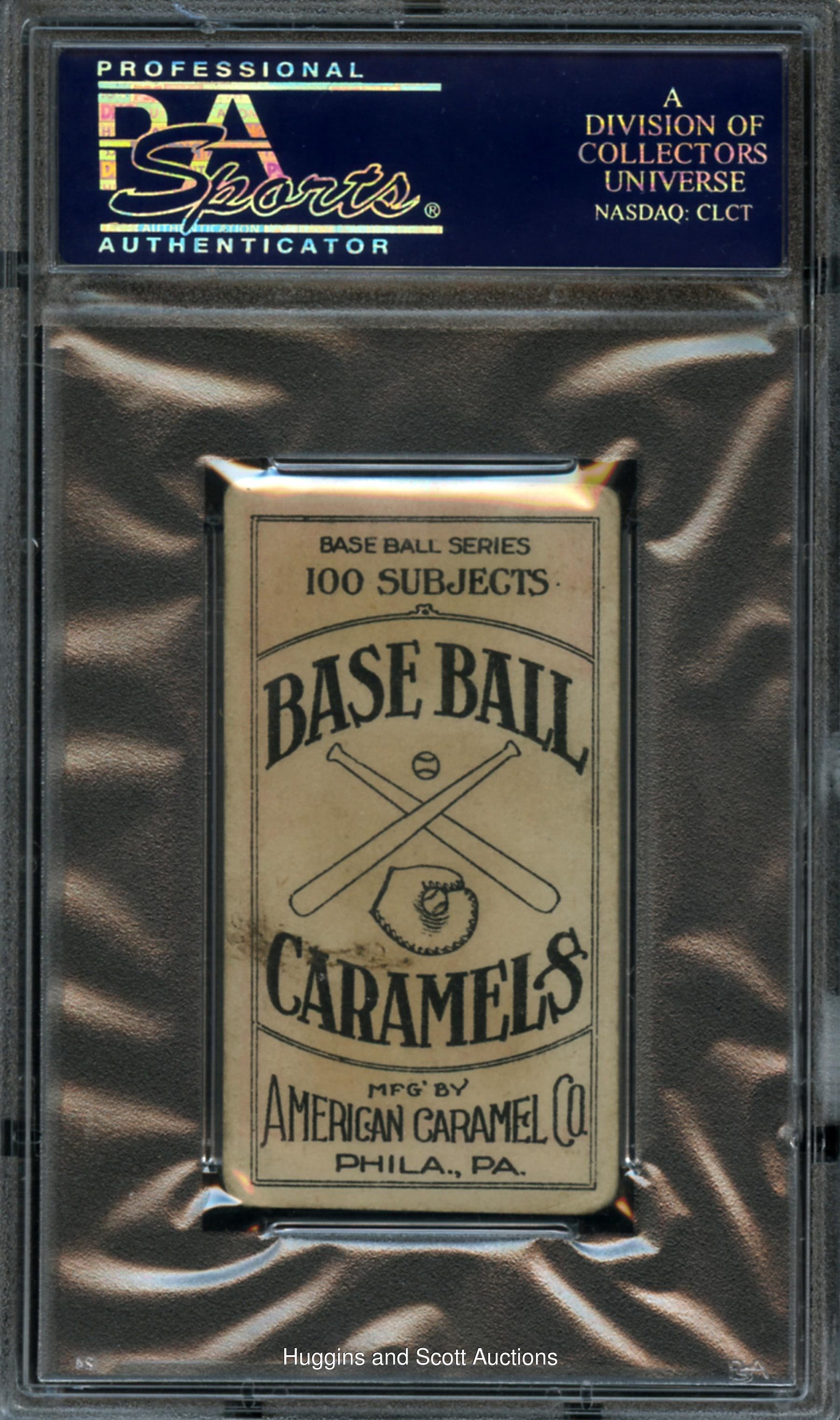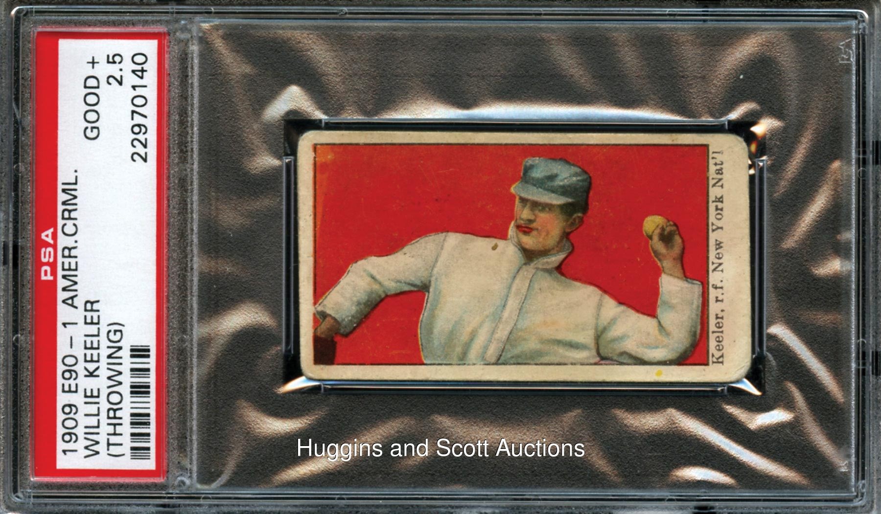 Horizontal 1909 E90-1 American Caramel Willie Keeler (Throwing) pose. Graded Good+ 2.5 by PSA. This illustration of the curator of the "Baltimore Chop" presents nicely with a crease-free surface and evenly rounded corners with only slight layering. Displays blistering colors and intricately crafted uniform detailing.