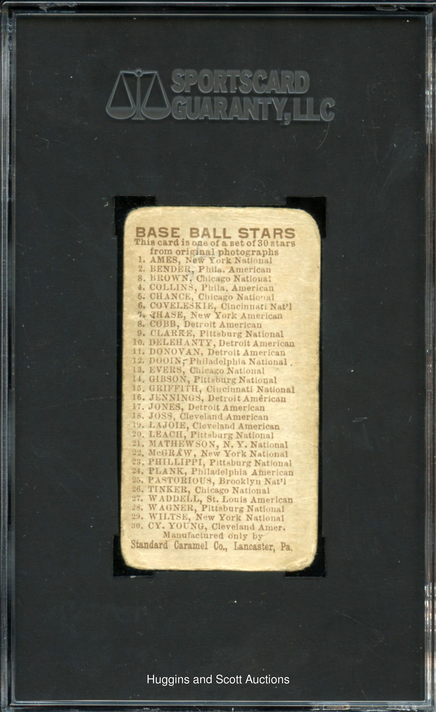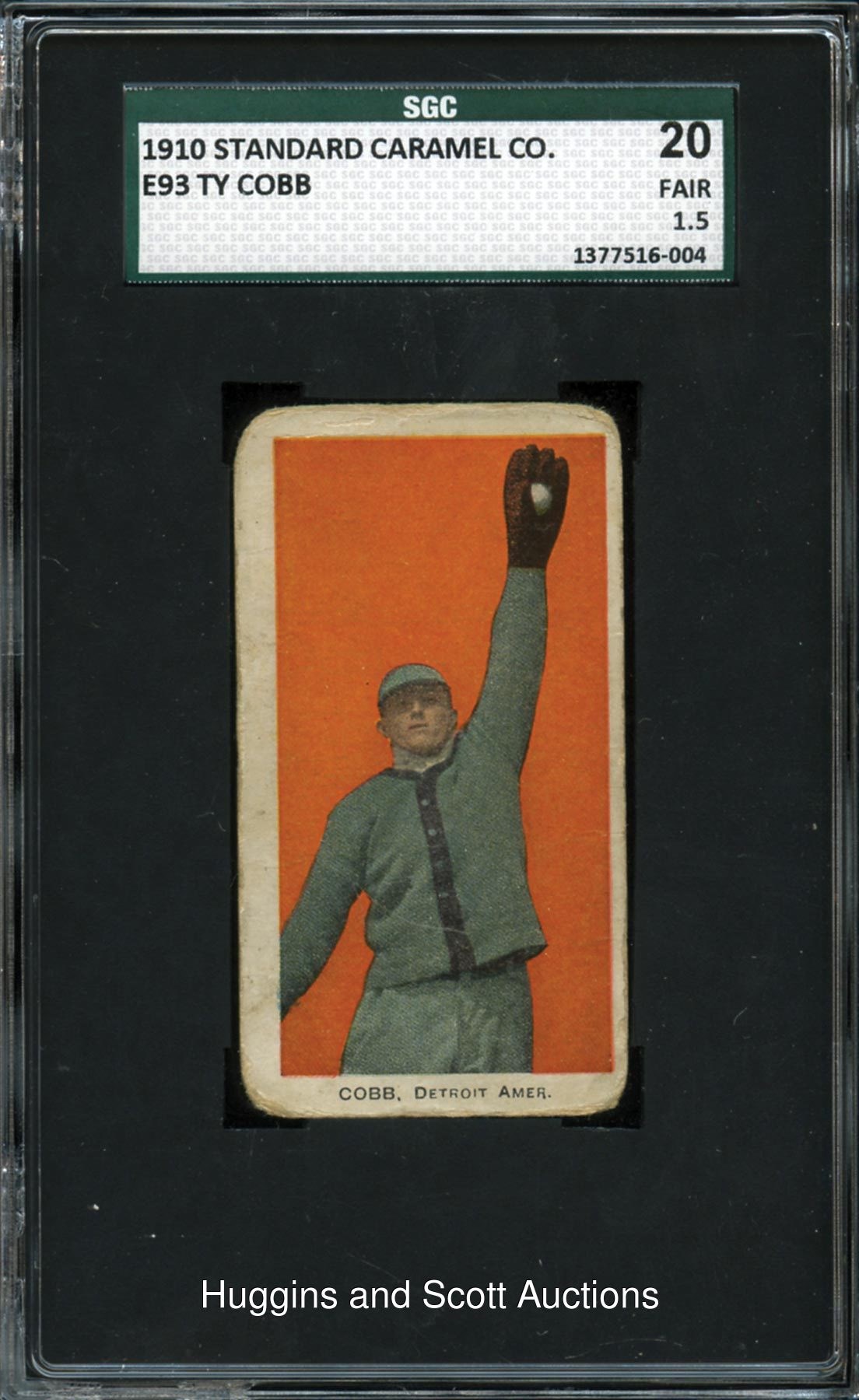 Graded 20 Fair 1.5 by SGC. Produced by Standard Caramel of Lancaster, Pennsylvania, the regional 1910 E93 designation features a staggering lineup of 18 Hall of Famers among its 30-card checklist. Leading the way among these diamond immortals is the offered Ty Cobb featuring the Class of 1936 inductee reaching high above his head to snag a ball. Despite a combination of perimeter wear and interior creasing, the overall presentation of this 106 year-old artifact is not compromised. Additionally, the brown checklist reverse is entirely unmarked.