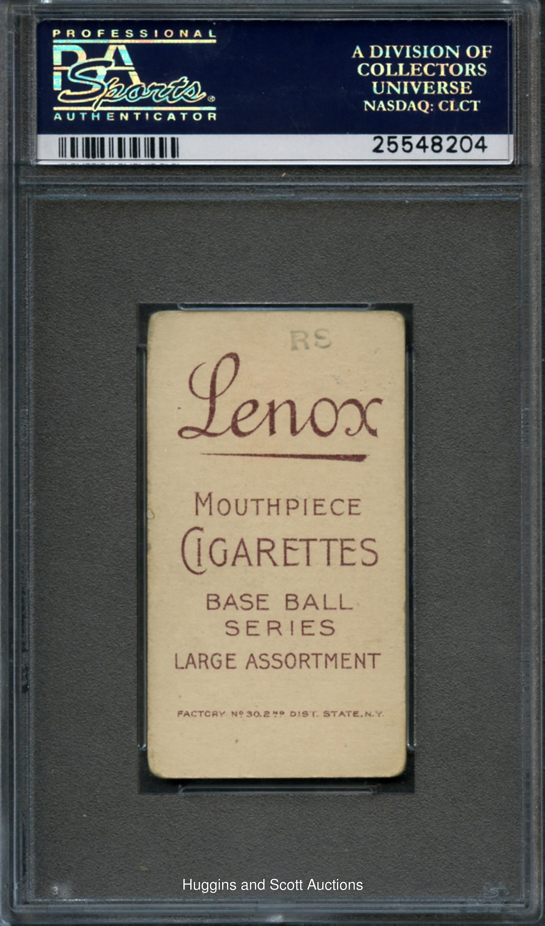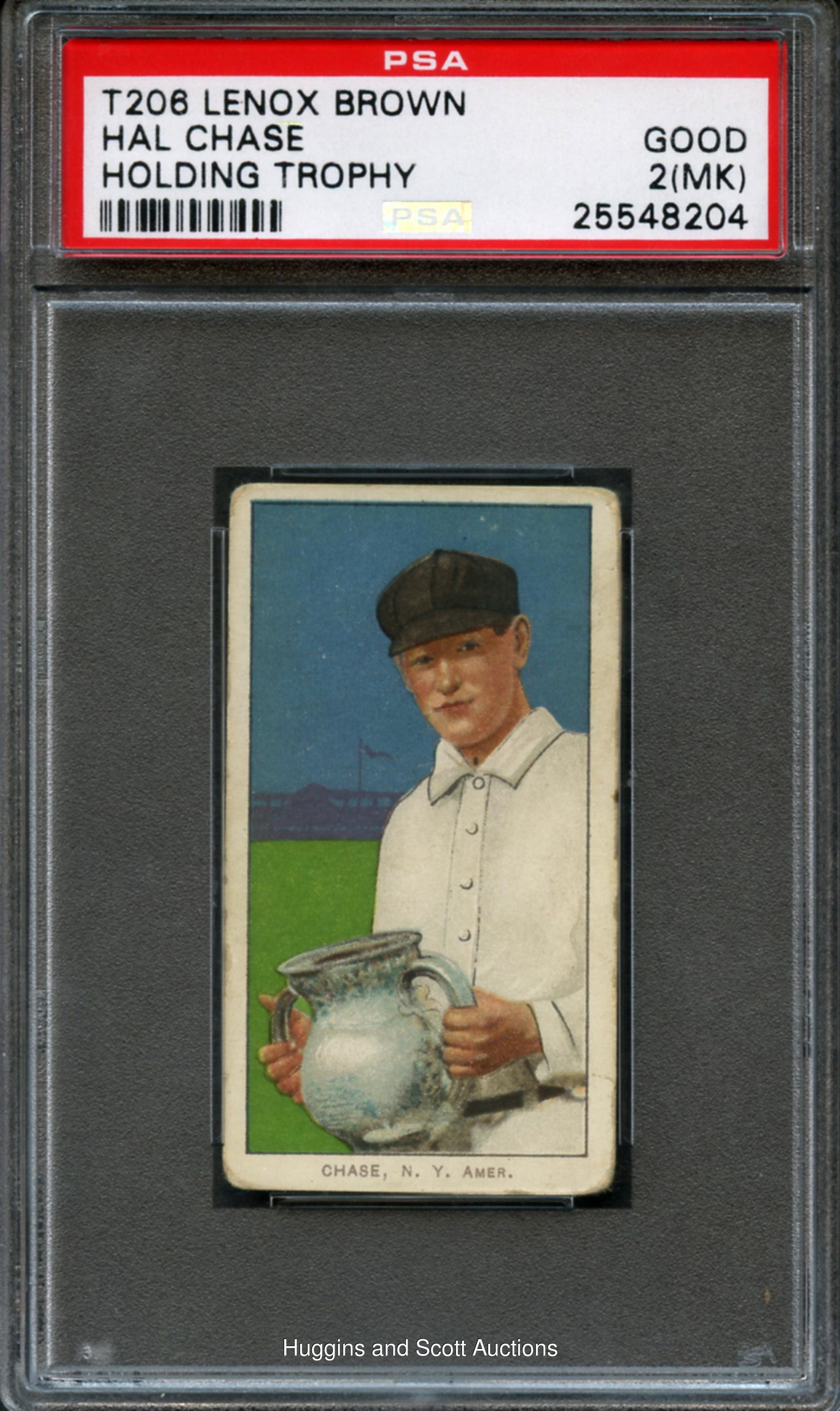 An extraordinary rarity has surfaced with the offered 1909-11 T206 White Borders Hal Chase (Holding Trophy) with a Brown Lenox advertising back! Graded Good 2 by PSA with a (mk) qualifier due to an ownership stamp placed near the upper edge of the reverse. Only a handful of Brown Lenox reverses have surfaced in the collecting hobby and even fewer have been made available for public sale. While SGC makes no distinction between text colors in Lenox brand population reports (PSA has graded a total of 13), we can confidently declare that the offered example is the first graded of the player/pose combination and the only offered on the secondary market. This stunning representation of “Prince Hal” depicts the controversial pre-war star posing with a silver trophy. The illustration of the confident Californian is crease-free with only moderate corner and edge wear. The uniform detailing and stadium backdrop exhibits rich color details and striking contrast. Most importantly, the coveted back’s text is clearly distinguishable from its brand parallel. The black “RS” stamp is faint but does not distract from the overall presentation. According to the authoritative T206Resource.com website, the Brown Lenox reverse is currently ranked third in overall scarcity.