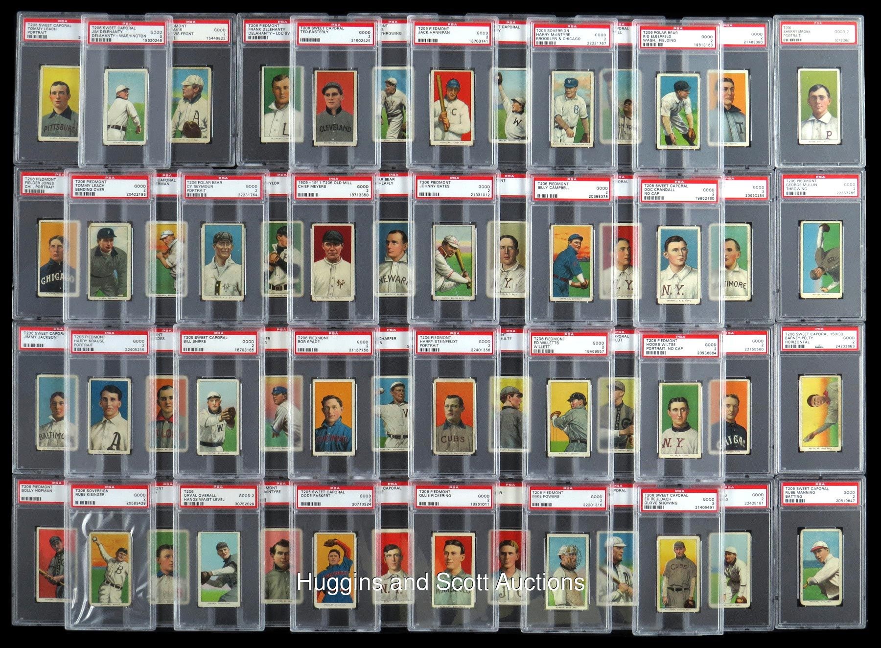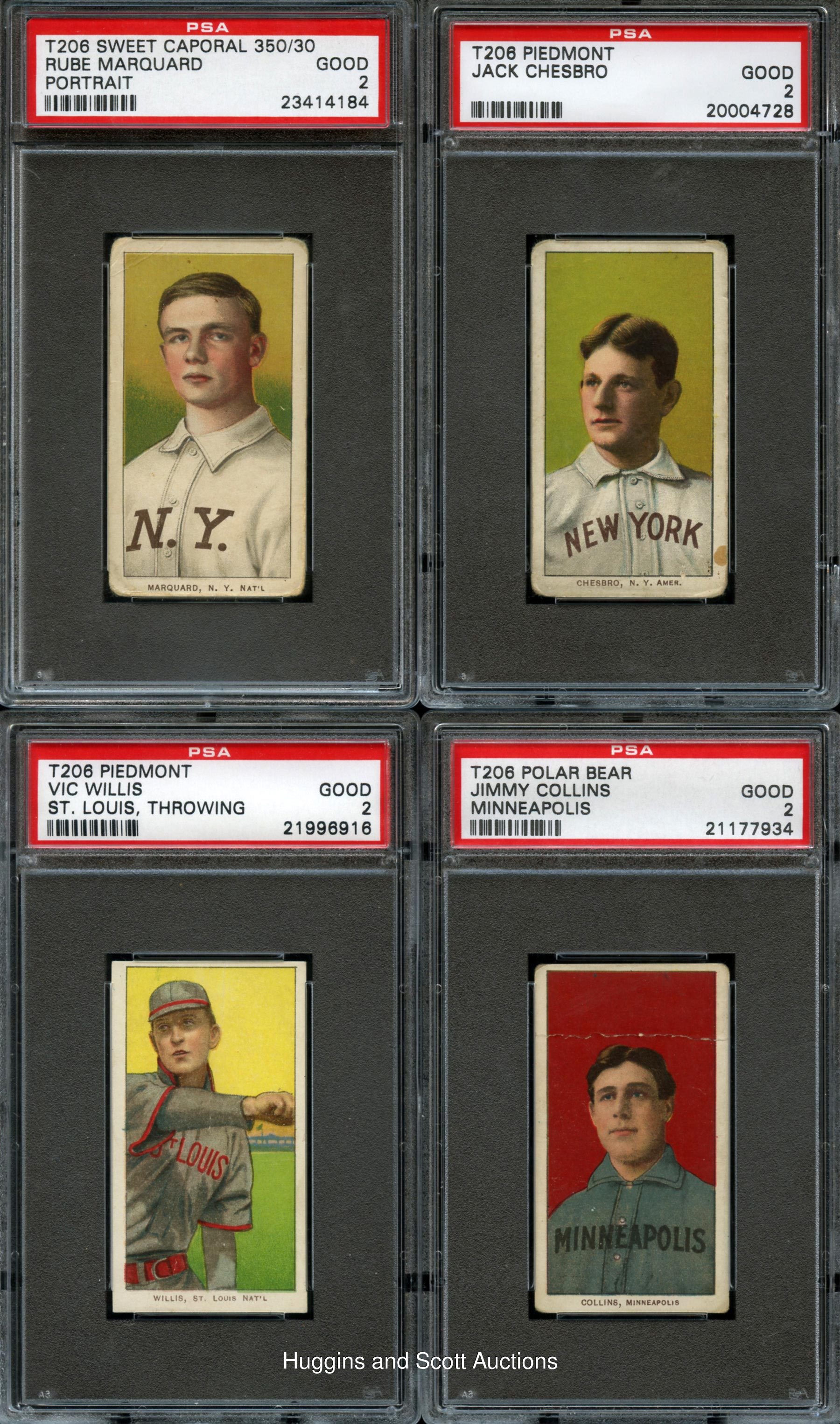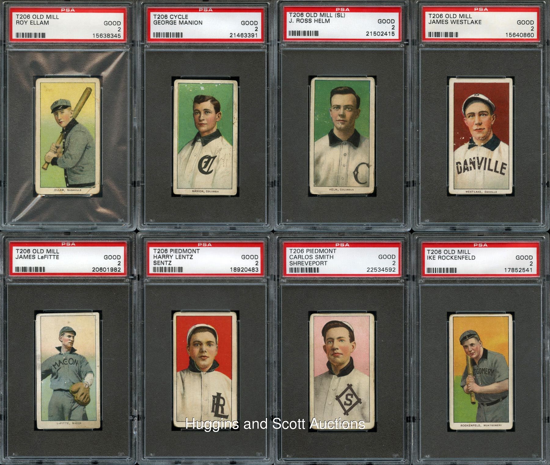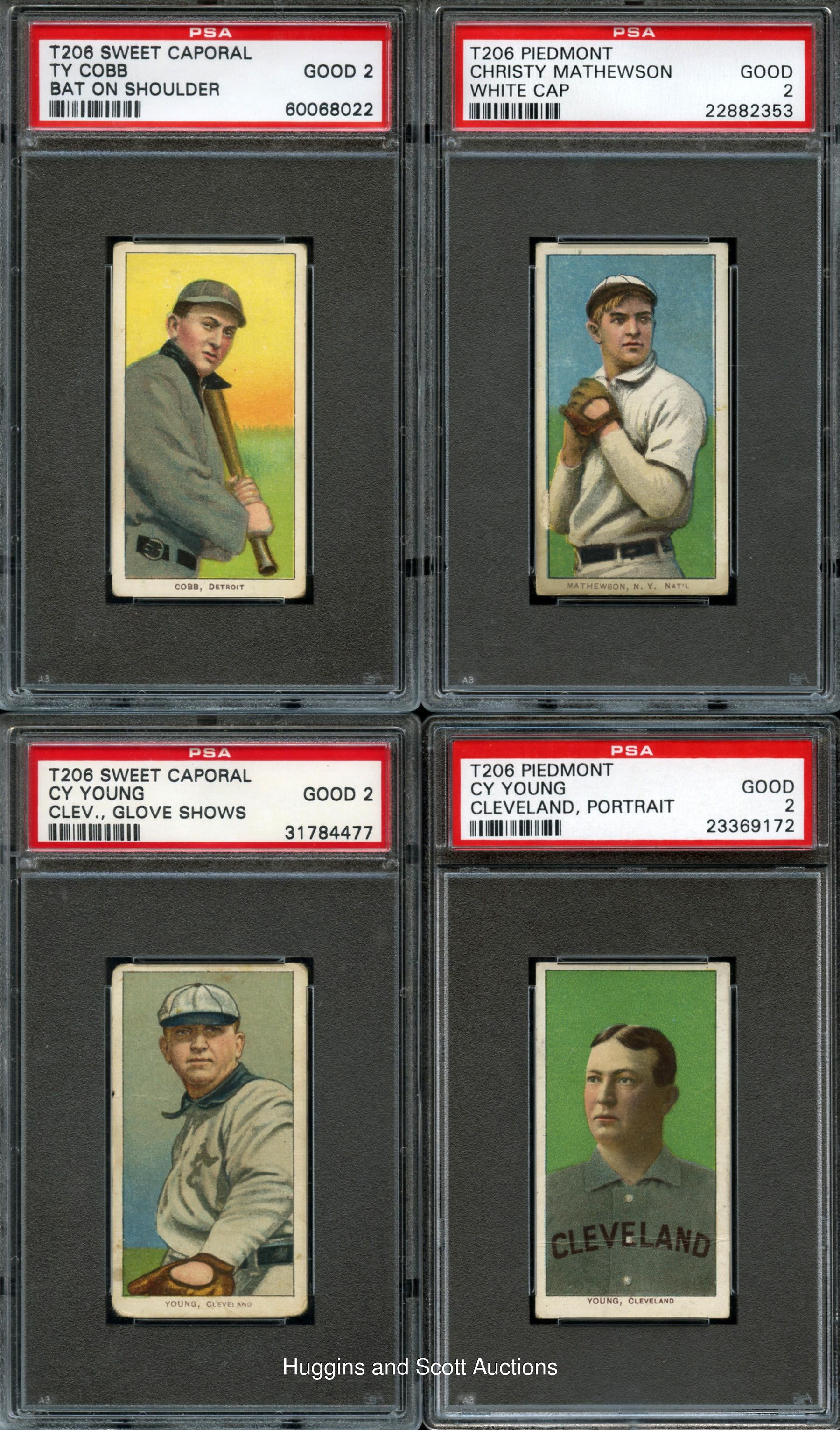 Explosive 1909-11 T206 White Border collection of (83) cards featuring (17) Hall of Famers and (8) Southern Leaguers! Each graded Good 2 by PSA with no qualifiers. The advertising back composition is as follows: (68) Piedmont/Sweet Caporal, (8) Old Mill, (5) Polar Bear and (2) Sovereign. Keys include: Hall of Famers: (17 cards, all common backs, unless noted) with Bresnahan (Portrait), M. Brown (Portrait), Chance (Batting), Chesbro, Cobb (Bat On Shoulder), J. Collins (Polar Bear), Evers (with Bat, Chicago on Shirt), Evers (with Bat, Cubs on Shirt), Evers (Portrait), Lajoie (Throwing), Marquard (Portrait), Mathewson (White Cap), Tinker (Hands on Knees), Waddell (Portrait), Willis (Throwing), C. Young (Glove Shows), C. Young (Portrait); Southern Leaguers: (8 cards, all Old Mill, unless noted) with Ellam, Helm, LaFitte, Lentz (Piedmont), Manion, Rockenfeld, C. Smith (Piedmont) and Westlake. Detailed description on website. Hall of Famers: (17 cards, all common backs, unless noted) with Bresnahan (Portrait), M. Brown (Portrait), Chance (Batting), Chesbro, Cobb (Bat On Shoulder), J. Collins (Polar Bear), Evers (with Bat, Chicago on Shirt), Evers (with Bat, Cubs on Shirt), Evers (Portrait), Lajoie (Throwing), Marquard (Portrait), Mathewson (White Cap), Tinker (Hands on Knees), Waddell (Portrait), Willis (Throwing), C. Young (Glove Shows), C. Young (Portrait); Southern Leaguers: (8 cards, all Old Mill, unless noted) with Ellam, Helm, LaFitte, Lentz (Piedmont), Manion, Rockenfeld, C. Smith (Piedmont), Westlake; Common Old Mill: (2 cards) with Abbott, Meyers; Common Polar Bear: (4 cards) with Elberfeld (Washington, Fielding), Schlafly, Seymour (Portrait), Taylor; Common Sovereign: (2 cards) with Kisinger (350 Subjects), McIntyre (Brooklyn & Chicago, 350 Subjects); Others: (50 cards) with Alperman, Ames (Portrait), Bates, Bridwell (Portrait, No Cap), Campbell, Cassidy, Chase (Blue Portrait), Chase (Holding Trophy), Chase (Pink Portrait), Crandall (Portrait, No Cap), Dahlen (Boston), H. Davis (No Initial), F. Delehanty, J. Delehanty, Doyle (Throwing), Easterly, Ganley, Hannifan, Hemphill, S. Hofman, Jackson, F. Jones (Portrait), Krause (Portrait), Leach (Bending Over), Leach (Portrait), Magee (Portrait), Manning (Batting), McIntyre (Detroit), Merkle (Portrait), Moeller, Murphy (Batting), Mullin (Throwing), Nicholls (Hands on Knees), Overall (Hands Waist Level), Paskert, Pelty (Horizontal), Pickering, Powers, Reulbach (Glove Showing), Rhodes, Rucker (Throwing), Schaefer (Washington), Schulte (Back View), Shipke, Spade, Steinfeldt (with Bat), Steinfeldt (Portrait), Sullivan, Willetts, Wiltse (Portrait, No Cap)