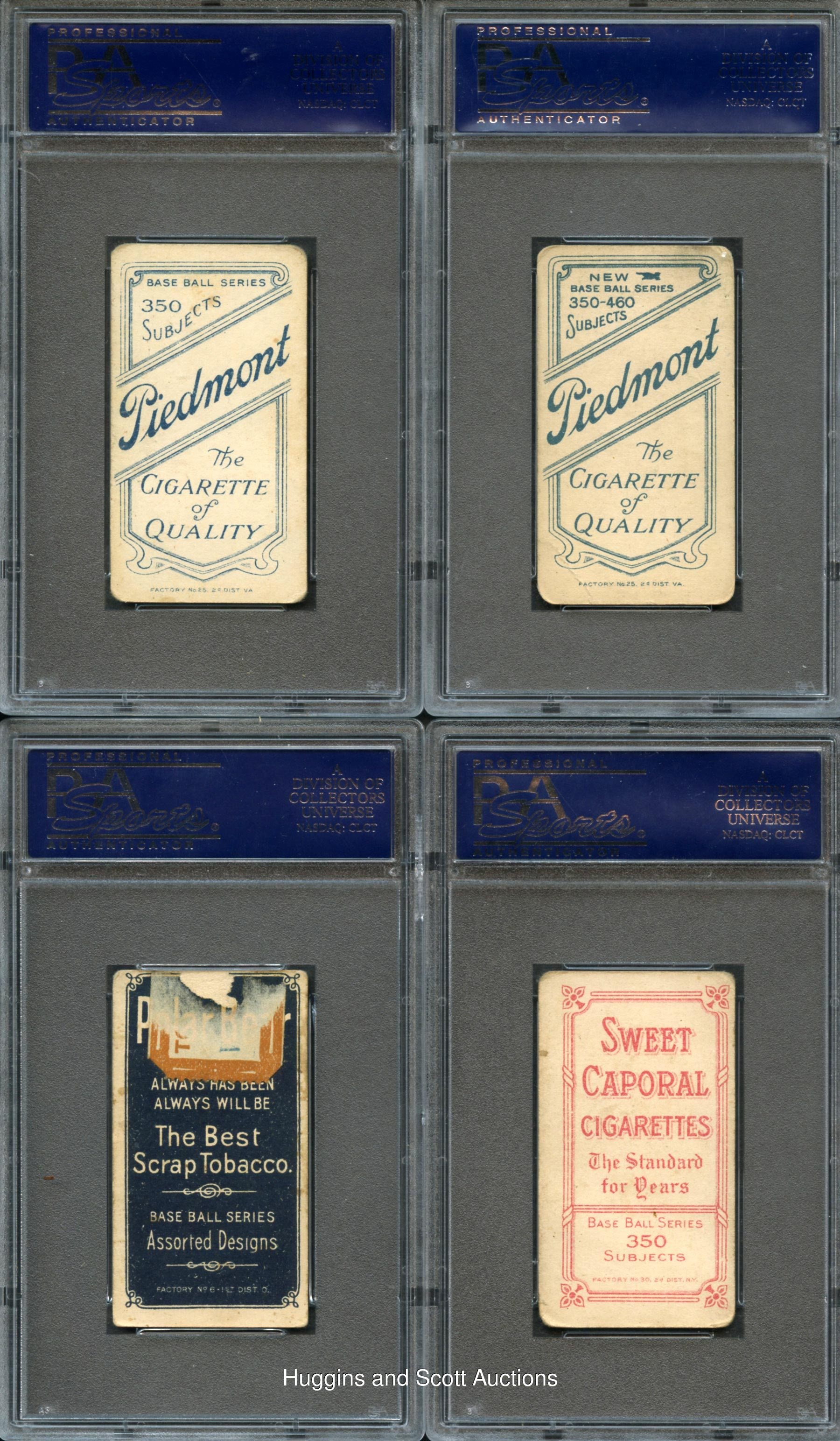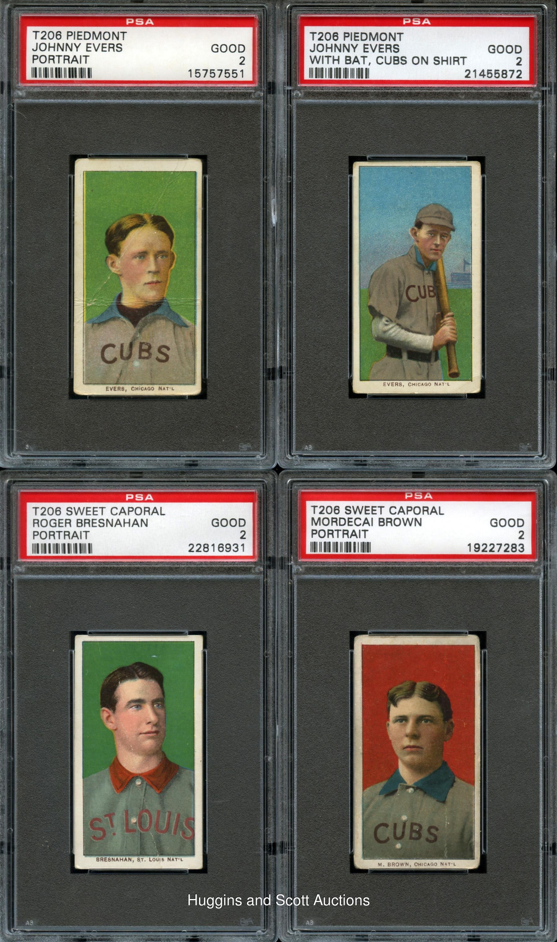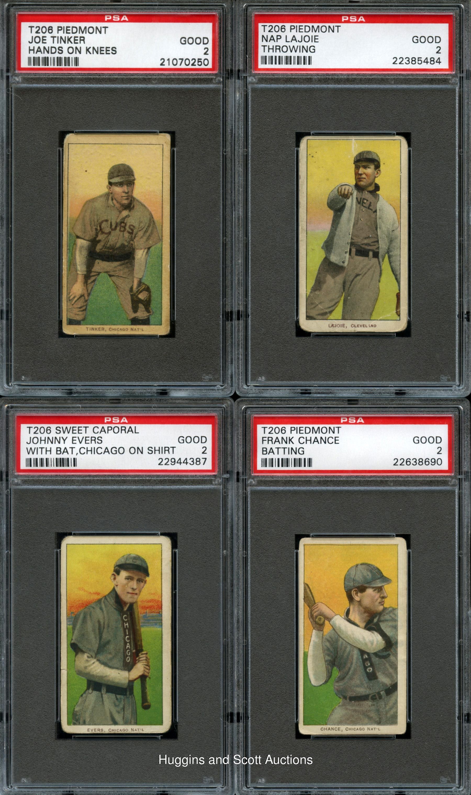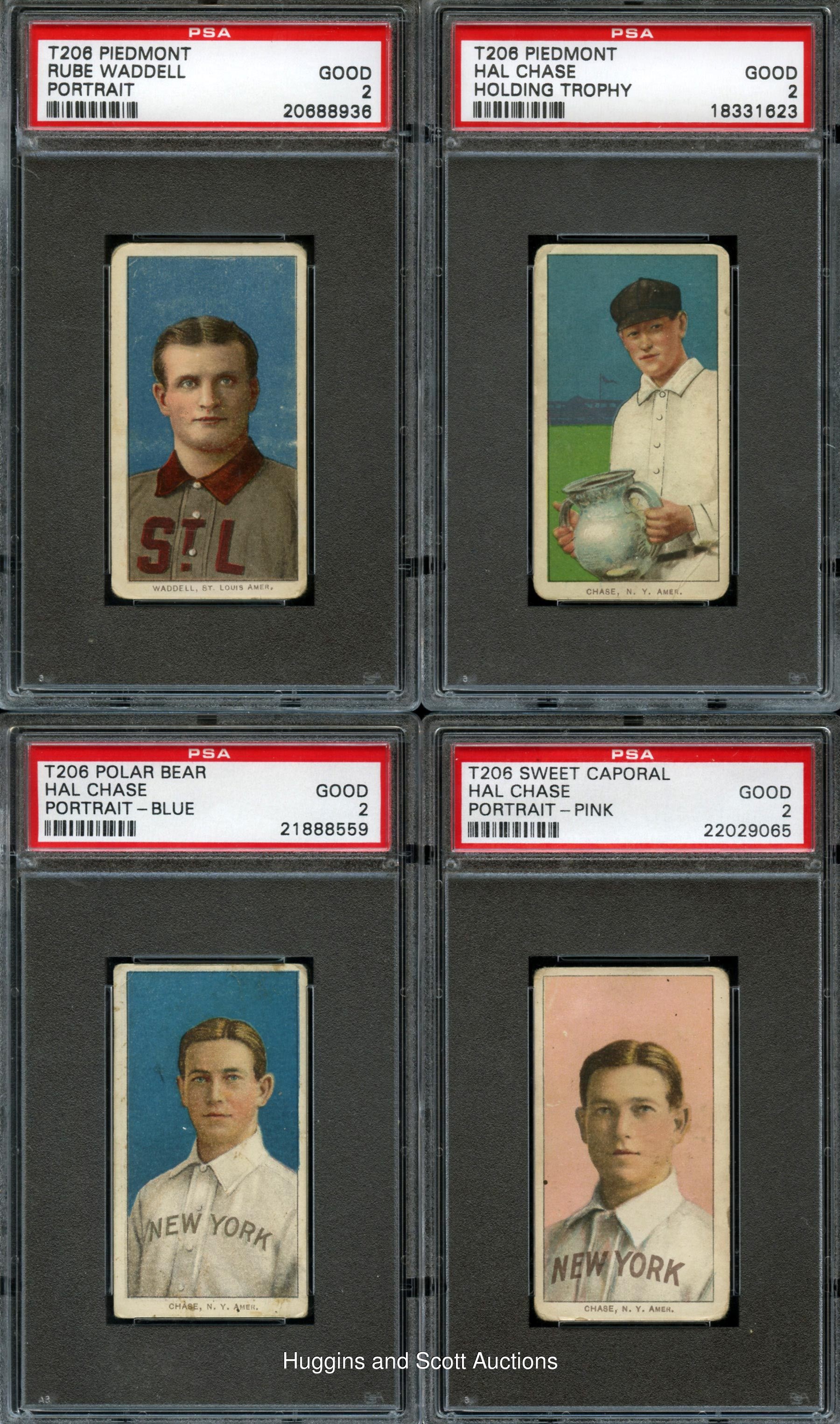Explosive 1909-11 T206 White Border collection of (83) cards featuring (17) Hall of Famers and (8) Southern Leaguers! Each graded Good 2 by PSA with no qualifiers. The advertising back composition is as follows: (68) Piedmont/Sweet Caporal, (8) Old Mill, (5) Polar Bear and (2) Sovereign. Keys include: Hall of Famers: (17 cards, all common backs, unless noted) with Bresnahan (Portrait), M. Brown (Portrait), Chance (Batting), Chesbro, Cobb (Bat On Shoulder), J. Collins (Polar Bear), Evers (with Bat, Chicago on Shirt), Evers (with Bat, Cubs on Shirt), Evers (Portrait), Lajoie (Throwing), Marquard (Portrait), Mathewson (White Cap), Tinker (Hands on Knees), Waddell (Portrait), Willis (Throwing), C. Young (Glove Shows), C. Young (Portrait); Southern Leaguers: (8 cards, all Old Mill, unless noted) with Ellam, Helm, LaFitte, Lentz (Piedmont), Manion, Rockenfeld, C. Smith (Piedmont) and Westlake. Detailed description on website. Hall of Famers: (17 cards, all common backs, unless noted) with Bresnahan (Portrait), M. Brown (Portrait), Chance (Batting), Chesbro, Cobb (Bat On Shoulder), J. Collins (Polar Bear), Evers (with Bat, Chicago on Shirt), Evers (with Bat, Cubs on Shirt), Evers (Portrait), Lajoie (Throwing), Marquard (Portrait), Mathewson (White Cap), Tinker (Hands on Knees), Waddell (Portrait), Willis (Throwing), C. Young (Glove Shows), C. Young (Portrait); Southern Leaguers: (8 cards, all Old Mill, unless noted) with Ellam, Helm, LaFitte, Lentz (Piedmont), Manion, Rockenfeld, C. Smith (Piedmont), Westlake; Common Old Mill: (2 cards) with Abbott, Meyers; Common Polar Bear: (4 cards) with Elberfeld (Washington, Fielding), Schlafly, Seymour (Portrait), Taylor; Common Sovereign: (2 cards) with Kisinger (350 Subjects), McIntyre (Brooklyn & Chicago, 350 Subjects); Others: (50 cards) with Alperman, Ames (Portrait), Bates, Bridwell (Portrait, No Cap), Campbell, Cassidy, Chase (Blue Portrait), Chase (Holding Trophy), Chase (Pink Portrait), Crandall (Portrait, No Cap), Dahlen (Boston), H. Davis (No Initial), F. Delehanty, J. Delehanty, Doyle (Throwing), Easterly, Ganley, Hannifan, Hemphill, S. Hofman, Jackson, F. Jones (Portrait), Krause (Portrait), Leach (Bending Over), Leach (Portrait), Magee (Portrait), Manning (Batting), McIntyre (Detroit), Merkle (Portrait), Moeller, Murphy (Batting), Mullin (Throwing), Nicholls (Hands on Knees), Overall (Hands Waist Level), Paskert, Pelty (Horizontal), Pickering, Powers, Reulbach (Glove Showing), Rhodes, Rucker (Throwing), Schaefer (Washington), Schulte (Back View), Shipke, Spade, Steinfeldt (with Bat), Steinfeldt (Portrait), Sullivan, Willetts, Wiltse (Portrait, No Cap)