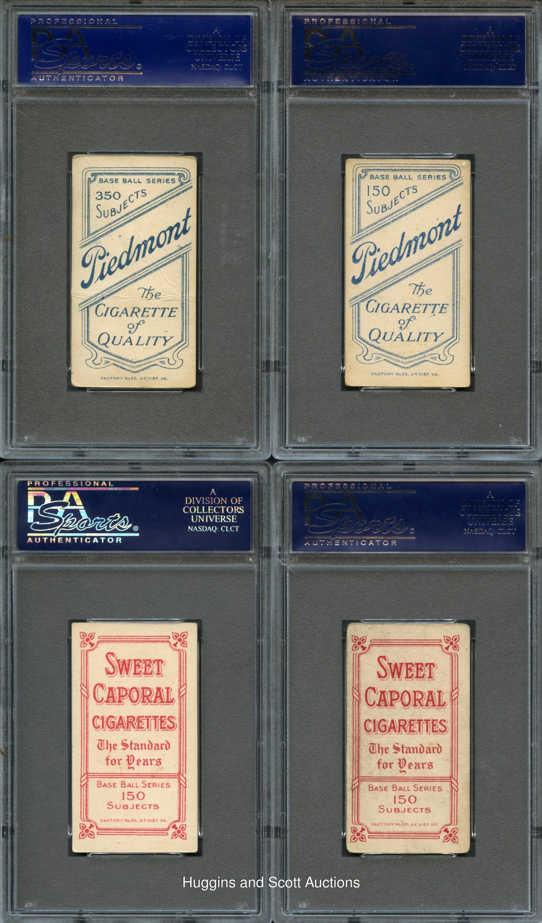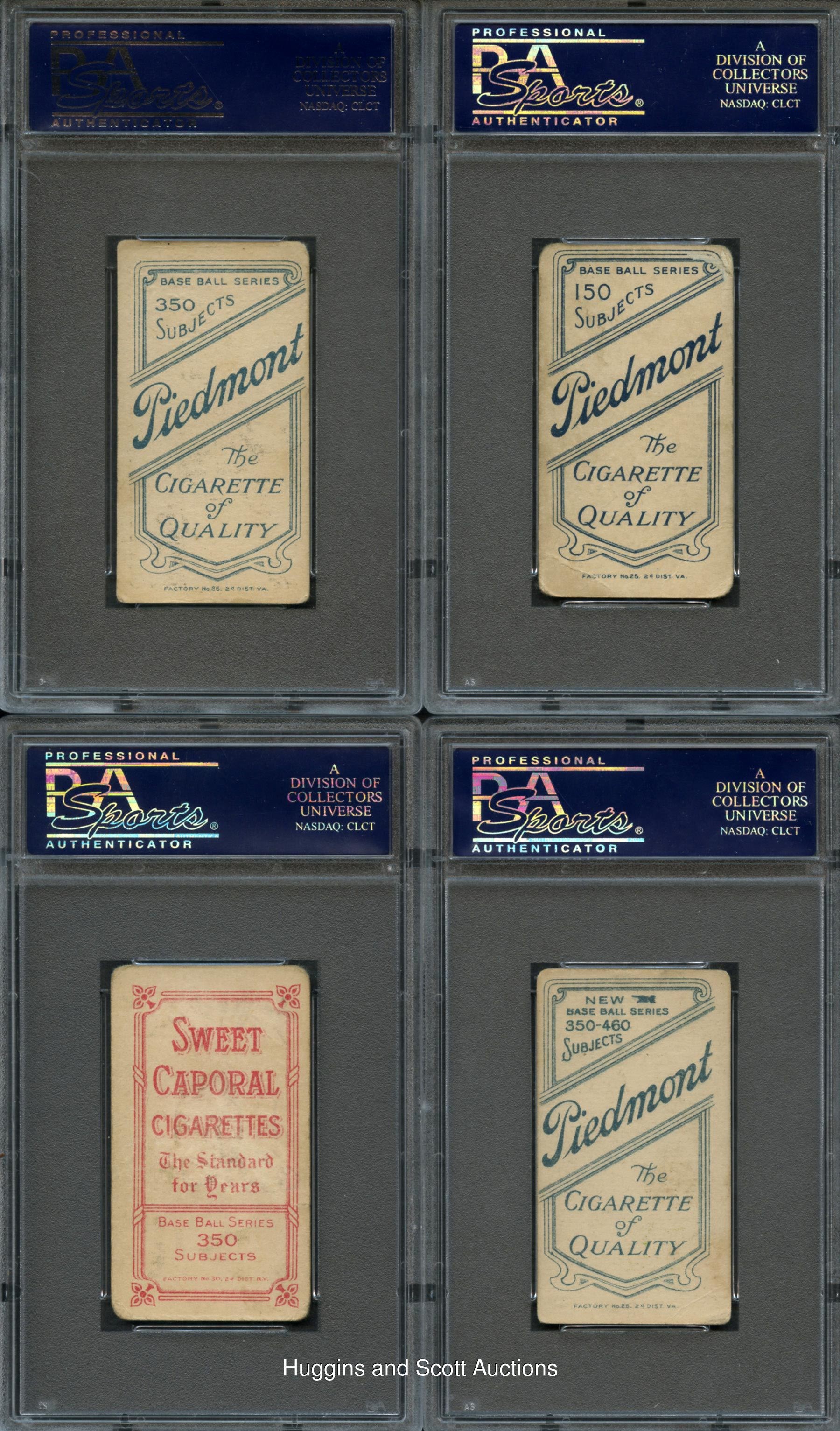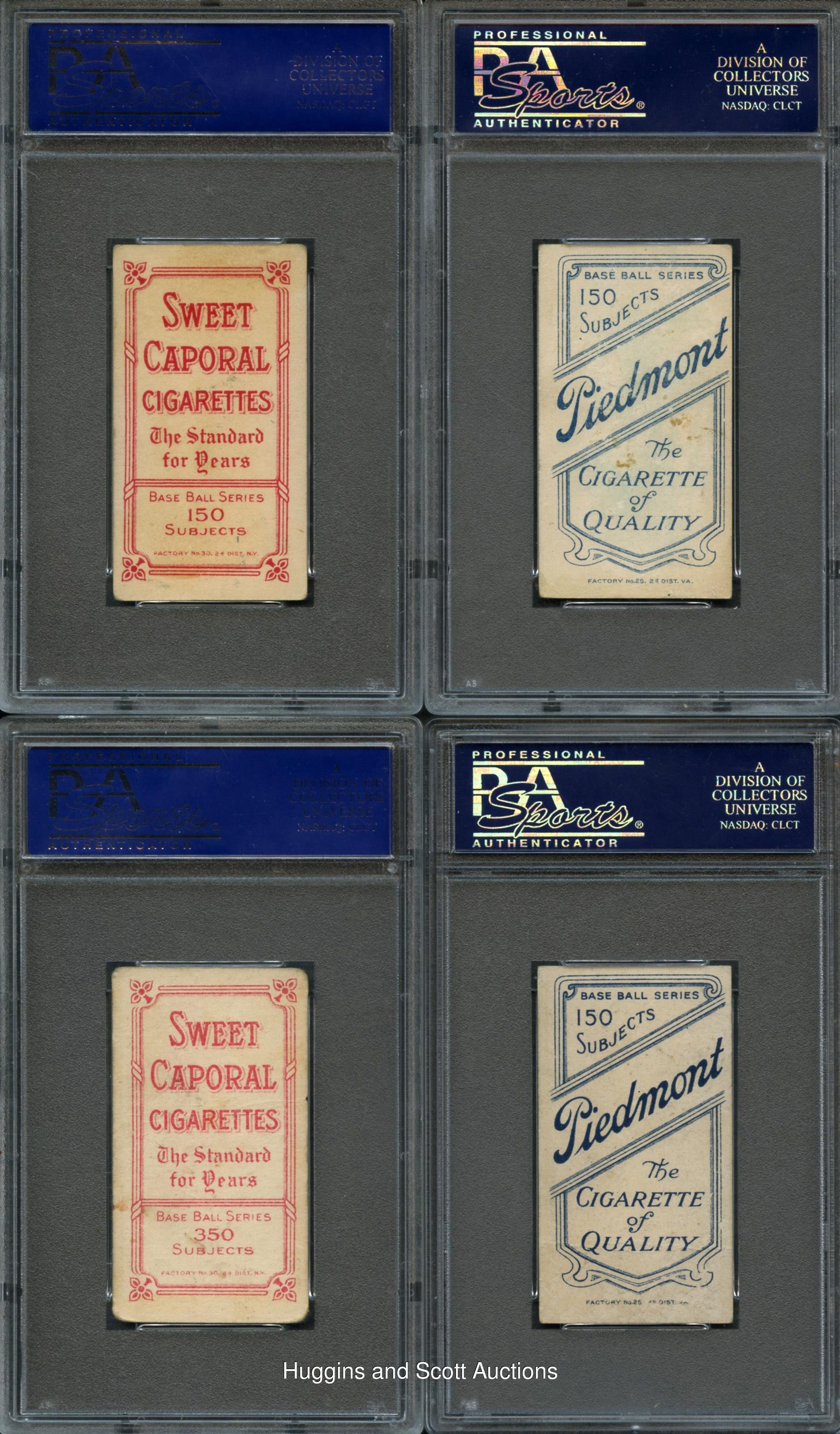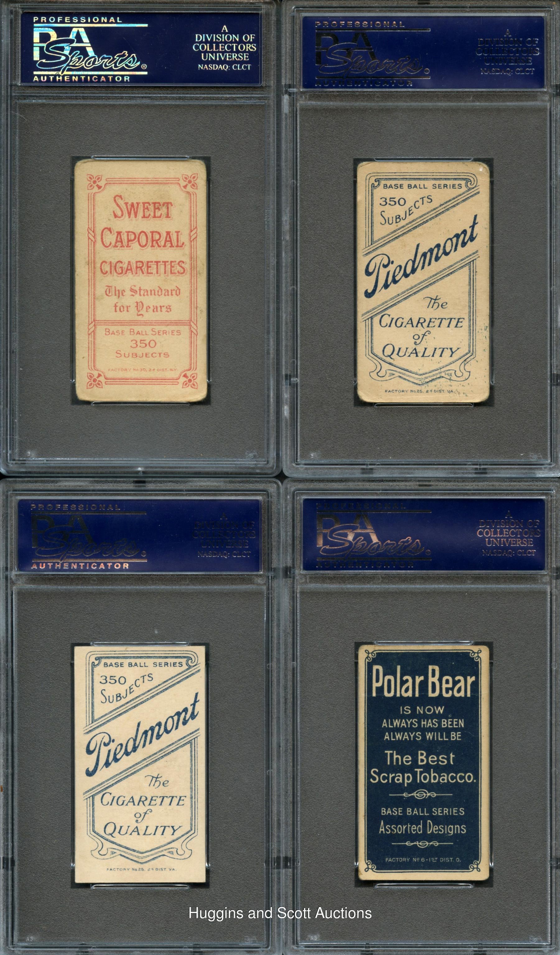 Explosive 1909-11 T206 White Border collection of (83) cards featuring (17) Hall of Famers and (8) Southern Leaguers! Each graded Good 2 by PSA with no qualifiers. The advertising back composition is as follows: (68) Piedmont/Sweet Caporal, (8) Old Mill, (5) Polar Bear and (2) Sovereign. Keys include: Hall of Famers: (17 cards, all common backs, unless noted) with Bresnahan (Portrait), M. Brown (Portrait), Chance (Batting), Chesbro, Cobb (Bat On Shoulder), J. Collins (Polar Bear), Evers (with Bat, Chicago on Shirt), Evers (with Bat, Cubs on Shirt), Evers (Portrait), Lajoie (Throwing), Marquard (Portrait), Mathewson (White Cap), Tinker (Hands on Knees), Waddell (Portrait), Willis (Throwing), C. Young (Glove Shows), C. Young (Portrait); Southern Leaguers: (8 cards, all Old Mill, unless noted) with Ellam, Helm, LaFitte, Lentz (Piedmont), Manion, Rockenfeld, C. Smith (Piedmont) and Westlake. Detailed description on website. Hall of Famers: (17 cards, all common backs, unless noted) with Bresnahan (Portrait), M. Brown (Portrait), Chance (Batting), Chesbro, Cobb (Bat On Shoulder), J. Collins (Polar Bear), Evers (with Bat, Chicago on Shirt), Evers (with Bat, Cubs on Shirt), Evers (Portrait), Lajoie (Throwing), Marquard (Portrait), Mathewson (White Cap), Tinker (Hands on Knees), Waddell (Portrait), Willis (Throwing), C. Young (Glove Shows), C. Young (Portrait); Southern Leaguers: (8 cards, all Old Mill, unless noted) with Ellam, Helm, LaFitte, Lentz (Piedmont), Manion, Rockenfeld, C. Smith (Piedmont), Westlake; Common Old Mill: (2 cards) with Abbott, Meyers; Common Polar Bear: (4 cards) with Elberfeld (Washington, Fielding), Schlafly, Seymour (Portrait), Taylor; Common Sovereign: (2 cards) with Kisinger (350 Subjects), McIntyre (Brooklyn & Chicago, 350 Subjects); Others: (50 cards) with Alperman, Ames (Portrait), Bates, Bridwell (Portrait, No Cap), Campbell, Cassidy, Chase (Blue Portrait), Chase (Holding Trophy), Chase (Pink Portrait), Crandall (Portrait, No Cap), Dahlen (Boston), H. Davis (No Initial), F. Delehanty, J. Delehanty, Doyle (Throwing), Easterly, Ganley, Hannifan, Hemphill, S. Hofman, Jackson, F. Jones (Portrait), Krause (Portrait), Leach (Bending Over), Leach (Portrait), Magee (Portrait), Manning (Batting), McIntyre (Detroit), Merkle (Portrait), Moeller, Murphy (Batting), Mullin (Throwing), Nicholls (Hands on Knees), Overall (Hands Waist Level), Paskert, Pelty (Horizontal), Pickering, Powers, Reulbach (Glove Showing), Rhodes, Rucker (Throwing), Schaefer (Washington), Schulte (Back View), Shipke, Spade, Steinfeldt (with Bat), Steinfeldt (Portrait), Sullivan, Willetts, Wiltse (Portrait, No Cap)