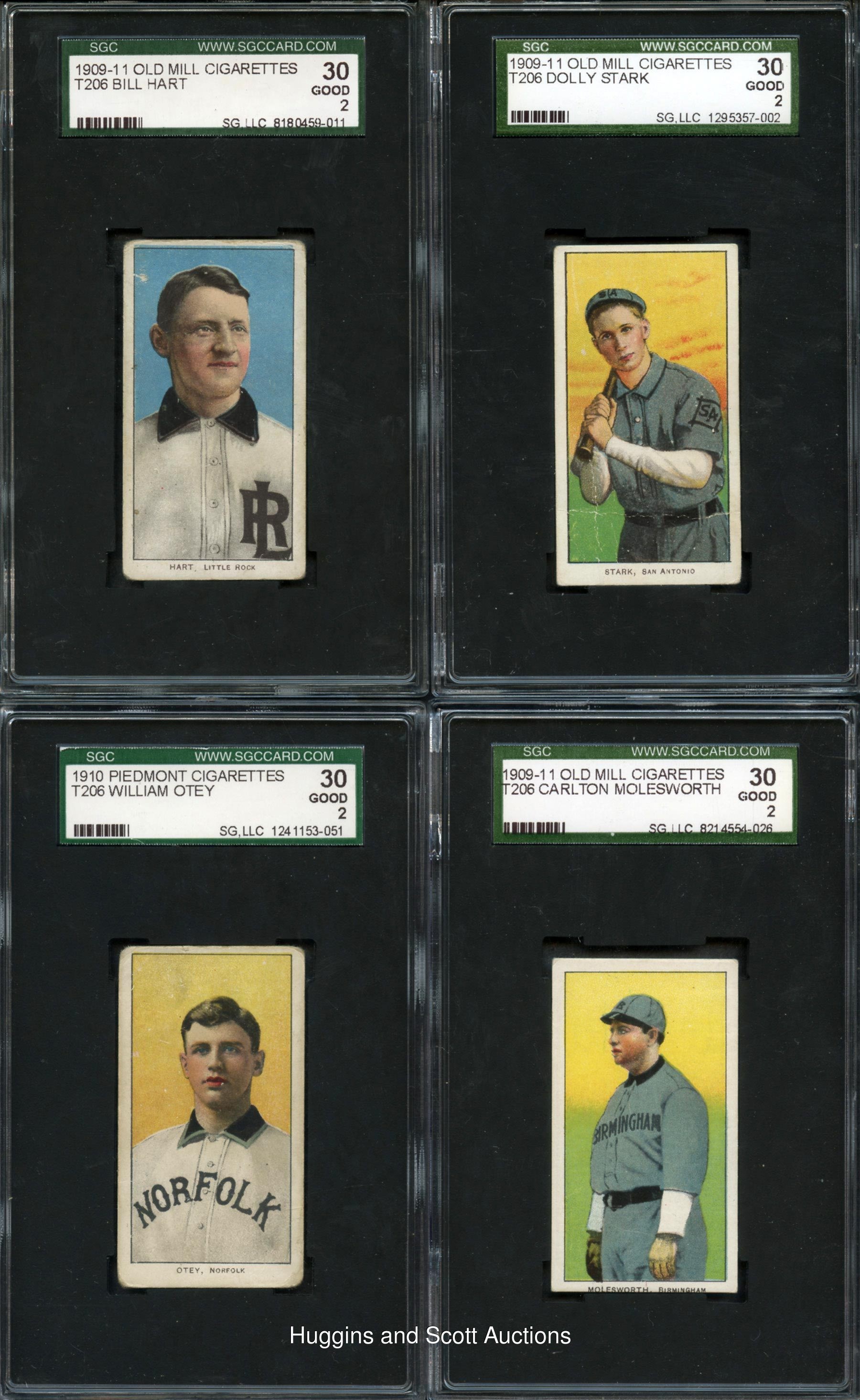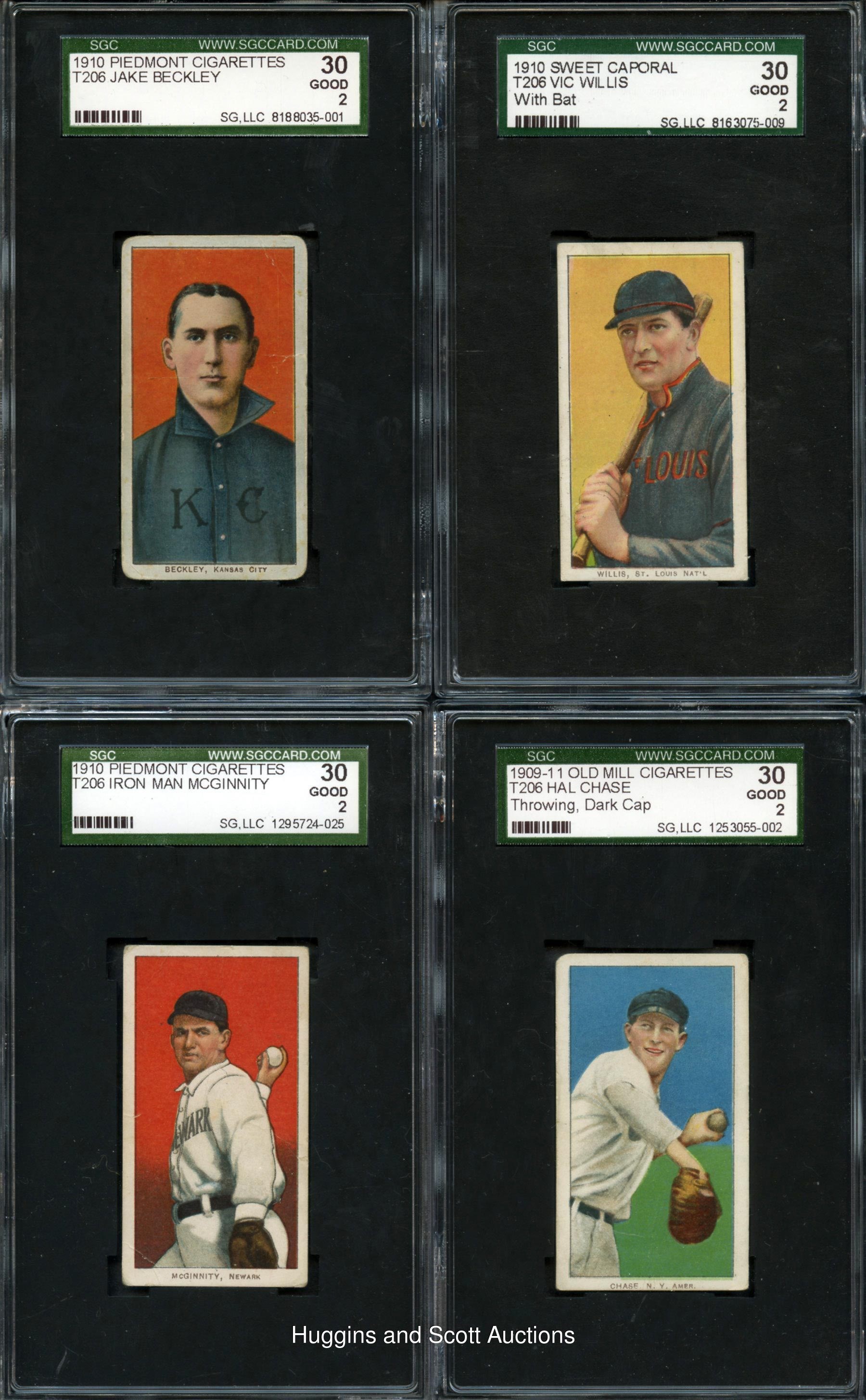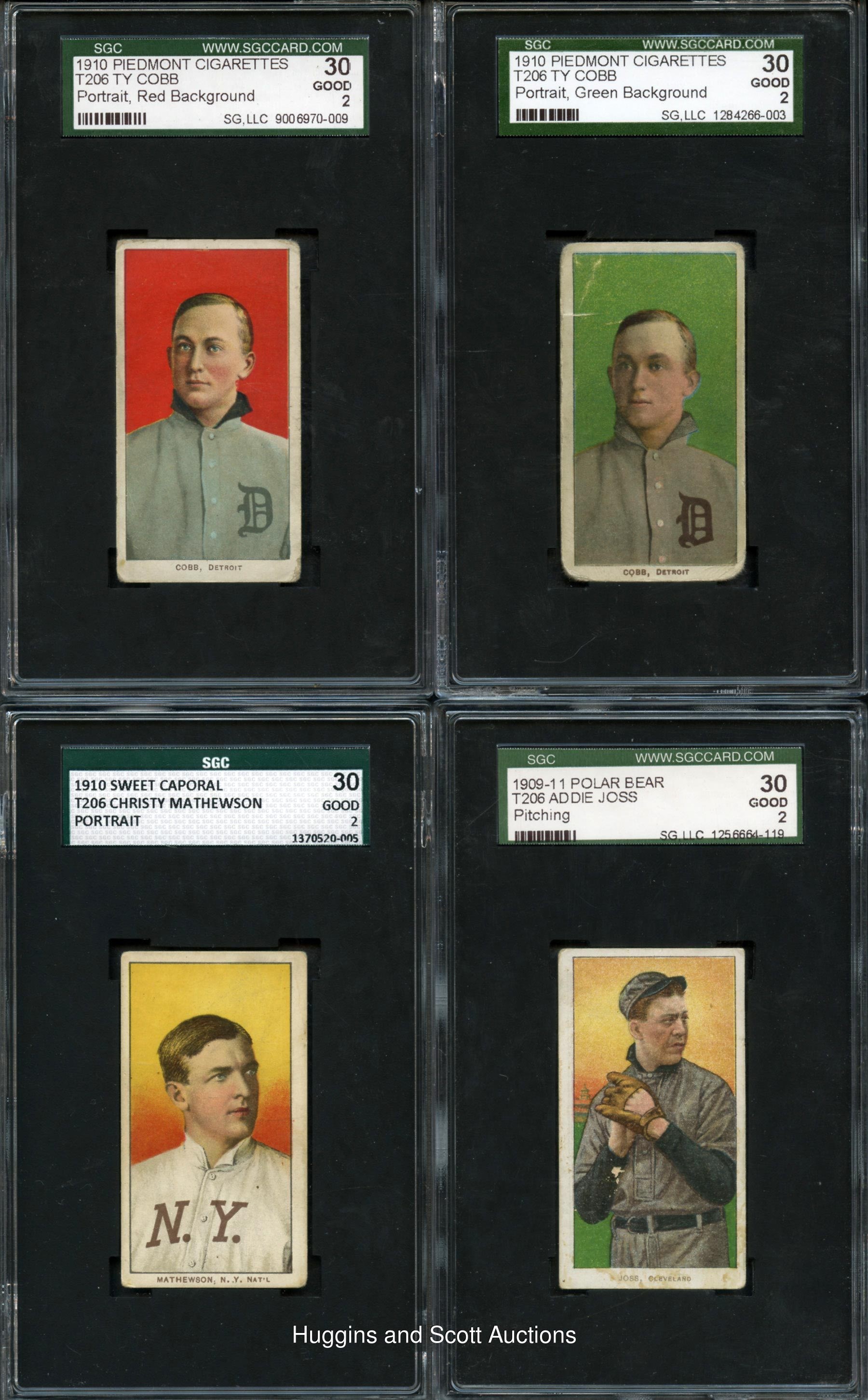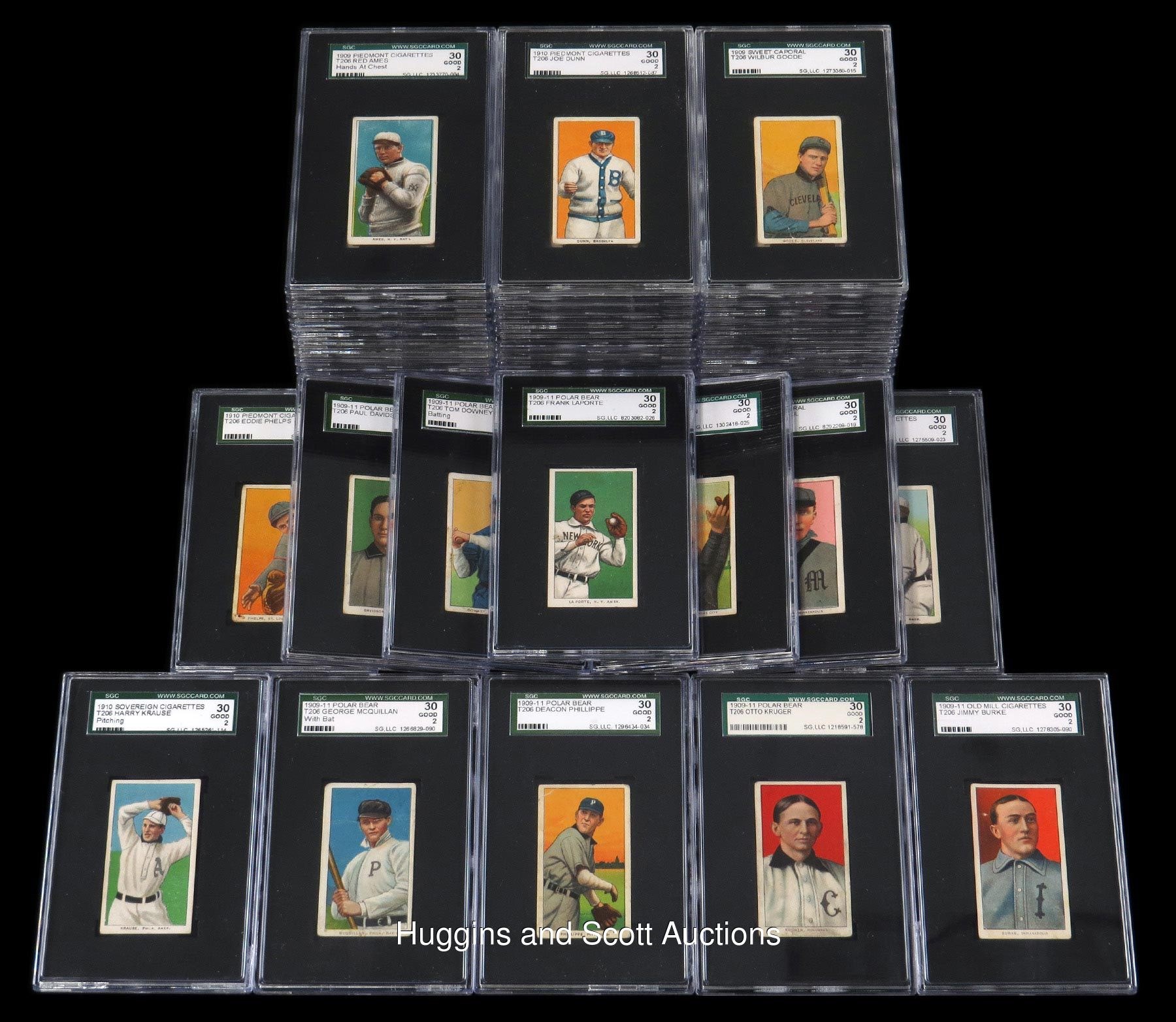 Pick a pair of “Georgia Peaches” with these (77) different 1909-11 T206 White Borders. Each graded 30 Good 2 by SGC. The advertising back composition is as follows: (58) Piedmont/Sweet Caporal, (10) Old Mill, (8) Polar Bear and (1) Sovereign. Unless noted, each relic features a more common reverse. Highlights include: Hall of Famers: (15 cards) with Baker, Beckley, Bender (Pitching, Trees in Background), M. Brown (Cubs on Shirt), Cobb (Green Portrait), Cobb (Red Portrait), Griffith (Batting), Jennings (One Hand Showing), Joss (Pitching, Polar Bear), Keeler (Portrait), Keeler (with Bat), Mathewson (Portrait), McGinnity, Tinker (Bat On Shoulder), Willis (with Bat); Southern Leaguers: (10 cards, all Old Mill, unless noted) with Bastian, Bay, Bernhard, Coles (Piedmont), Foster (Piedmont), Greminger, B. Hart, Molesworth, Otey (Piedmont) and Stark. Detailed description on website. Hall of Famers: (15 cards) with Baker, Beckley, Bender (Pitching, Trees in Background), M. Brown (Cubs on Shirt), Cobb (Green Portrait), Cobb (Red Portrait), Griffith (Batting), Jennings (One Hand Showing), Joss (Pitching, Polar Bear), Keeler (Portrait), Keeler (with Bat), Mathewson (Portrait), McGinnity, Tinker (Bat On Shoulder), Willis (with Bat); Southern Leaguers: (10 cards, all Old Mill, unless noted) with Bastian, Bay, Bernhard, Coles (Piedmont), Foster (Piedmont), Greminger, B. Hart, Molesworth, Otey (Piedmont), Stark; Others: (52 cards) with Ames (Hands at Chest), Ames (Hands Over Head), Ball (New York), Barbeau, Beck, Bergen (Batting), Burke (Old Mill), Carr, Carrigan, Chase (Throwing, Dark Cap), Cicotte, Criss, Davidson (Polar Bear), Downey (Batting, Polar Bear), Ja. Dunn, Jo. Dunn, Durham, Ganzel, Geyer, Gibson, Goode, B. Hinchman, Hummel, Hunter, Isbell, Kleinow (New York, with Bat), Kling, Krause (Pitching, Sovereign 350), Kruger (Polar Bear), LaPorte (Polar Bear), Latham, Lumley, Mattern, McQuillan (with Bat, Polar Bear), Murphy (Throwing), Murray (Portrait), Nattress, Oldring (Fielding), O’Neil, Phelps, Phillippe (Polar Bear), Powell, Raymond, Reulbach (No Glove Showing), Ritchey, Shannon (Polar Bear), Slagle, He. Smith, B. Sweeney, He. Wagner (Bat on Left Shoulder), Warhop, Wilhelm (with Bat)