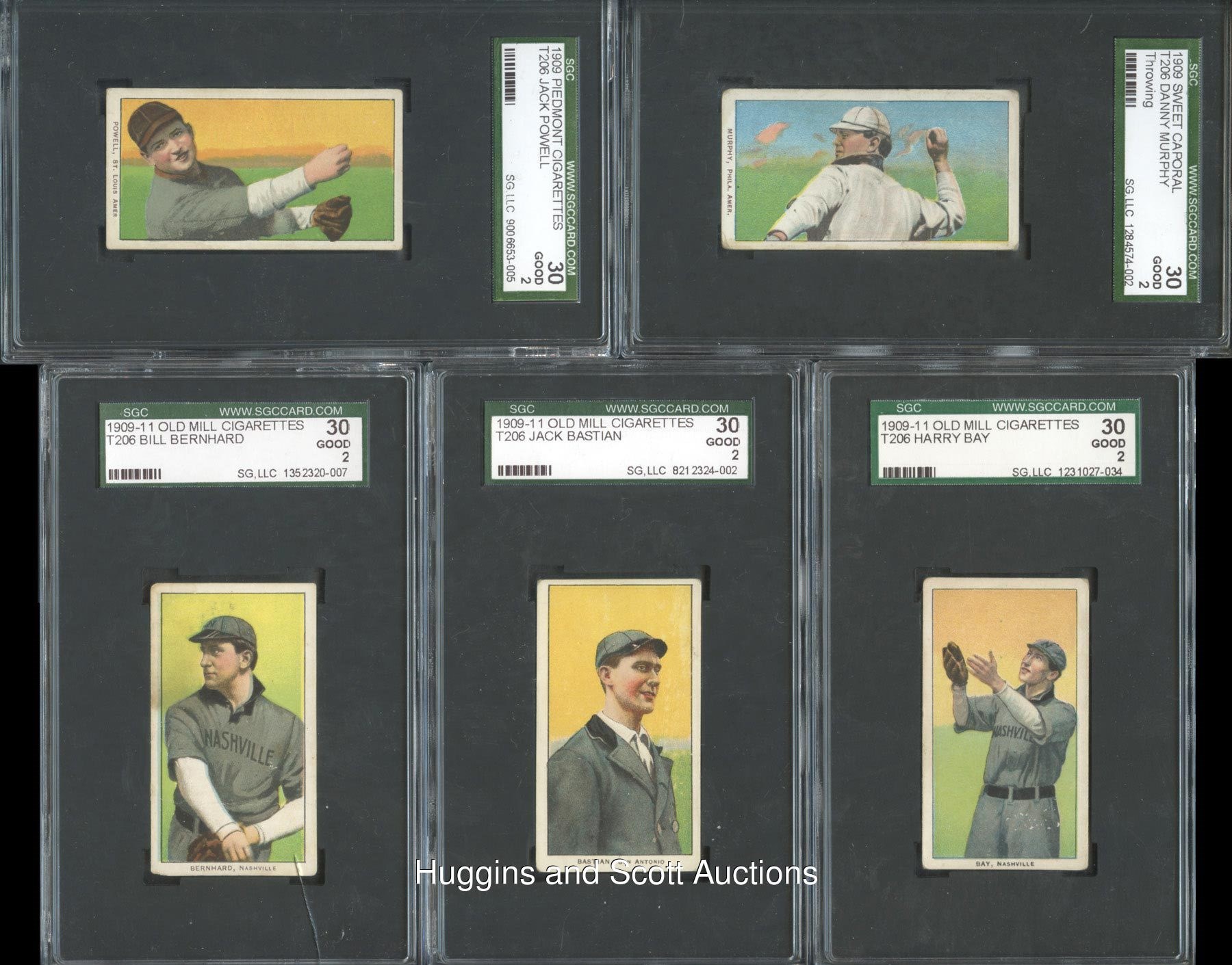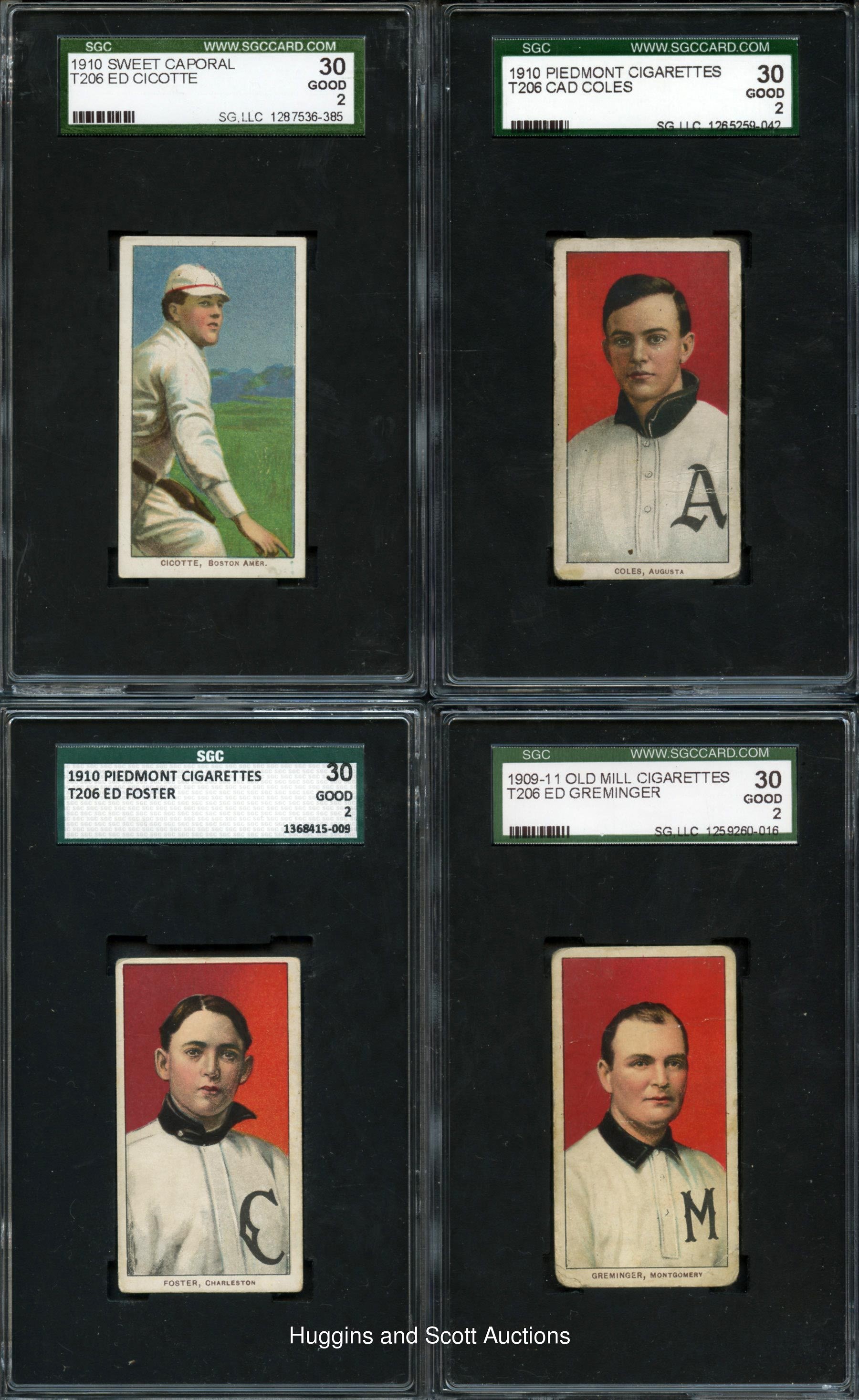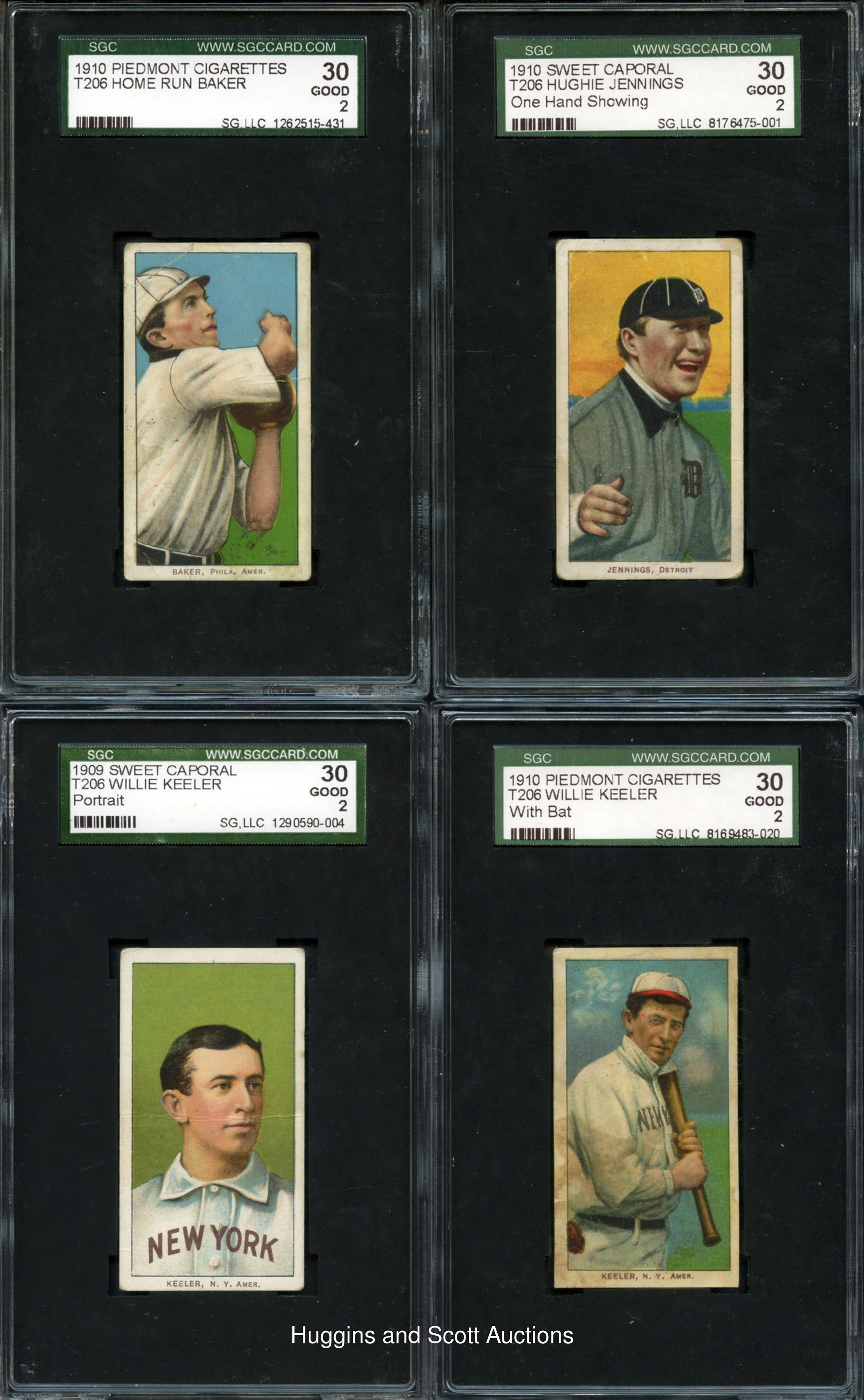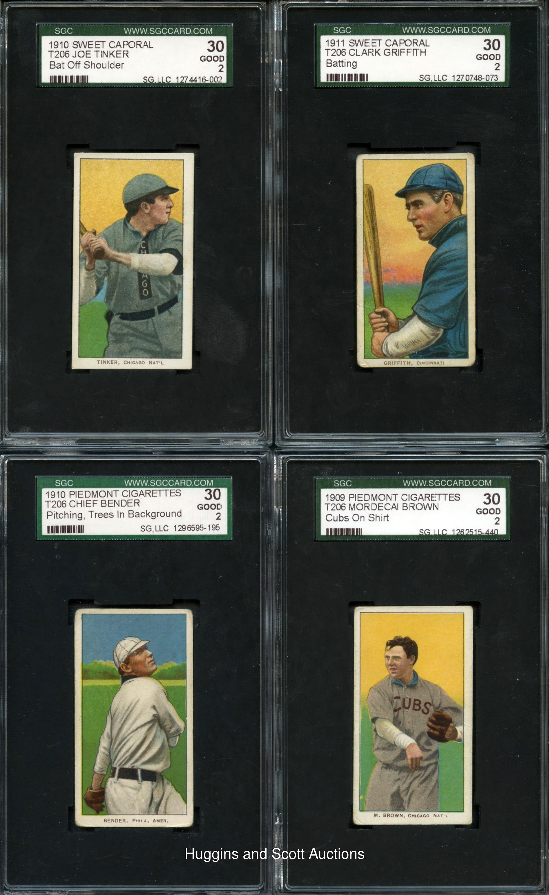 Pick a pair of “Georgia Peaches” with these (77) different 1909-11 T206 White Borders. Each graded 30 Good 2 by SGC. The advertising back composition is as follows: (58) Piedmont/Sweet Caporal, (10) Old Mill, (8) Polar Bear and (1) Sovereign. Unless noted, each relic features a more common reverse. Highlights include: Hall of Famers: (15 cards) with Baker, Beckley, Bender (Pitching, Trees in Background), M. Brown (Cubs on Shirt), Cobb (Green Portrait), Cobb (Red Portrait), Griffith (Batting), Jennings (One Hand Showing), Joss (Pitching, Polar Bear), Keeler (Portrait), Keeler (with Bat), Mathewson (Portrait), McGinnity, Tinker (Bat On Shoulder), Willis (with Bat); Southern Leaguers: (10 cards, all Old Mill, unless noted) with Bastian, Bay, Bernhard, Coles (Piedmont), Foster (Piedmont), Greminger, B. Hart, Molesworth, Otey (Piedmont) and Stark. Detailed description on website. Hall of Famers: (15 cards) with Baker, Beckley, Bender (Pitching, Trees in Background), M. Brown (Cubs on Shirt), Cobb (Green Portrait), Cobb (Red Portrait), Griffith (Batting), Jennings (One Hand Showing), Joss (Pitching, Polar Bear), Keeler (Portrait), Keeler (with Bat), Mathewson (Portrait), McGinnity, Tinker (Bat On Shoulder), Willis (with Bat); Southern Leaguers: (10 cards, all Old Mill, unless noted) with Bastian, Bay, Bernhard, Coles (Piedmont), Foster (Piedmont), Greminger, B. Hart, Molesworth, Otey (Piedmont), Stark; Others: (52 cards) with Ames (Hands at Chest), Ames (Hands Over Head), Ball (New York), Barbeau, Beck, Bergen (Batting), Burke (Old Mill), Carr, Carrigan, Chase (Throwing, Dark Cap), Cicotte, Criss, Davidson (Polar Bear), Downey (Batting, Polar Bear), Ja. Dunn, Jo. Dunn, Durham, Ganzel, Geyer, Gibson, Goode, B. Hinchman, Hummel, Hunter, Isbell, Kleinow (New York, with Bat), Kling, Krause (Pitching, Sovereign 350), Kruger (Polar Bear), LaPorte (Polar Bear), Latham, Lumley, Mattern, McQuillan (with Bat, Polar Bear), Murphy (Throwing), Murray (Portrait), Nattress, Oldring (Fielding), O’Neil, Phelps, Phillippe (Polar Bear), Powell, Raymond, Reulbach (No Glove Showing), Ritchey, Shannon (Polar Bear), Slagle, He. Smith, B. Sweeney, He. Wagner (Bat on Left Shoulder), Warhop, Wilhelm (with Bat)
