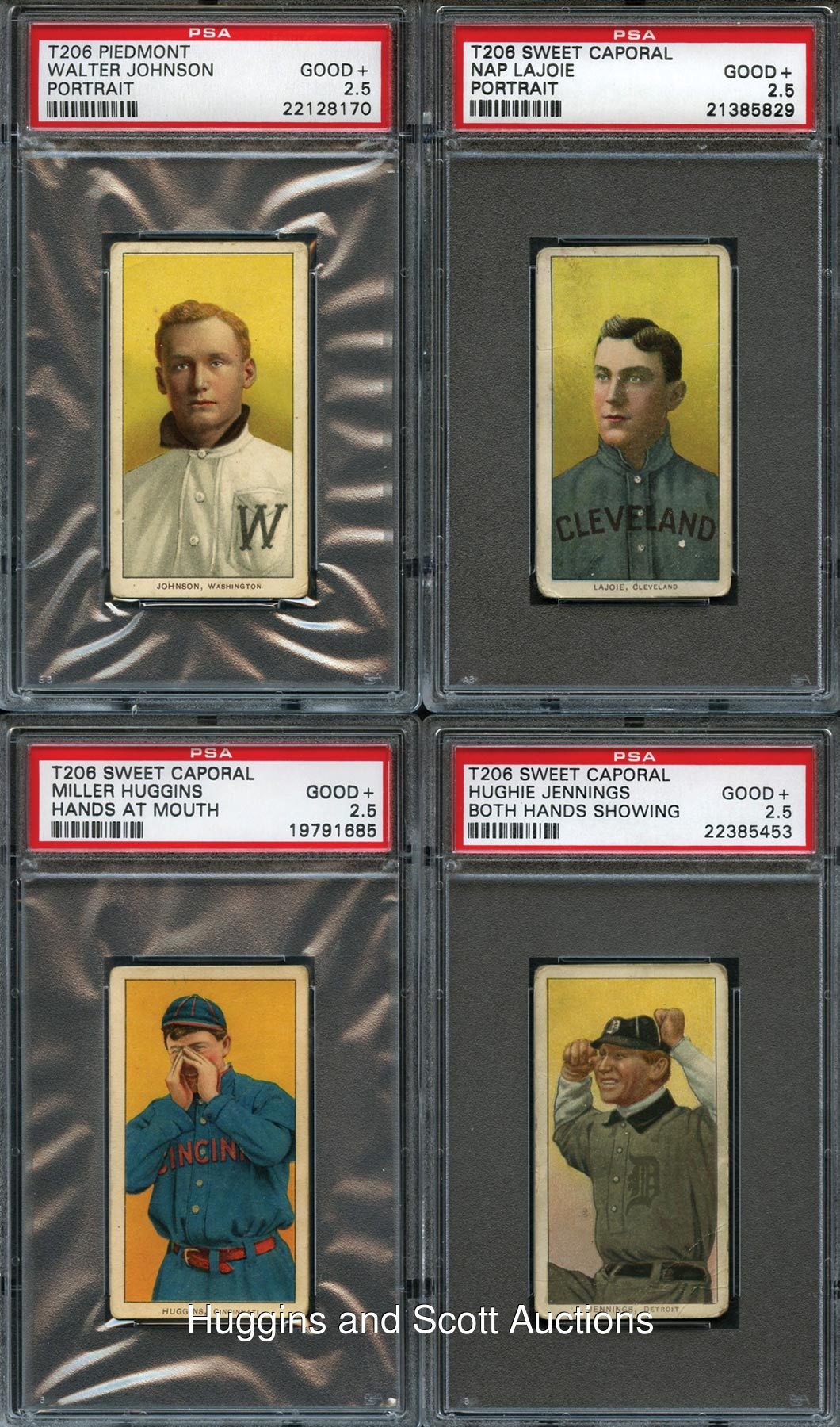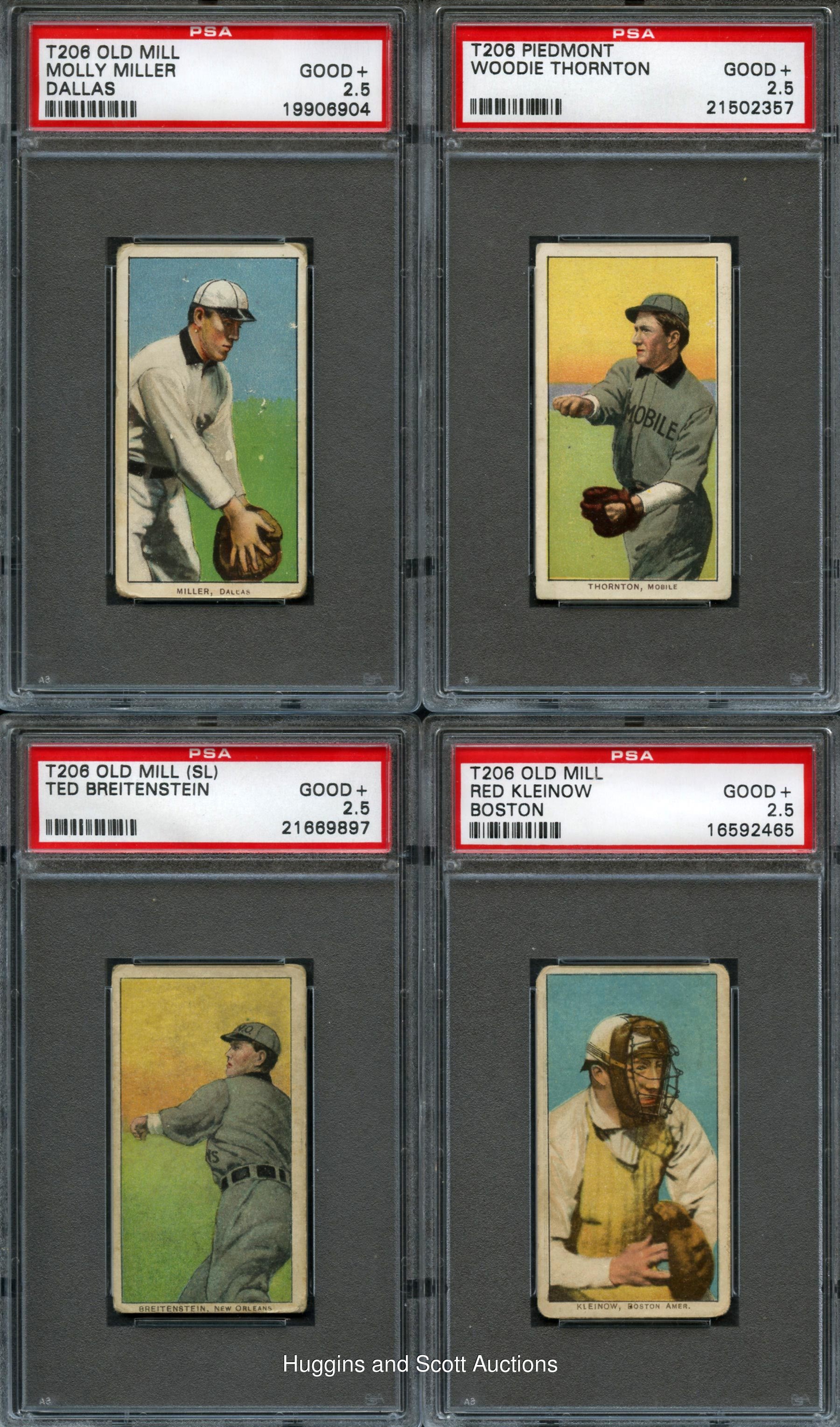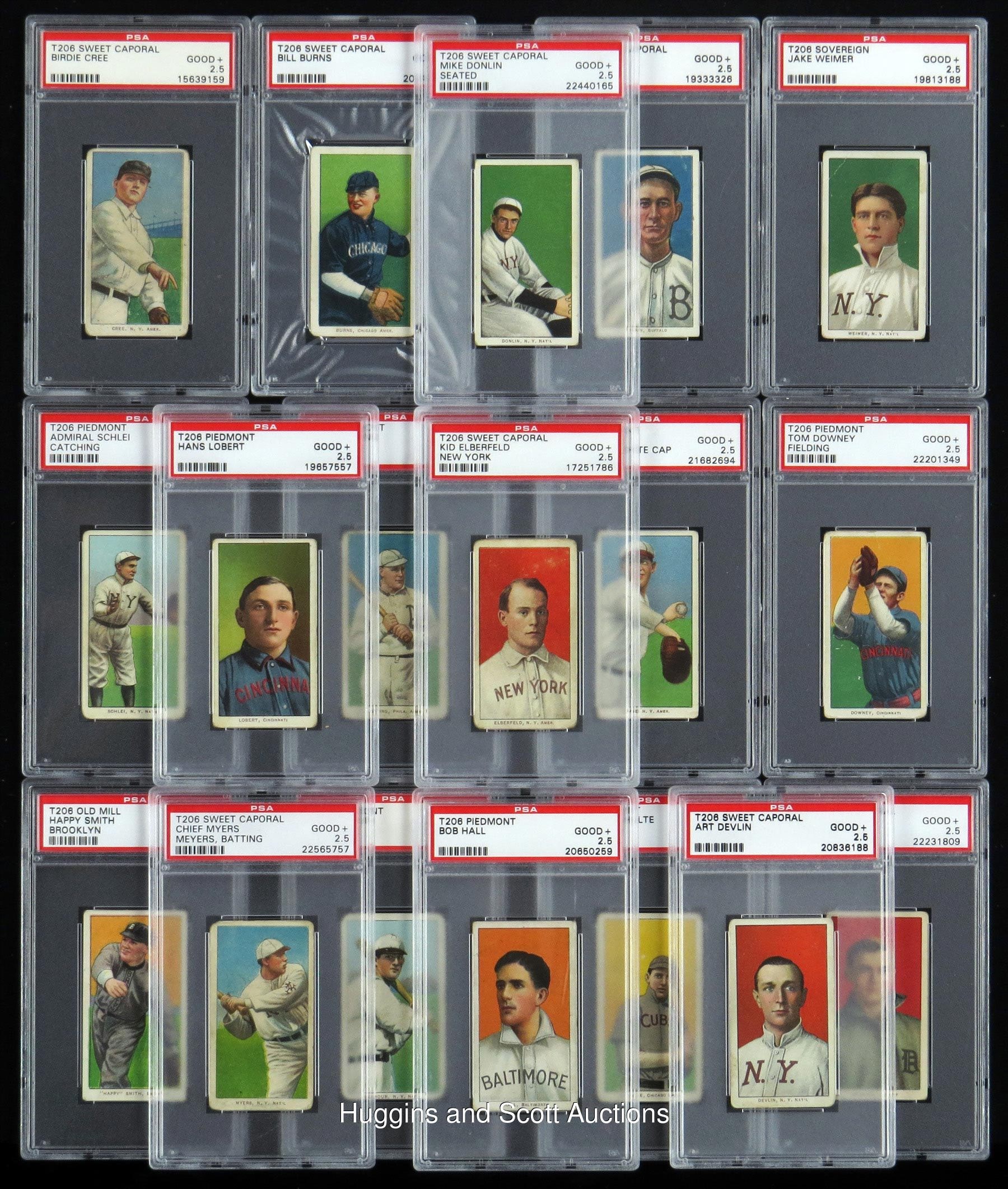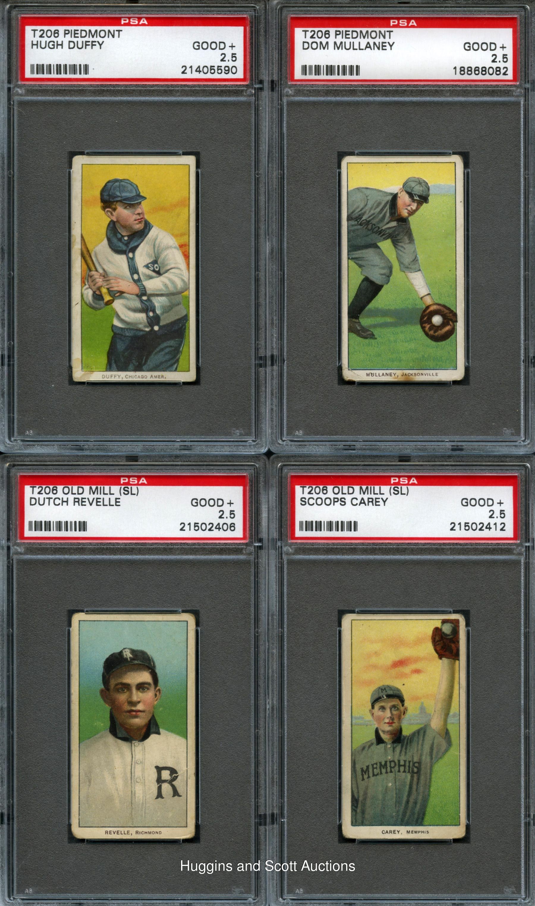 Prized assortment of (30) 1909-11 T206 White Borders including (11) Hall of Famers and Southern Leaguers. Unless noted, each artifact is flanked by a common back. Highlights include: Hall of Famers: (5 cards) with Duffy, Huggins (Hands at Mouth), Jennings (Both Hands Showing), W. Johnson (Portrait), Lajoie (Portrait); Southern Leaguers: (6 cards) with Breitenstein, Carey, M. Miller, Mullaney (Piedmont), Revelle, Thornton (Piedmont); Others: (19 cards) with Chase (Throwing, White Cap) and Kleinow (Boston, Old Mill). Detailed description on website. Hall of Famers: (5 cards) with Duffy, Huggins (Hands at Mouth), Jennings (Both Hands Showing), W. Johnson (Portrait), Lajoie (Portrait); Southern Leaguers: (6 cards, all Old Mill, unless noted) with Breitenstein, Carey, M. Miller, Mullaney (Piedmont), Revelle, Thornton (Piedmont); Others: (19 cards) with Brain, Burns, Chase (Throwing, White Cap), Cree, Devlin, Donlin (Seated), Downey (Fielding), Elberfeld (New York), Hall, Kleinow (Boston, Old Mill), Lobert, Myers (Batting), Oldring (Batting), Schlei (Catching), Schmidt (Portrait), Schulte (Front View), Seymour (Batting), H. Smith (Old Mill), Weimer (Sovereign 350)