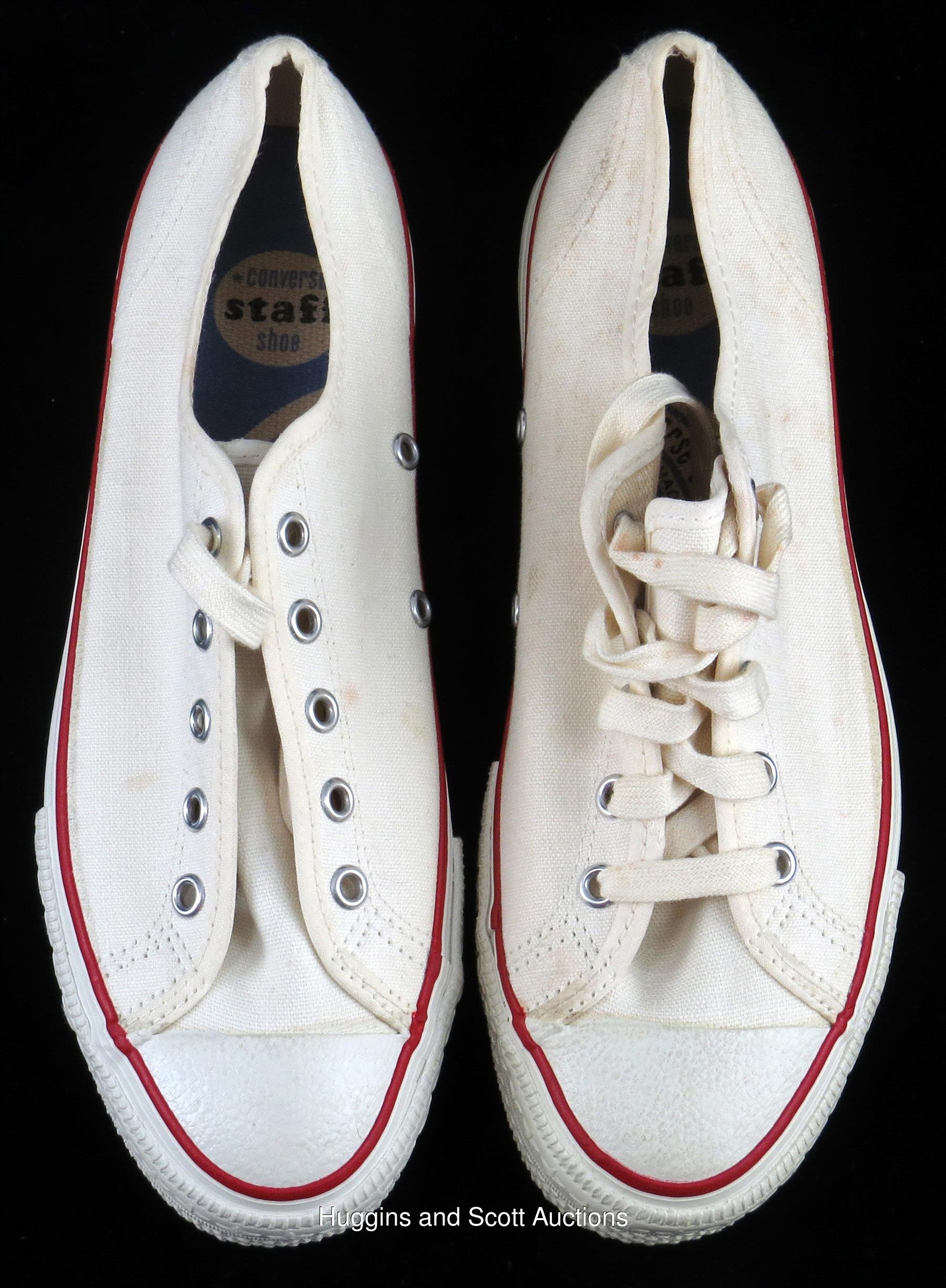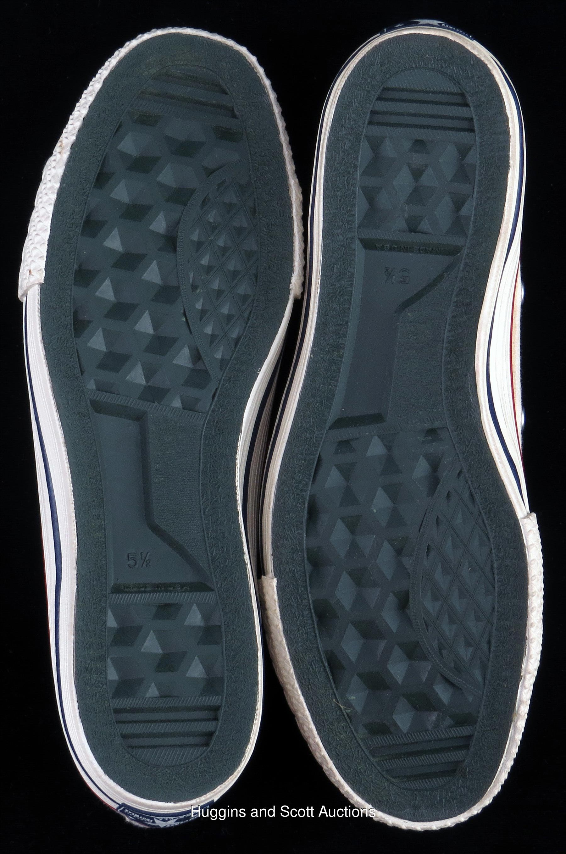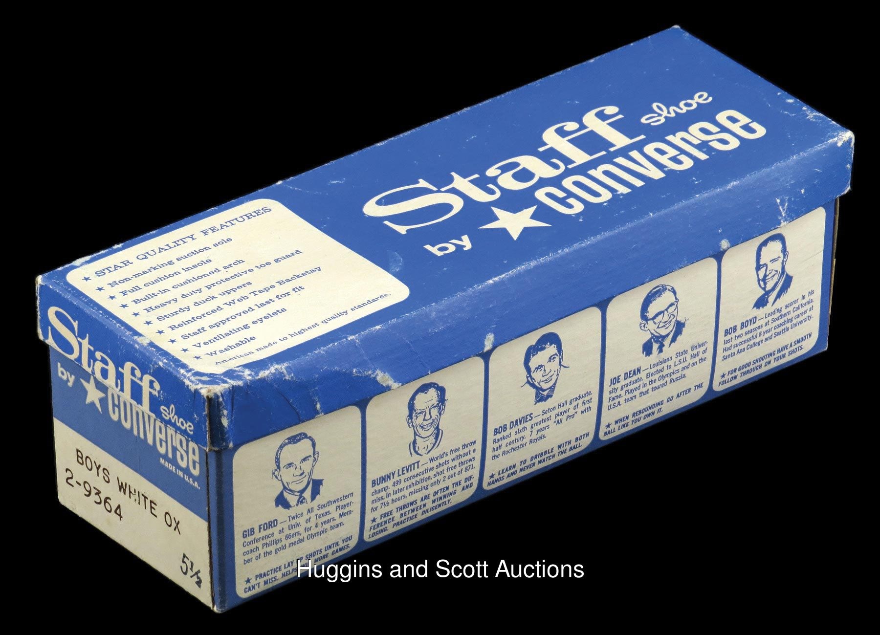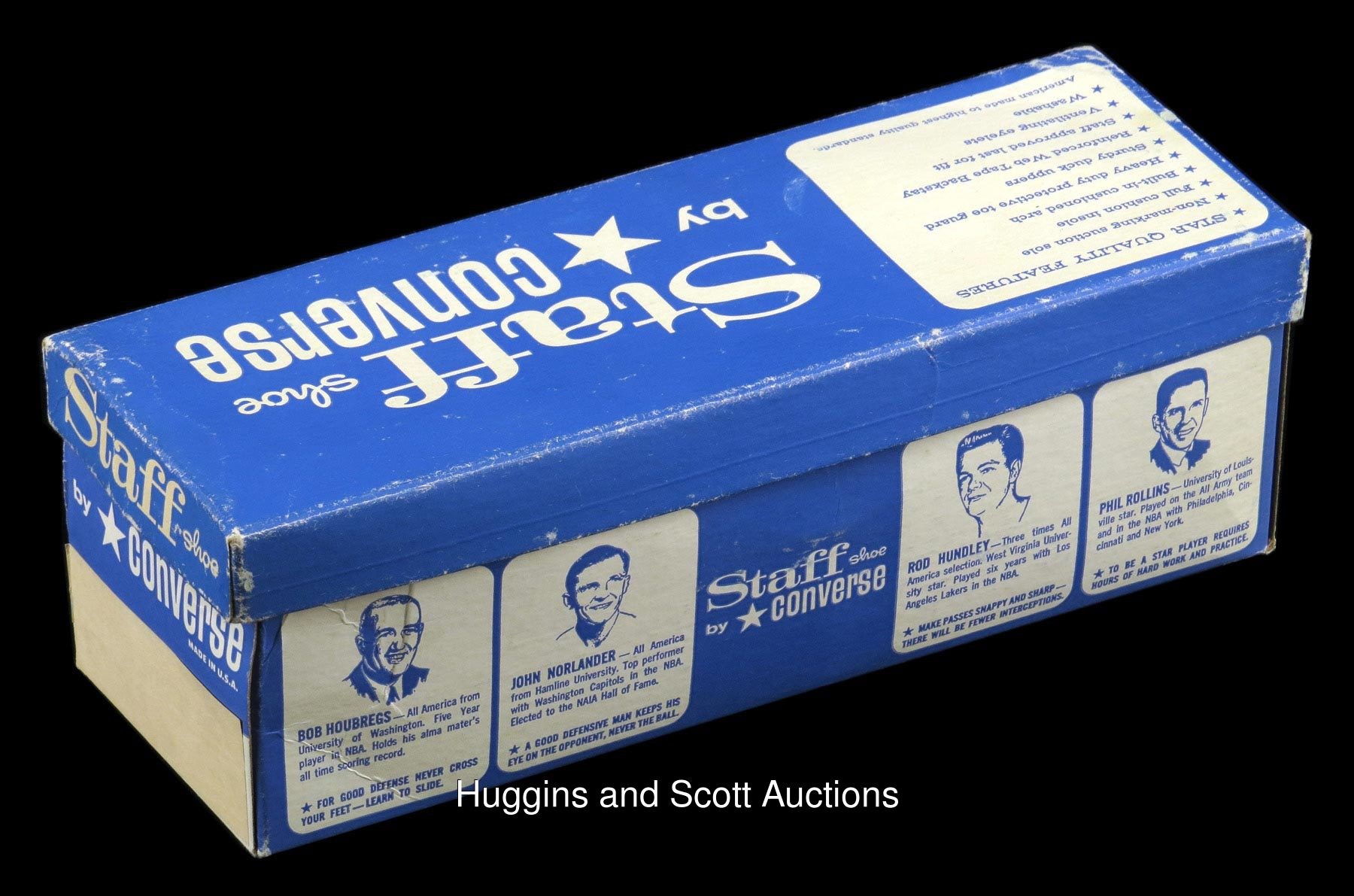 Extremely scarce 1969 Converse Basketball complete shoebox and size 5-1/2 boys sneakers featuring a 9-card "staff" uncut set. The sneakers present very well with only light wear scattered on top of the pair of shoes. The vast majority of these shoeboxes were quickly discarded upon initial purchase and few complete specimens have surfaced over the decades. This assembly includes an intact lid and lower box with crisply attached panels. Despite moderate to heavy fraying and creasing throughout, the subjects still present nicely. Includes: Bob Davies, Joe Dean, Gib Ford, Bob Houbregs, Rod Hundley, Bunny Levitt, Earl Lloyd, John Norlander and Phil Rollins.