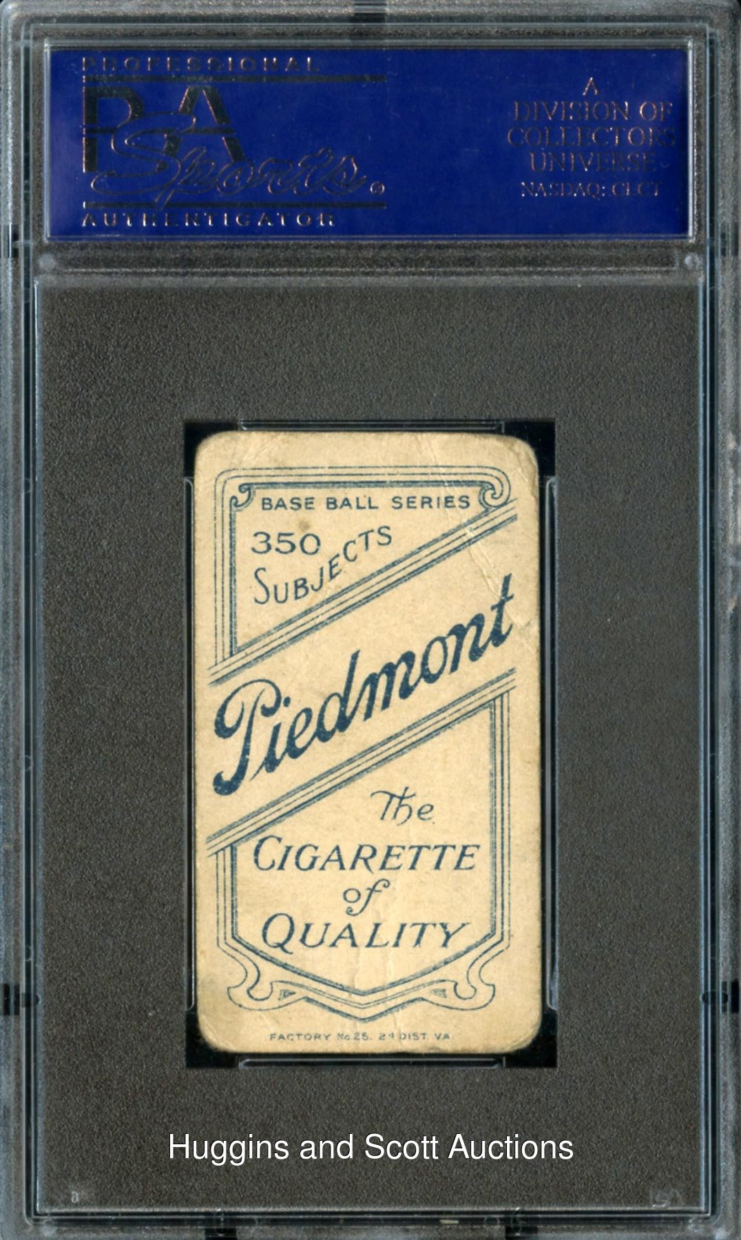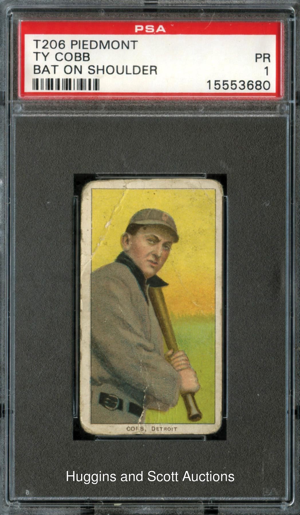 Graded Poor 1 by PSA. The offered 1909-11 T206 White Borders Ty Cobb (Bat on Shoulder) pose is a superb value pick for the savvy pre-war specialist. Although a combination of creasing and general perimeter wear is noticeable on this cardboard classic, the brunt of the wear is apart from the illustration. The Piedmont 350 Subjects backed reverse is absent of any significant wear.