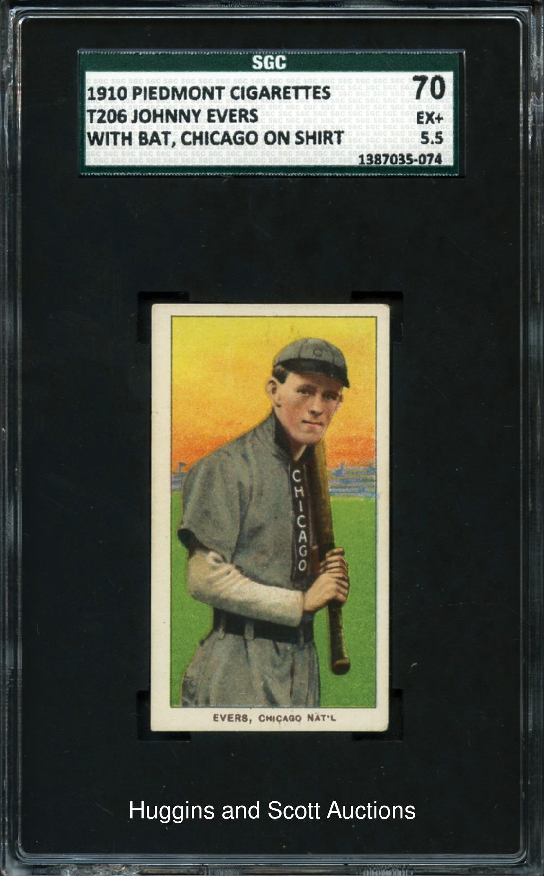 Graded 70 EX+ 5.5 by SGC. Spectacular 1909-11 T206 White Borders Johnny Evers (Batting, Chicago on Shirt) pose with a clean Piedmont 350 Subjects advertising back. It is difficult to conceive how this tobacco card has endure the past 106 years in such premier condition! Showcases dazzling colors and poignant pre-war baseball imagery. Of the 86 total copies of the player/pose/brand combination evaluated by SGC, this example survives as 1 of 2 at the grading level with only three better!