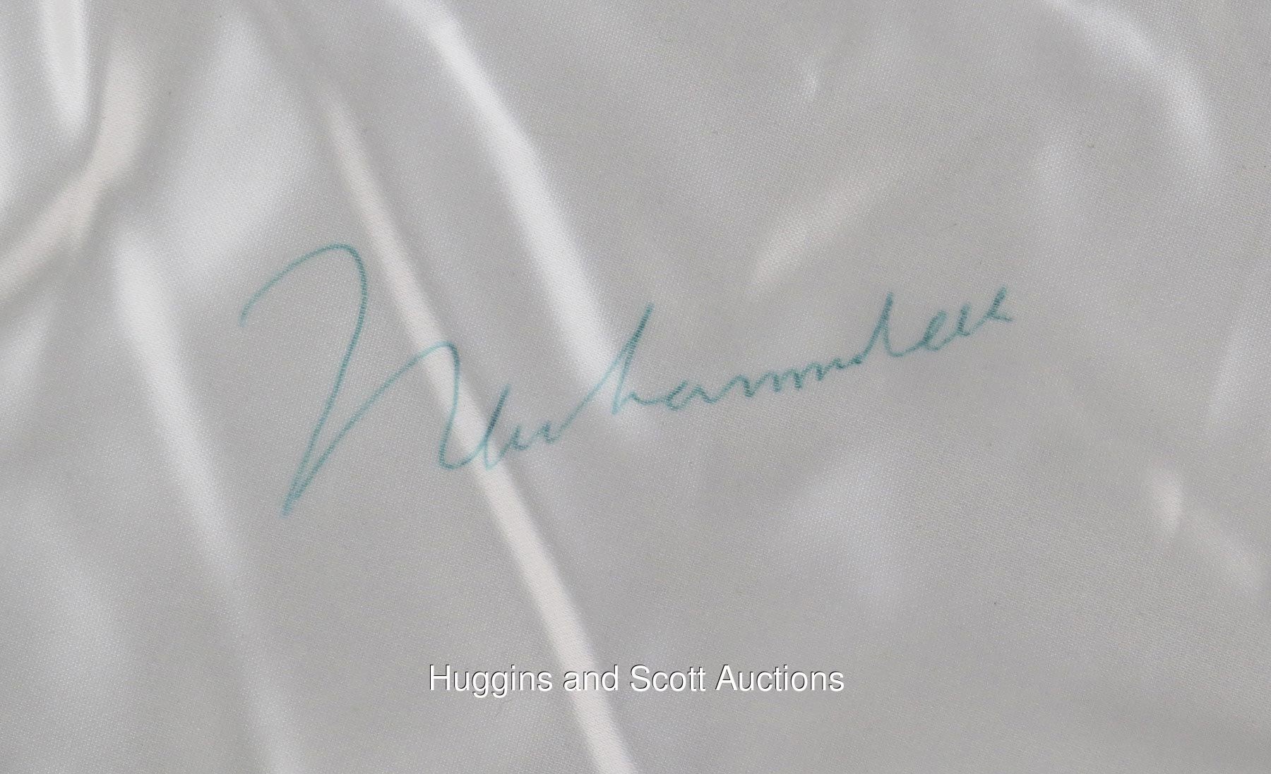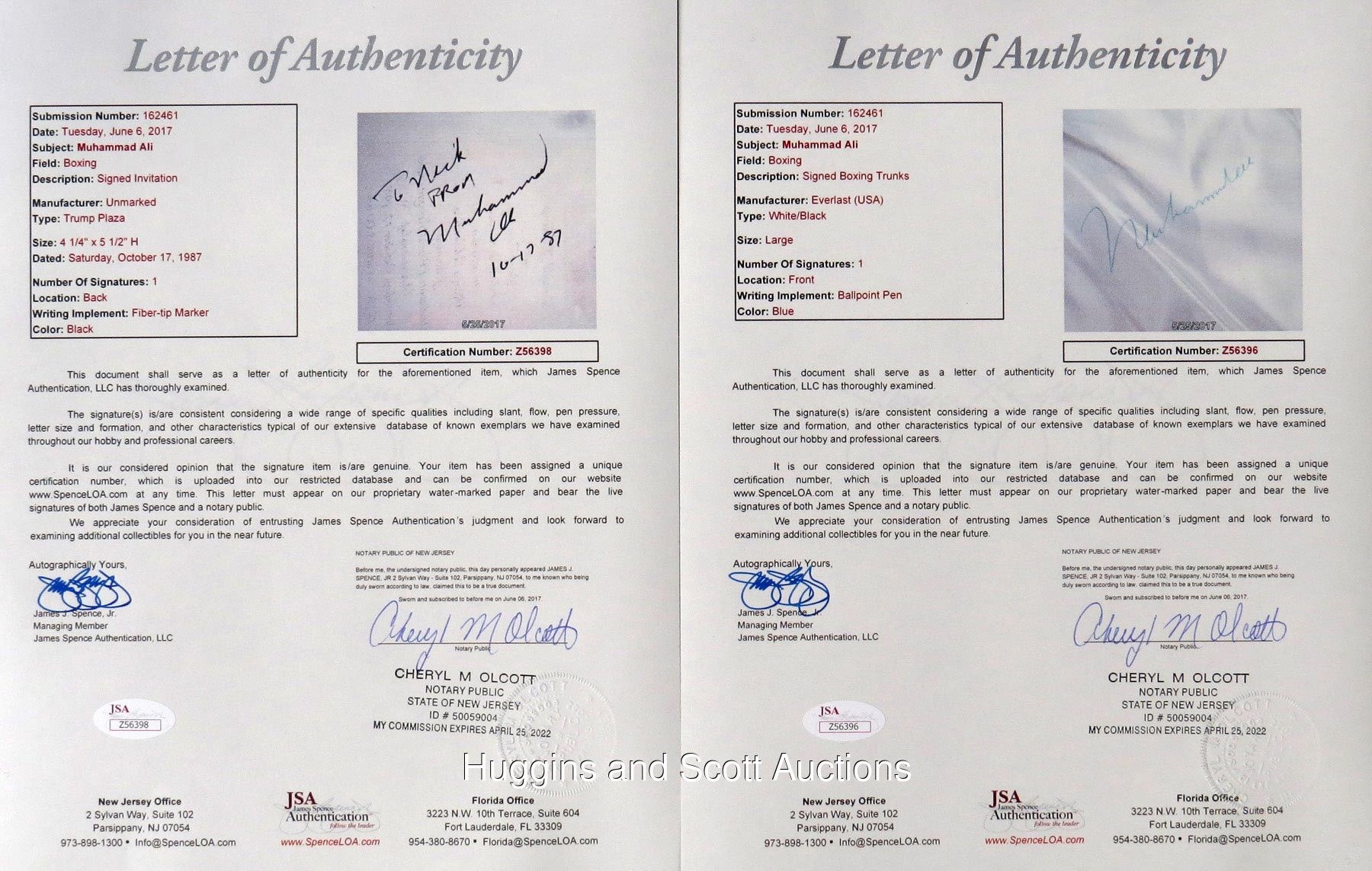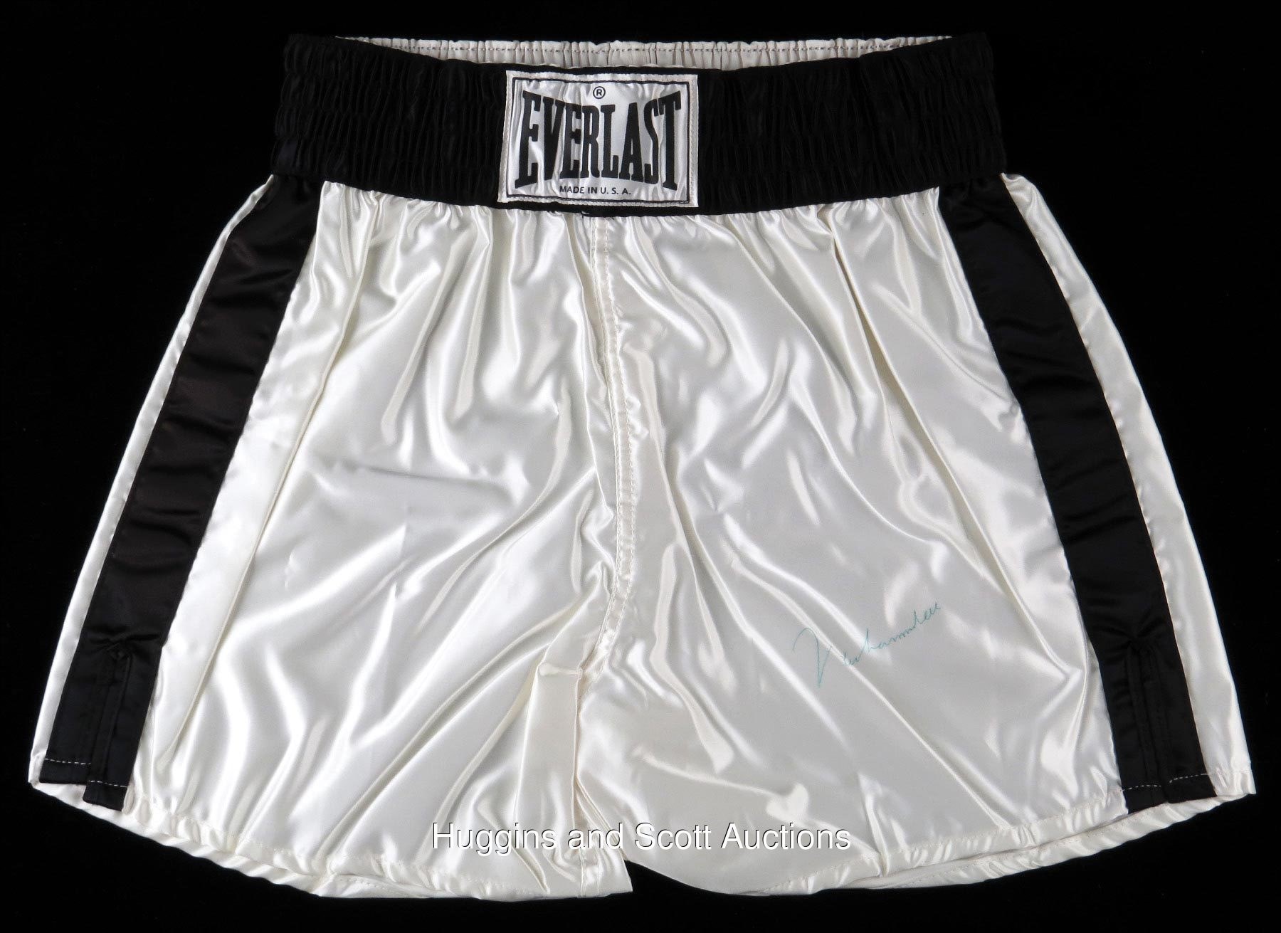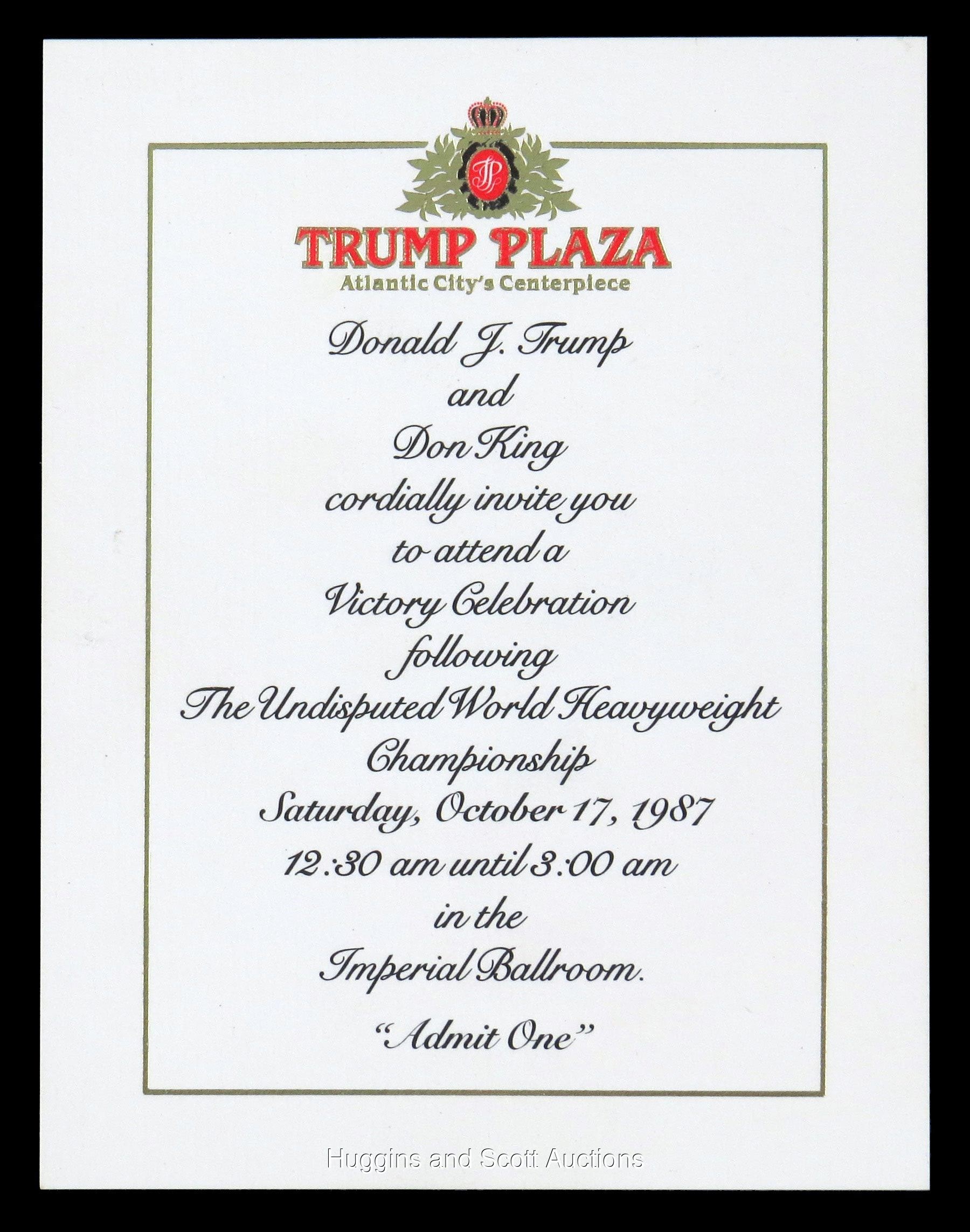 Stake your claim to "The Greatest" by capturing this pair of certified Muhammad Ali autographs. These vintage signatures show clear and precise quality, as they were signed while the three-time heavyweight champion showed a steady hand. Featured are: 1.) Everlast size "L" white with black trim boxing trunks in like-new condition, with an approximate 3-1/2" long signature ("8-9") on the left; 2.) 10/17/87 Trump Plaza heavyweight championship "Victory Celebration" invitation (NM-MT+) with Donald J. Trump and Don King listed as hosts, signed on the reverse ("9") with a personalization and the inscription "10-17-87". Both items come with individual full photo LOA from JSA.