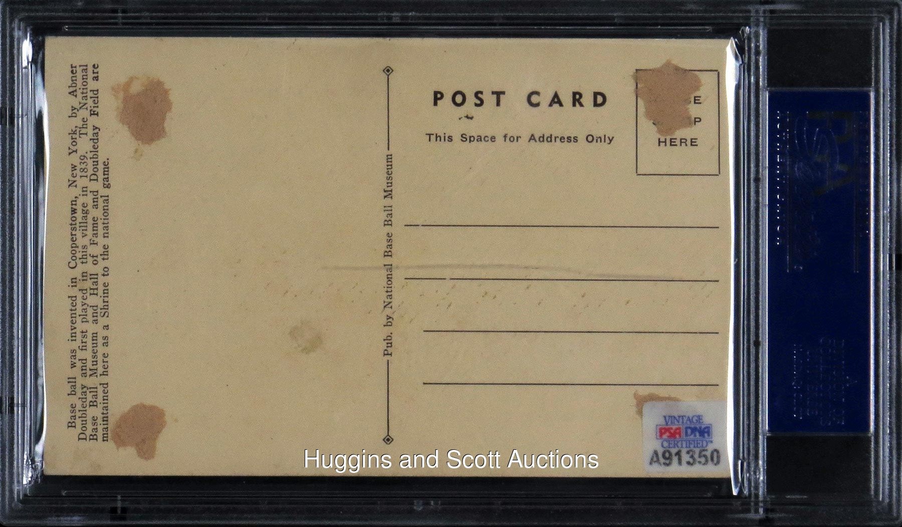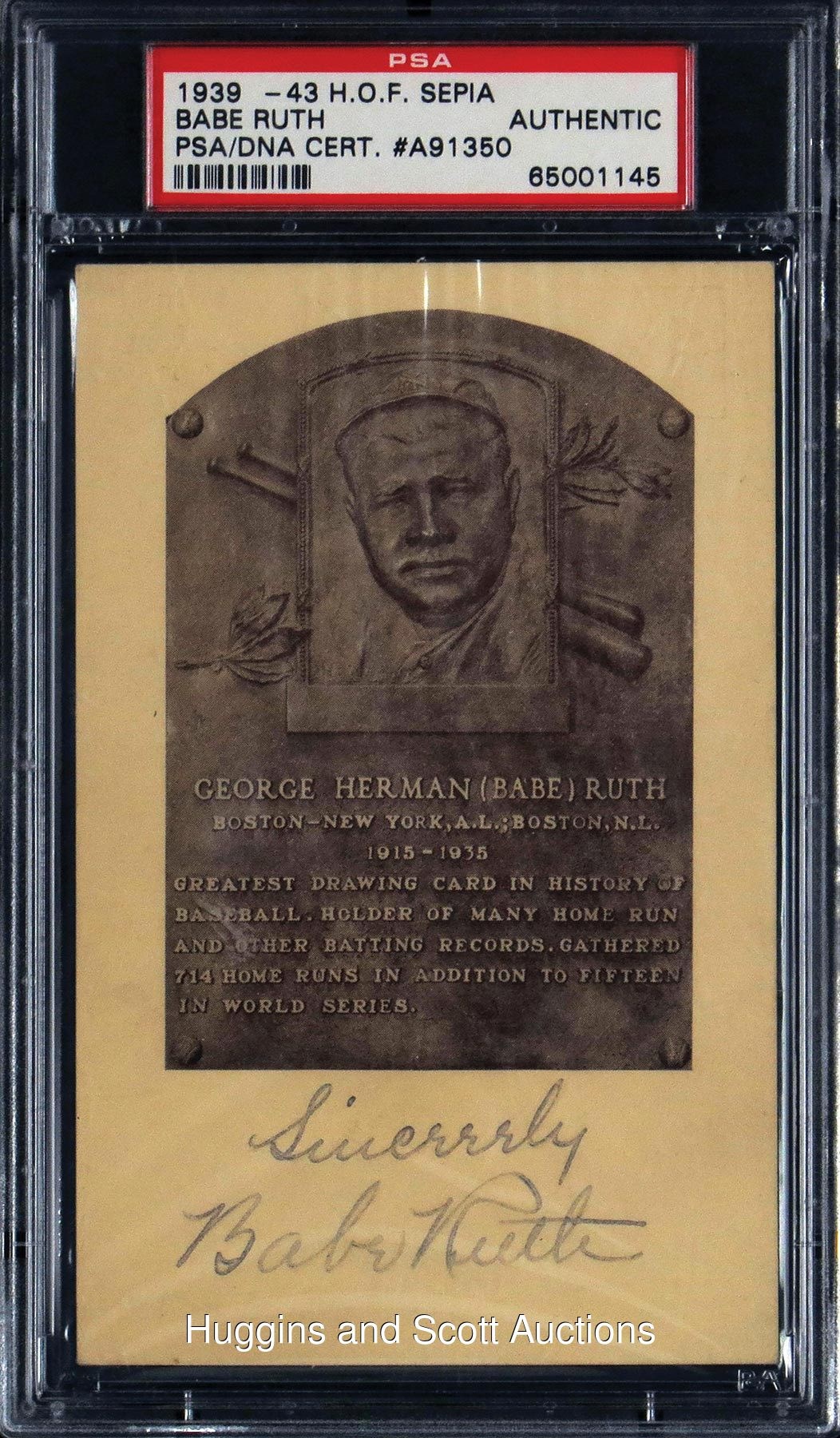 Three years have passed since a Ruth signed plaque postcard set an auction record of $77,675. In that time, the values of all signed sepia and b/w plaques have skyrocketed as advanced collectors claw tooth and nail for the holy grail of a complete set. Case in point: Grover Cleveland Alexander"s signed plaque postcard actually ECLIPSED Ruth earlier this year, selling for $78,870 in our February auction. Now it"s the Bambino"s turn to take back his rightful crown. Ruth practically invented the souvenir signature. He arguably did more for the popularity and looming legacy of autographs than even John Hancock! The Babe signed mountains upon mountains of baseballs in his lifetime, and those orbs have reached upwards of $350,000 at auction. Yet inexplicably, despite his presence at the 1939 Hall of Fame Grand Opening, and his active signing throughout the early-to-mid 1940s, Ruth virtually never encountered HOF plaque postcards. Just four signed examples are in existence, and more than a few hobbyists have wondered why such extreme rarities shouldn"t be more desirable, more pricey, than even the finest of Babe"s ubiquitous signed balls. Like its predecessor auctioned for nearly $80,000 in 2014, this one too is of the earlier 1939-43 Sepia Type 2 variety, whereas the other two known copies are 1940s Albertypes. Ruth"s iconic signature here rates "7" strength. The postcard itself displays frontally as EX with mounting remnants on the reverse. Encapsulated as "Authentic" by PSA/DNA. This item has a reserve (estimated value $60,000-$100,000).