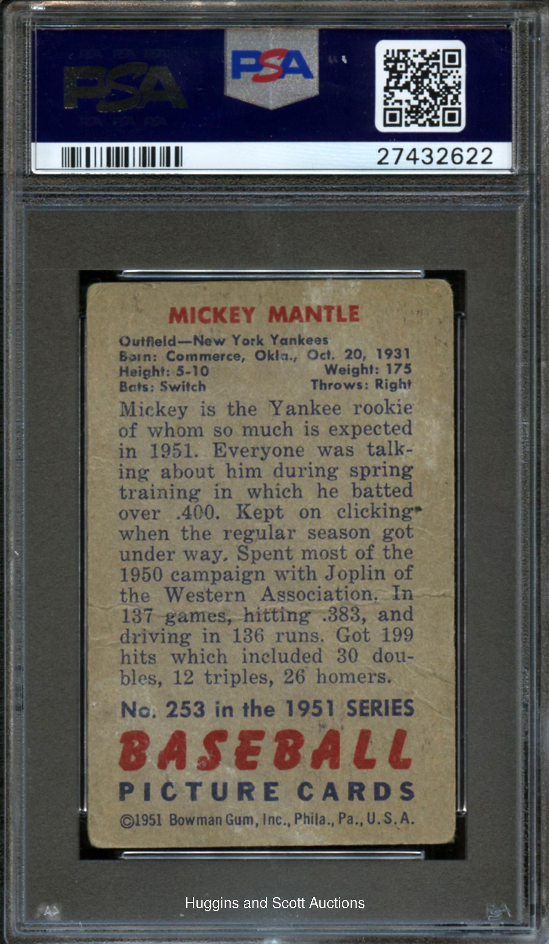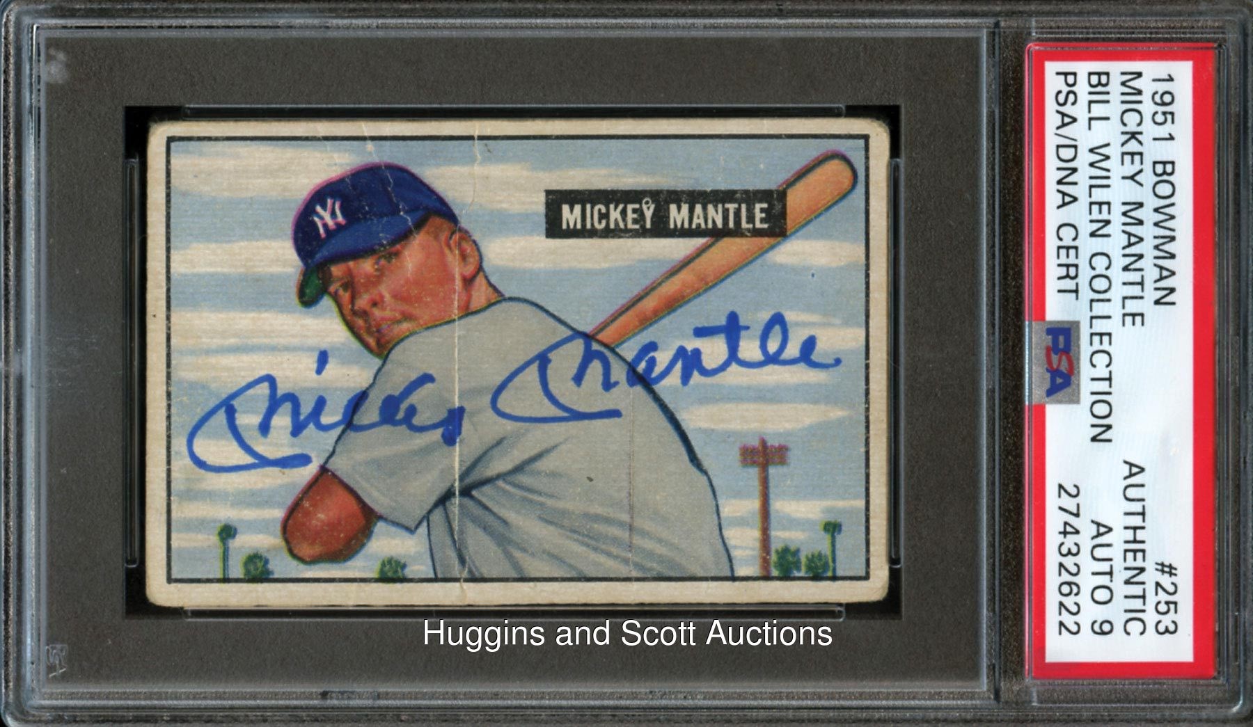 Amazing Presentation! True Mickey Mantle Hall of Fame rookie card? Check! High-Grade autograph of boyhood hero to millions? Check! One of the best signed card examples of the legend? Definitely check! Signature evaluated Authentic by PSA/DNA and encapsulated with an autograph grade of (“9”). Pick up your jaw and do what it takes to secure this monumental 1951 Bowman Baseball #253 Mickey Mantle rookie signed card. The blue Sharpie autograph of this high number is perfectly centered across the phenom’s shoulder region. There are no disruptions to the lengthy 2-3/4” endorsement. While the cardboard surface grades (FR) due to surface creasing, the ultra high-grade signature overwhelms any deficiency. Compare the quantity of signed PSA/DNA Authentic rookie examples (12 total) to unsigned copies (1,440 total) and the upside of this cornerstone will be evident! Flip provenance from the Bill Wilen Collection.