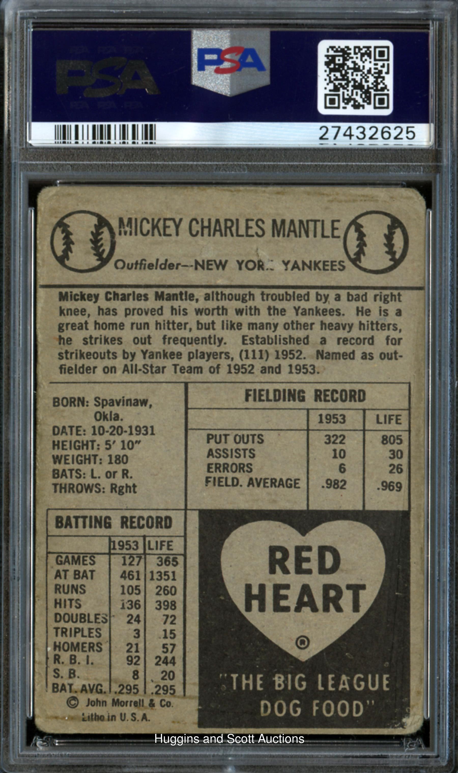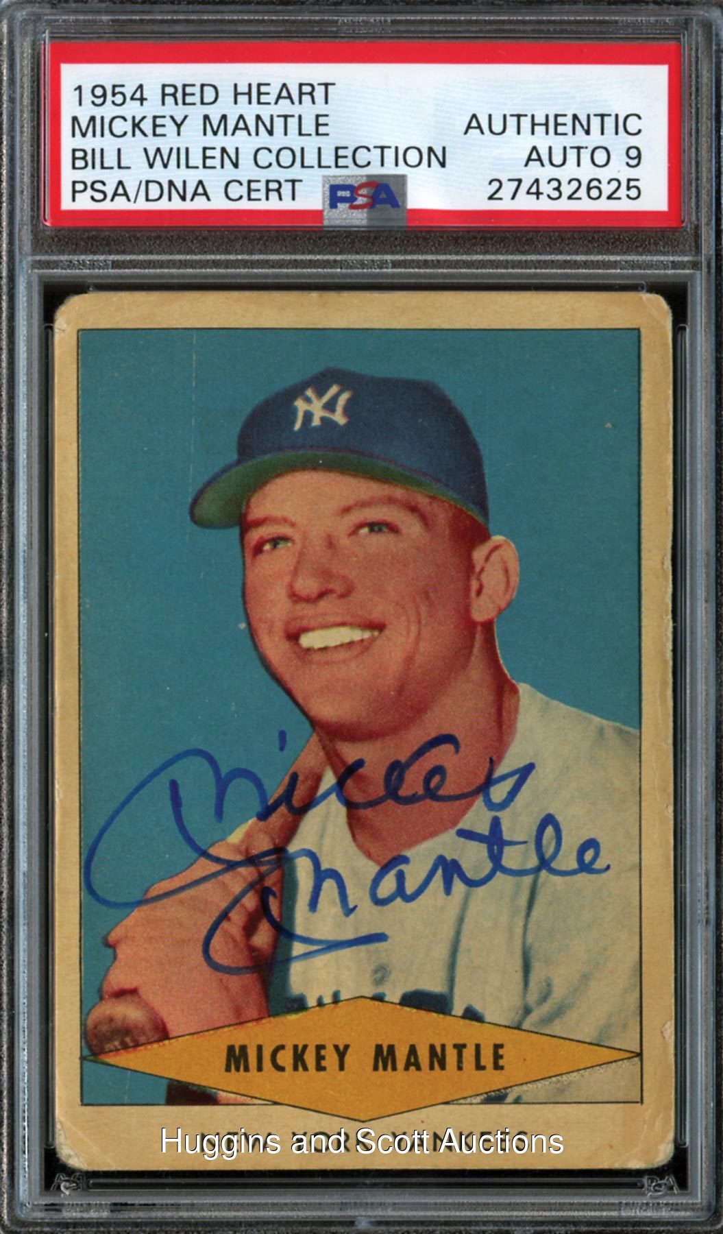 Signature evaluated as Authentic by PSA/DNA and encapsulated with an autograph grade of ("9"). Beautiful 1954 Red Heart Mickey Mantle autographed card! The large blue Sharpie endorsement is placed directly across the Hall of Famer"s neckline. While the cardboard surface presents in (GD) condition, the instantly recognizable autograph shoots this oddball card"s desirability to the next level. Flip provenance from the Bill Wilen Collection.
