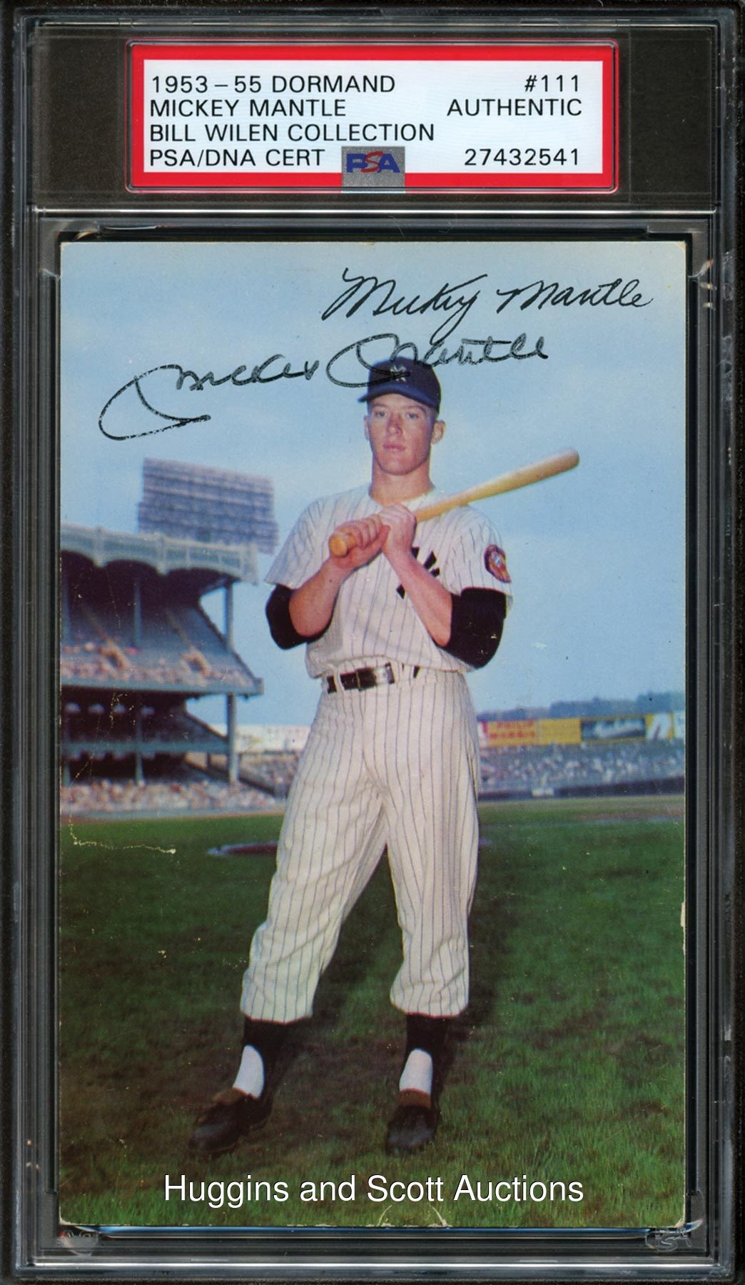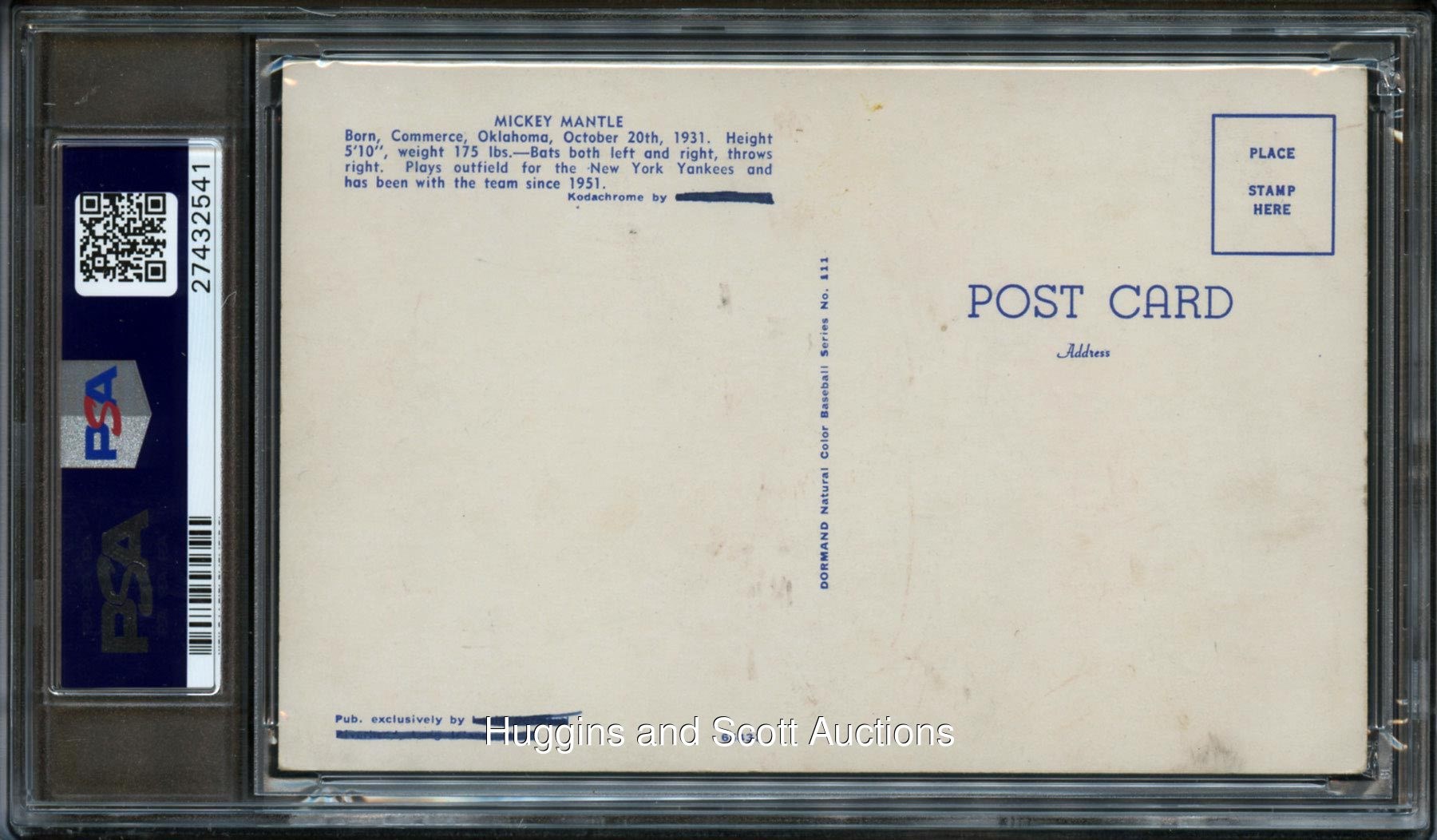Encapsulated and declared Authentic by PSA/DNA. "The Mick" is profiled against a historic Yankee Stadium backdrop with this 1953-55 Dormand 3-1/2 x 5" postcard. The postcard grades in (FR) condition due to reverse writing and features a ("7") strength black marker autograph beneath the printed facsimile. A scarce signed version of this early Mantle collectible.
