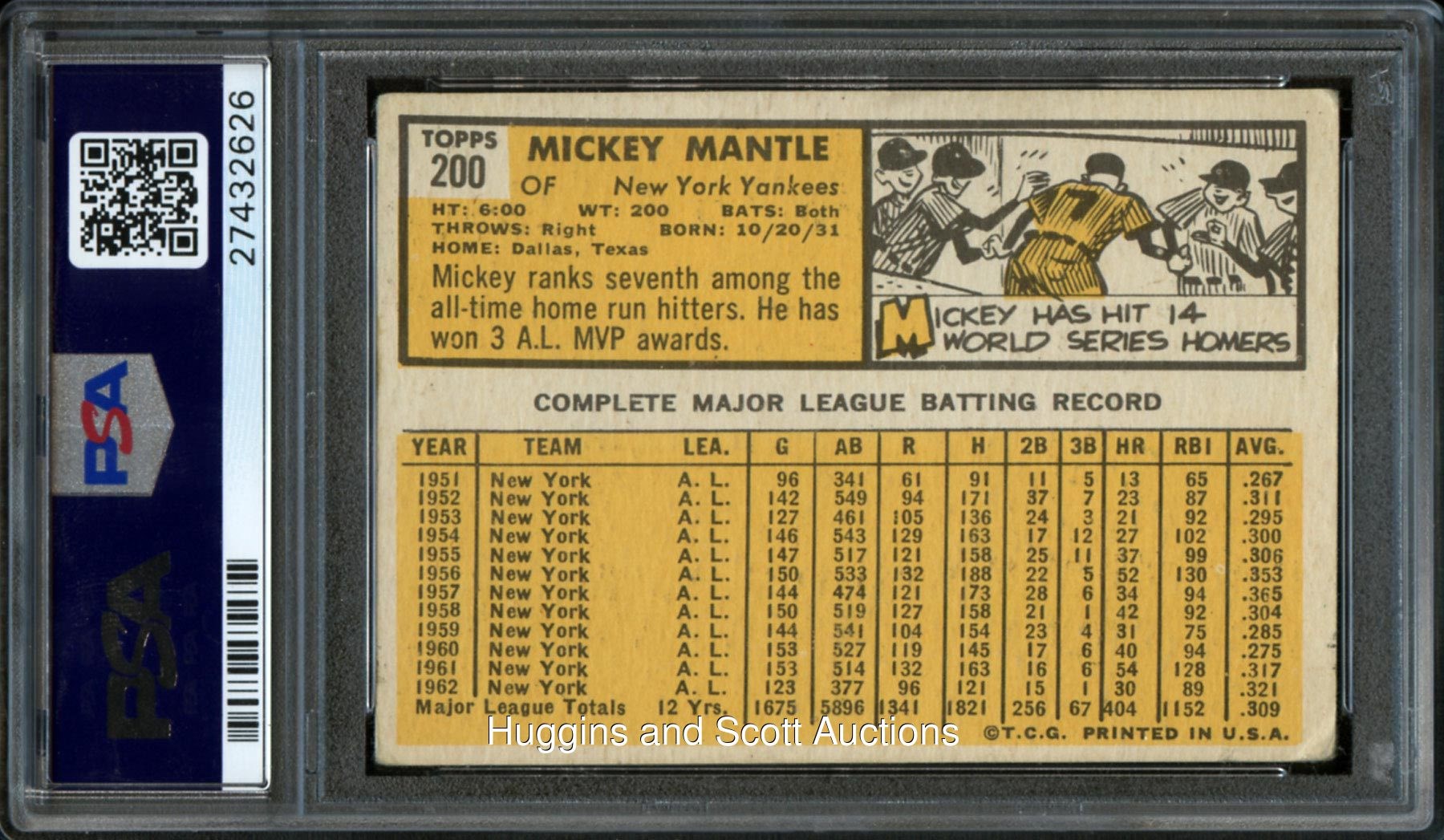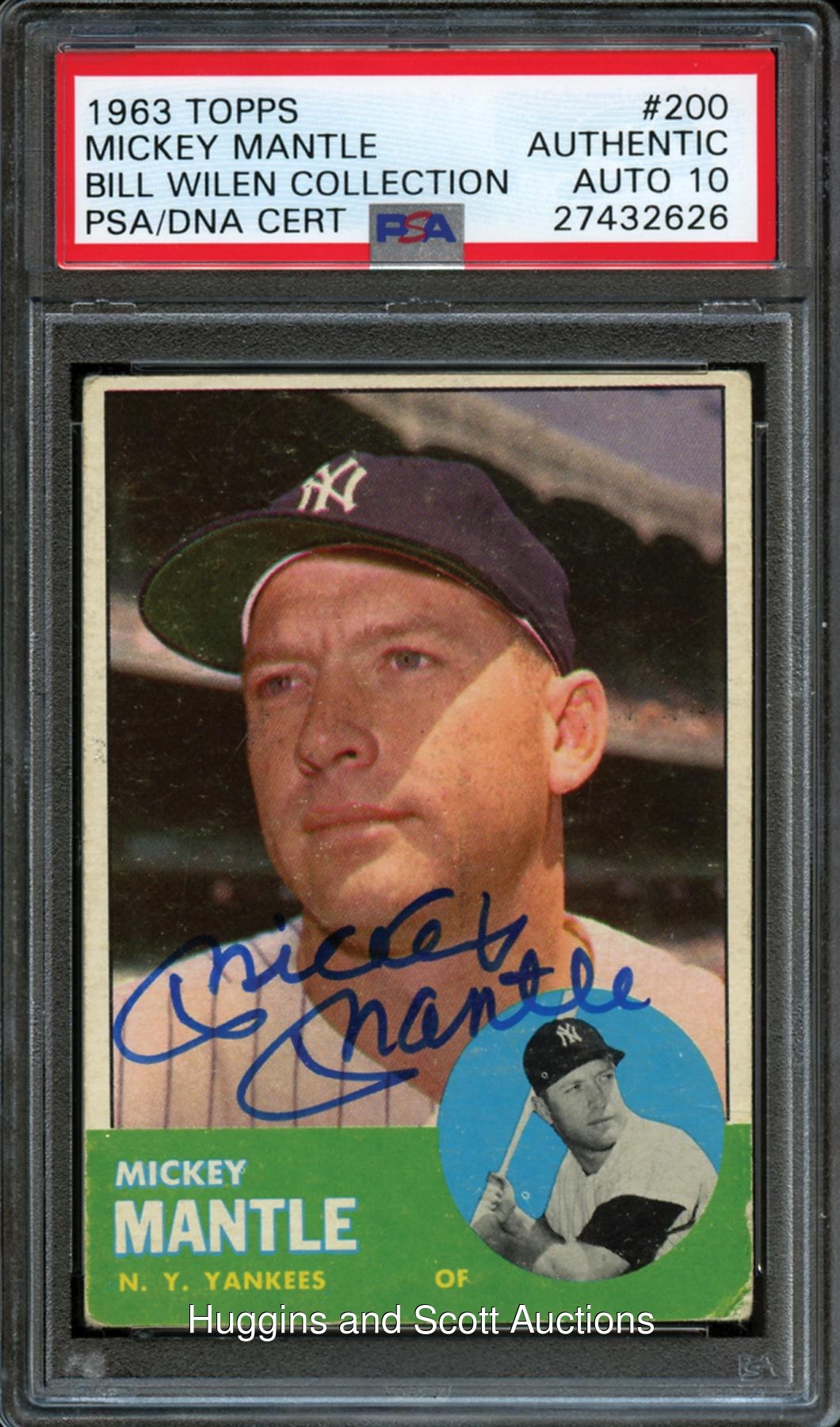 Signature evaluated as Authentic by PSA/DNA and encapsulated with a ("10") autograph grade! Flawless 1963 Topps Baseball #200 Mickey Mantle signed card. The centered blue Sharpie autograph is accurately placed across the slugger"s shoulder region. Executed with perfect penmanship while the crease-free card grades in (GD) condition. Flip provenance from the Bill Wilen Collection.