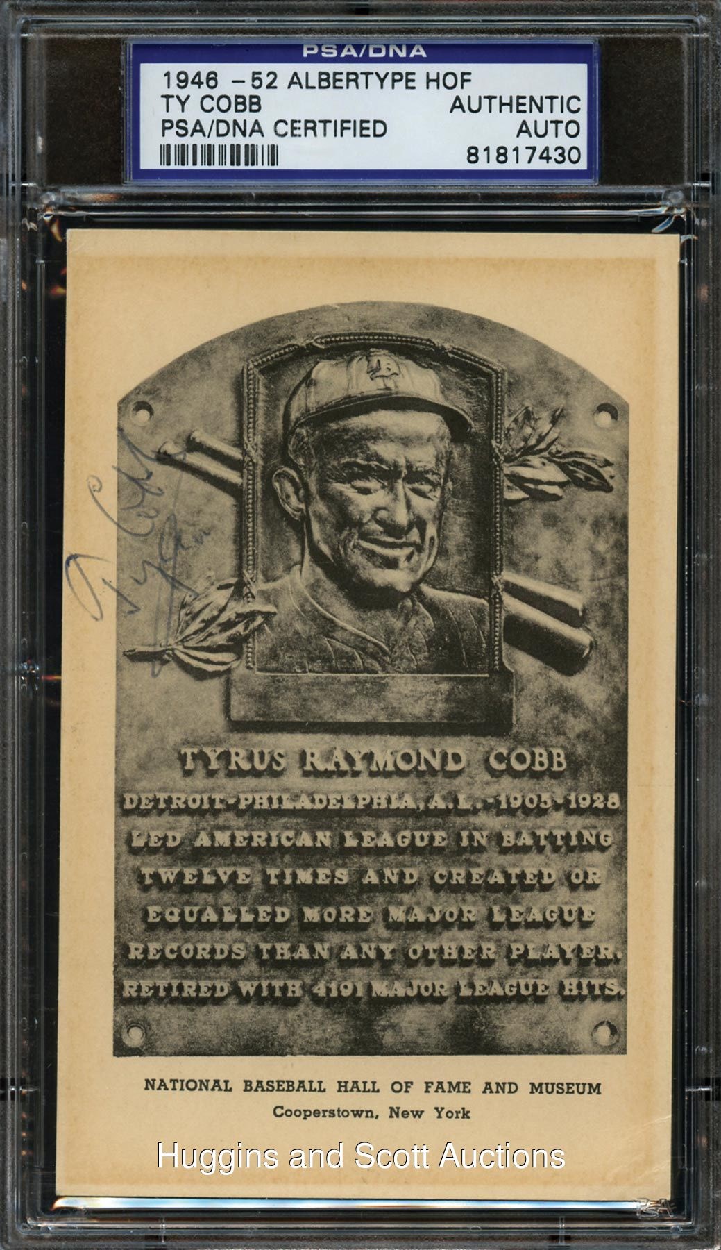 Type: 1946-52 Albertype Signatures: "6-7" on front, "8" on reverse Condition: VG-EX w/toning. Notes: In 2014, an earlier Cobb signed example (1939-43 Sepia Type 2) sold at auction for over $6,500. This Albertype has the advantage of being twice-signed. Cobb died in 1961. This item has a reserve (estimated value $2,000-$3,000).