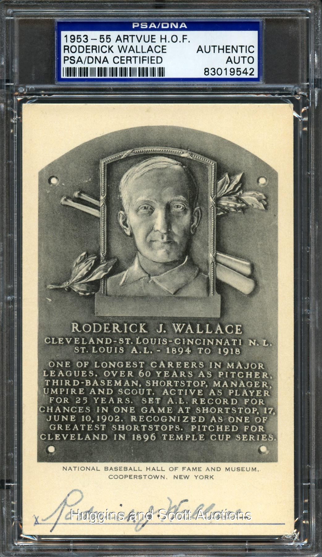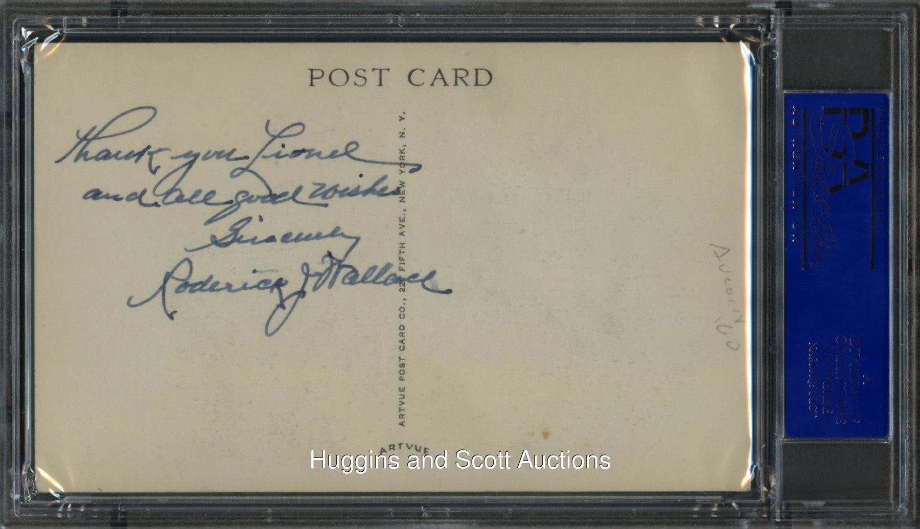 Type: 1953-55 Artvue Signature: "7" on front, "8" on reverse ("Thank you, Lionel / and all good wishes / Sincerely / Roderick Wallace") Condition: EX-MT Notes: In all likelihood, the recipient was legendary collector Lionel Carter. Wallace was inducted in 1953 and died in 1960. This item has a reserve (estimated value $2,000-$3,000).