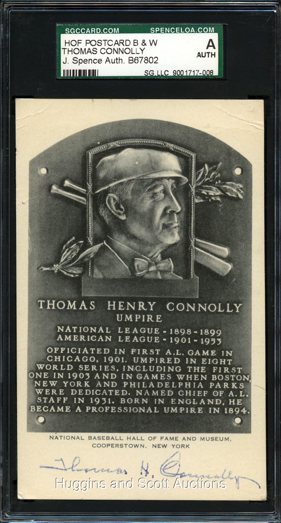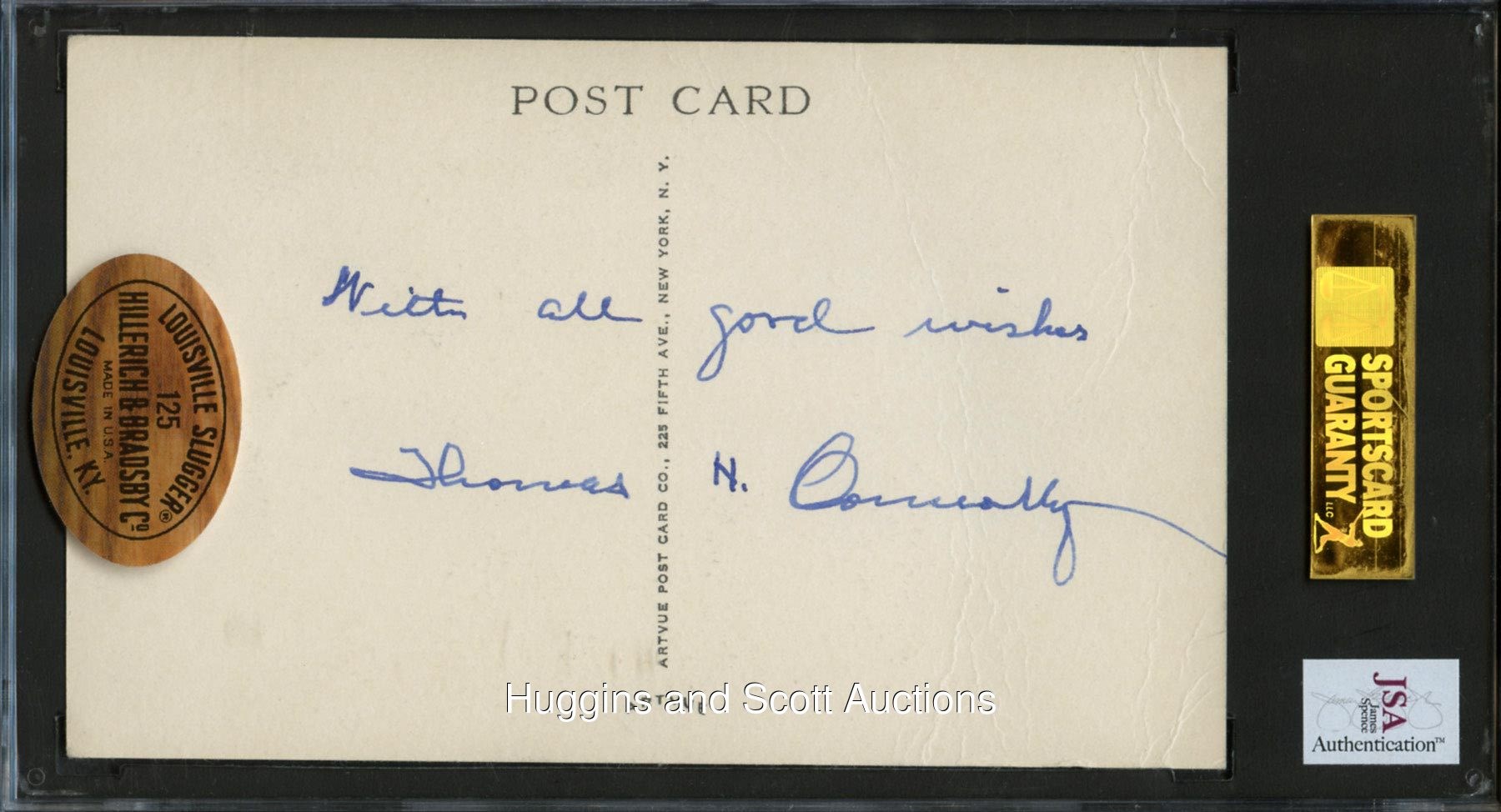 The Father of American League Umpiring, Tom Connolly grew up a cricketer in England and wasn"t introduced to baseball until he immigrated to the U.S. at age 15. From that point on he devoted his life to our national pastime. Among many milestones are his umpiring at the first A.L. game, the first World Series, and the inaugural games at Fenway Park and Yankee Stadium. There were eight World Series in all during his five-decade career, plus three no-hitters and one perfect game (Addie Joss). Connolly also mentored young umpires and young players alike. He was elected to the Hall of Fame in 1953, just eight years before his death at age 90. No doubt due to this small signing window—not to mention the then-lower demand for umpire autographs—only about a handful of Connolly signed plaque postcards are known to exist. This double-signature example features "6-7" script strength on front and "9" on the reverse. Condition of the 1953-55 Artvue postcard is GD/VG. This item has a reserve (estimated value $10,000-$12,000).