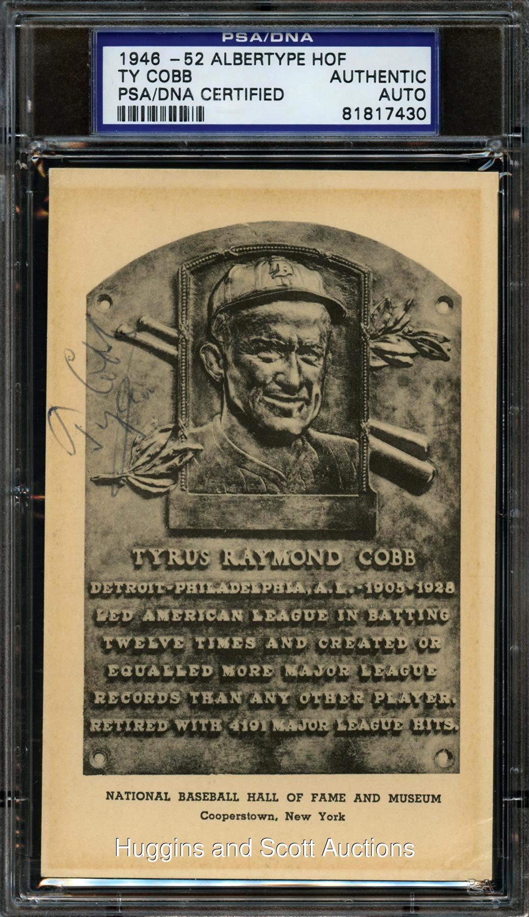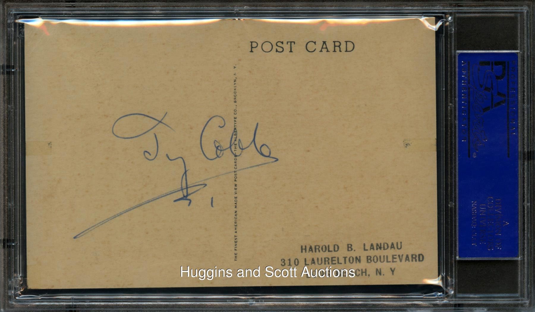 Type: 1946-52 Albertype Signatures: "6-7" on front, "8" on reverse Condition: VG-EX w/toning. Notes: In 2014, an earlier Cobb signed example (1939-43 Sepia Type 2) sold at auction for over $6,500. This Albertype has the advantage of being twice-signed. Cobb died in 1961. This item has a reserve (estimated value $1,500-$3,000).