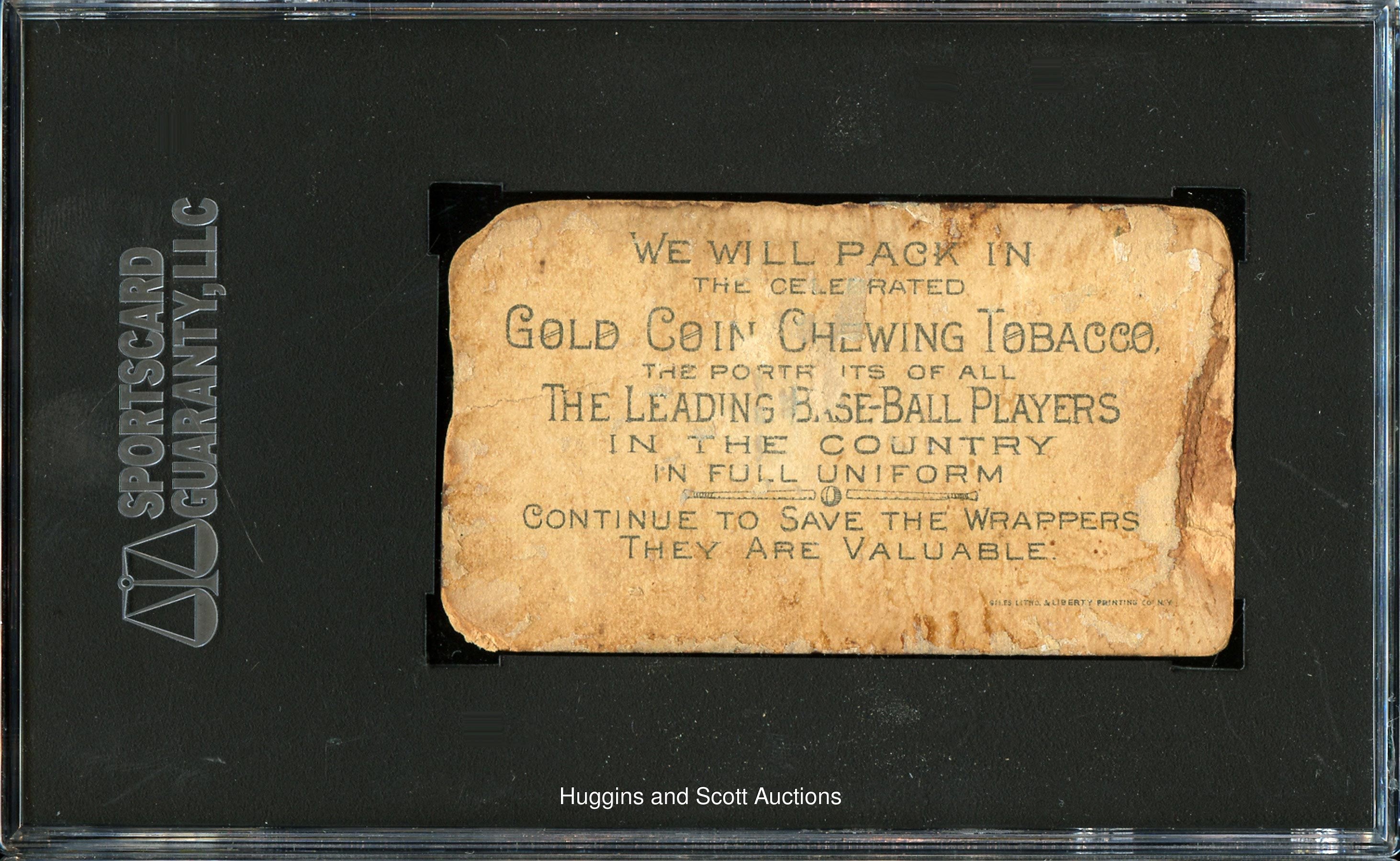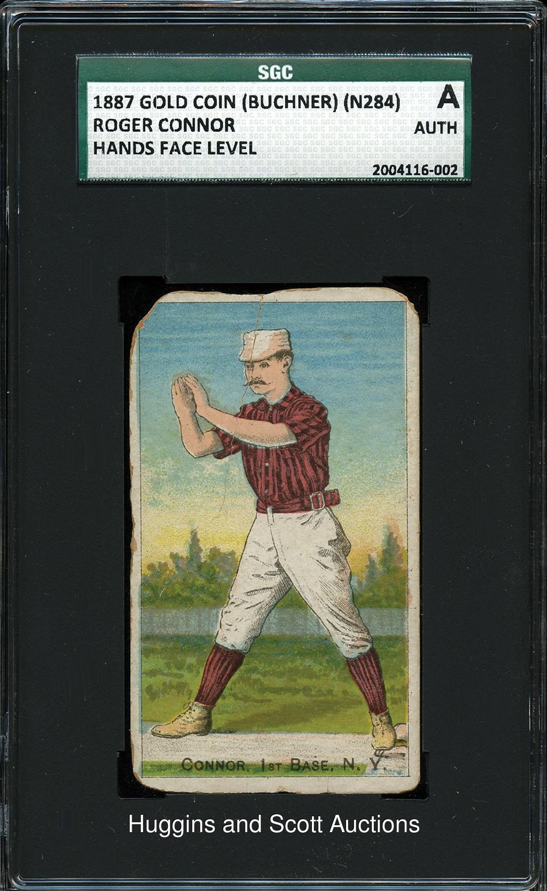 Nineteenth Century Hall of Fame Type Card! Graded Authentic by SGC. Genuine 1887 N284 Buchner Gold Coin Roger Connor (Hands Face Level) variation. Despite a combination of reverse paper loss/residue along with front surface creasing, this thick slab of cardboard projects brilliant surface colors against an early ballpark setting.