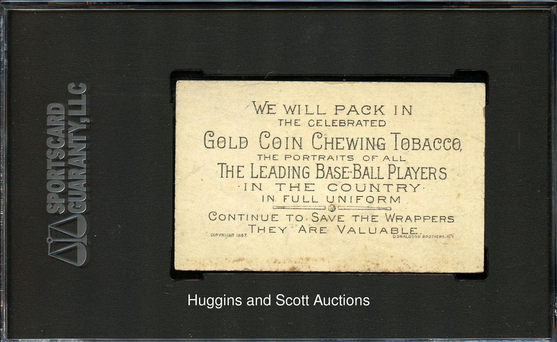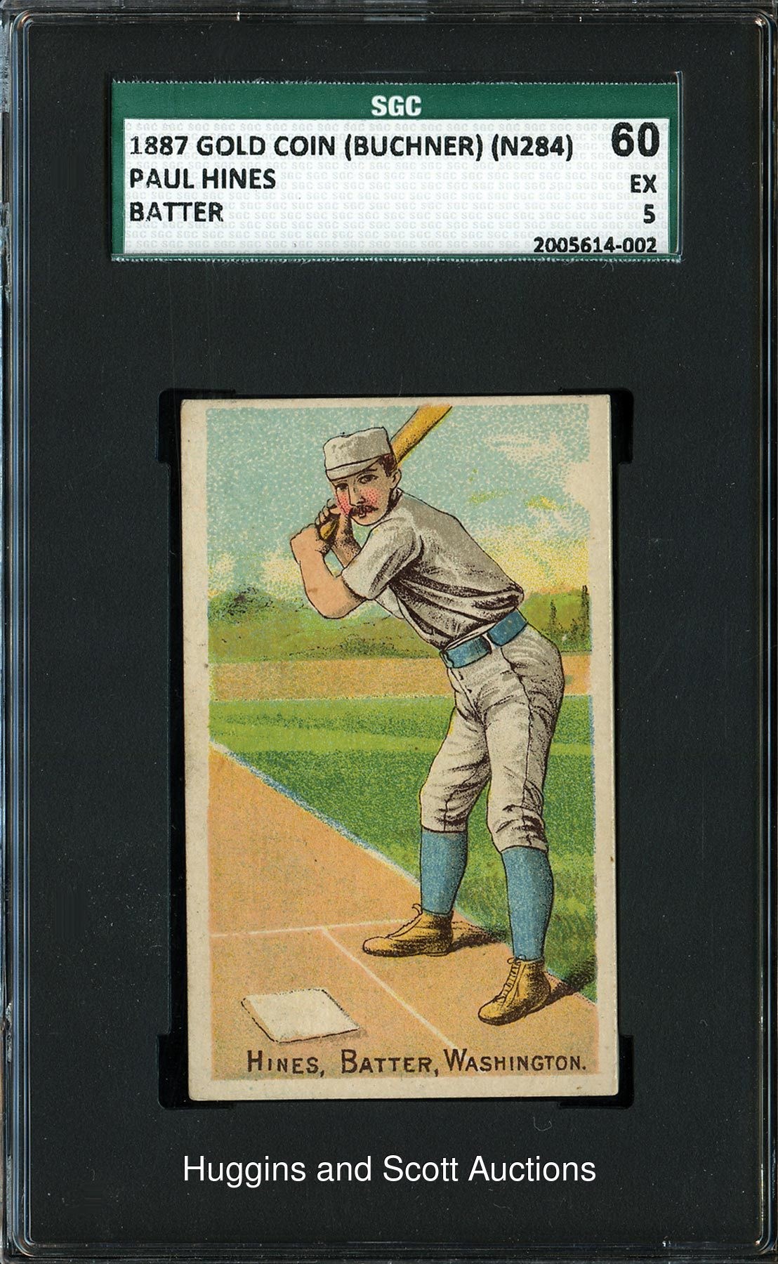 Graded 60 EX 5 by SGC. Never heard of Paul Hines? He won the Triple Crown in 1878 and was a two-time batting champion for the Providence Grays. The star squares up on his 1887 N284 Buchner Gold Coin (Batter) pose. This 131-year-old card exhibits well-formed corners, creamy edges and intense color sequences against a period ballpark setting. Survives as 1 of 3 at the grading level with none better!