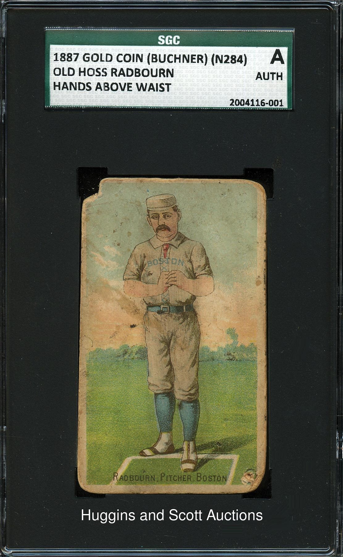 Hall of Fame Type Card! Graded Authentic by SGC. Charles (Old Hoss) Radbourn is captured just a decade prior to his untimely death on the offered 1887 N284 Buchner Gold Coin (Hands Above Waist) pose. The pitching legend is printed on a sturdy slab of antique cardboard with a portion of the upper left corner missing and a pinhole located on the lower right corner. The moderately soiled reverse is blank.