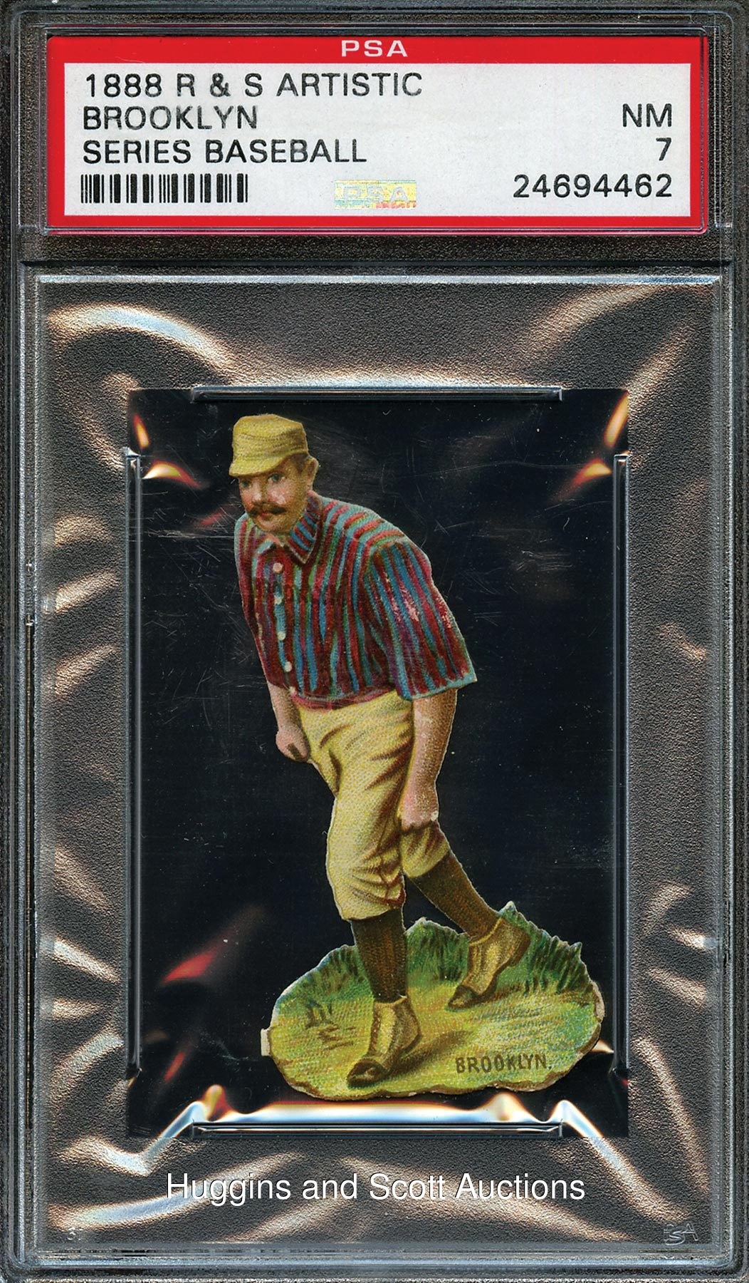 Graded NM 7 by PSA. This fragile nineteenth century die-cut depicts a nondescript player from the Brooklyn squad. Of the 29 total graded by PSA, this antique survives as 1 of 2 at the grading level with only 6 better.