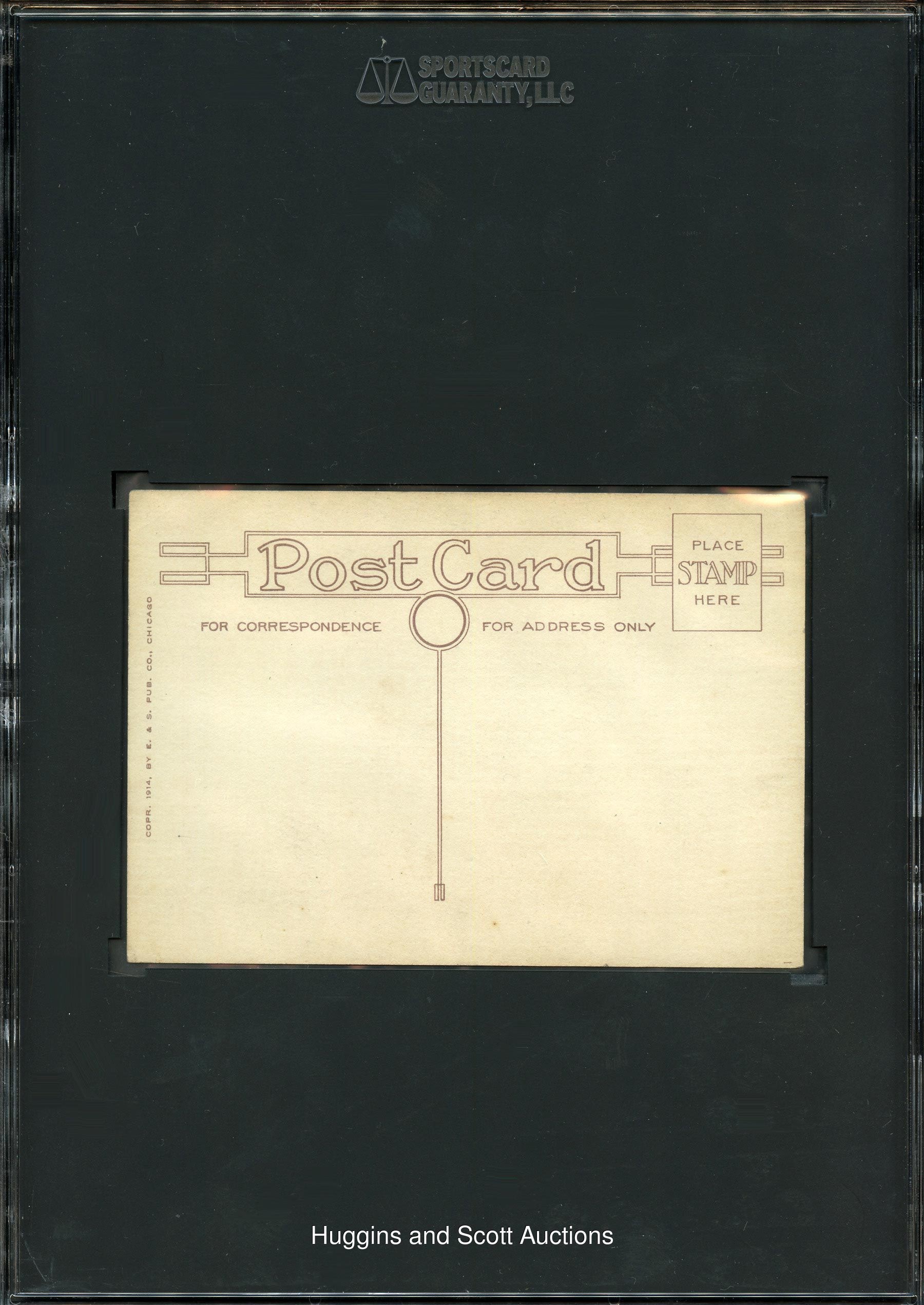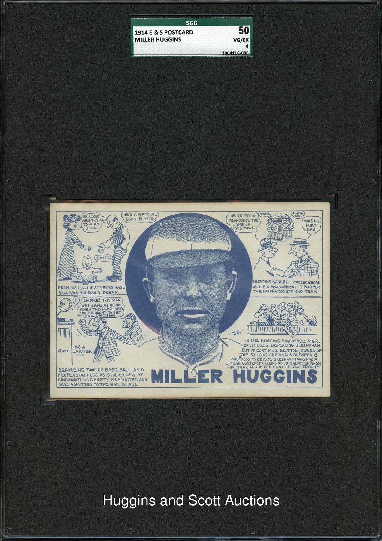 Only Graded of Hall of Famer! Graded 50 VG-EX 4 by SGC. Published by E & S Publishing of Chicago, the offered postcard picturing Miller Huggins is "a must" for type card enthusiasts. The 5-1/2 x 3-3/4" correspondence piece features a blue portrait of Huggins surrounded by cartoon texts with anecdotes relating to his career. Despite barely noticeable perimeter wear including a slight crease near the upper right corner, the eye appeal of the World War I-era piece overwhelms any technical deficiencies. The reverse is unmarked.