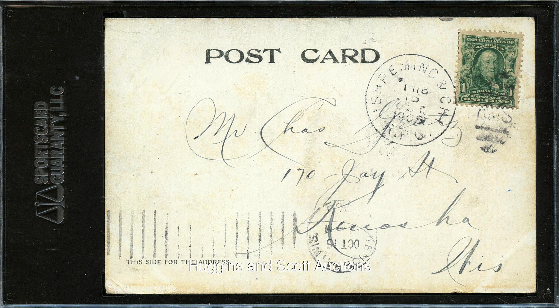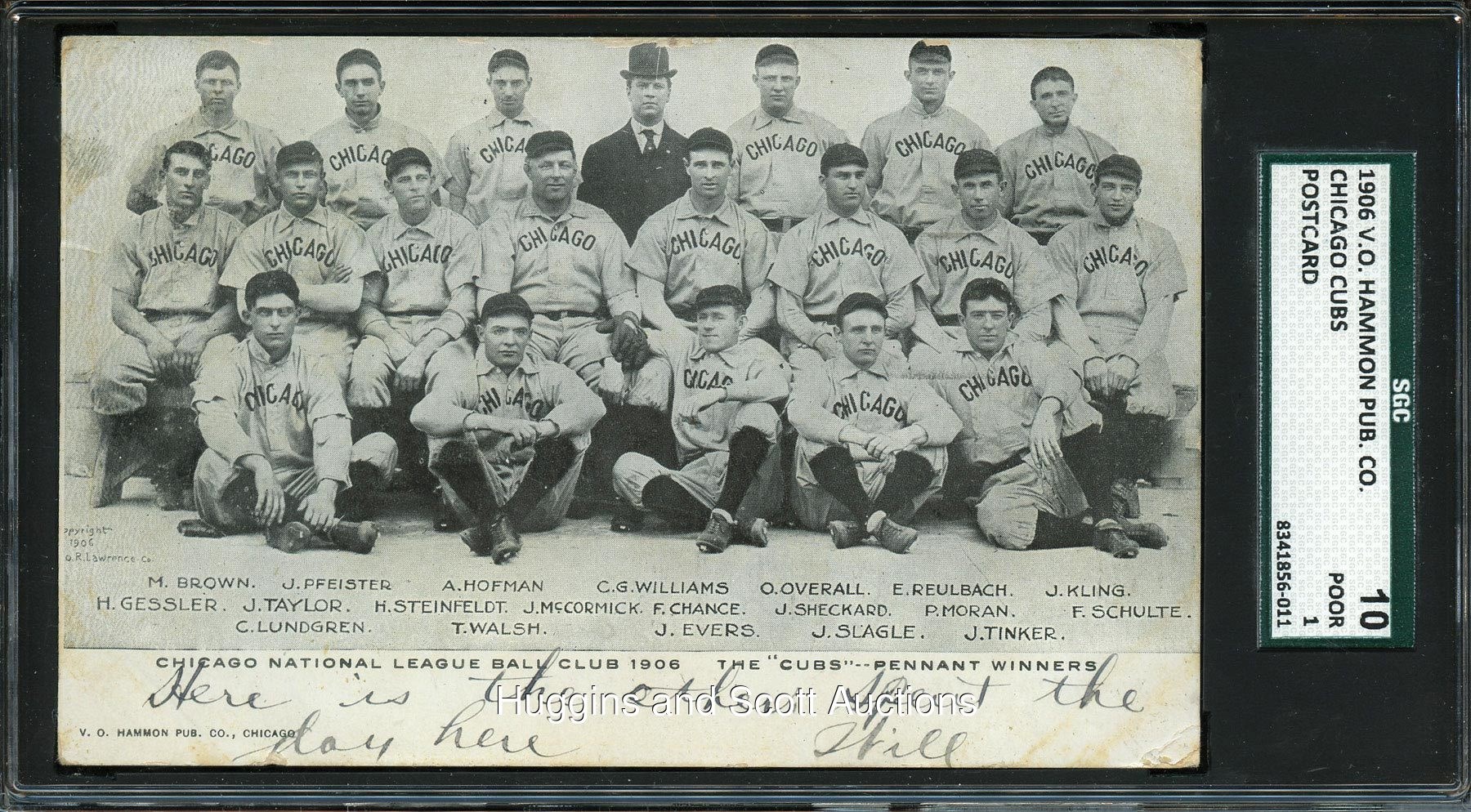 Graded 10 Poor 1 by SGC. There is little "poor" with the offered 1906 V.O. Hammon Pub. Co. Chicago Cubs postcard. The pennant winners are captured in timeless glory on this correspondence piece which pictures (20) members of the squad including Hall of Famers Brown, Chance, Evers and Tinker. Aside from written notations and postage use consistent with its overall grade, the surfaces are absent of any acute wear.