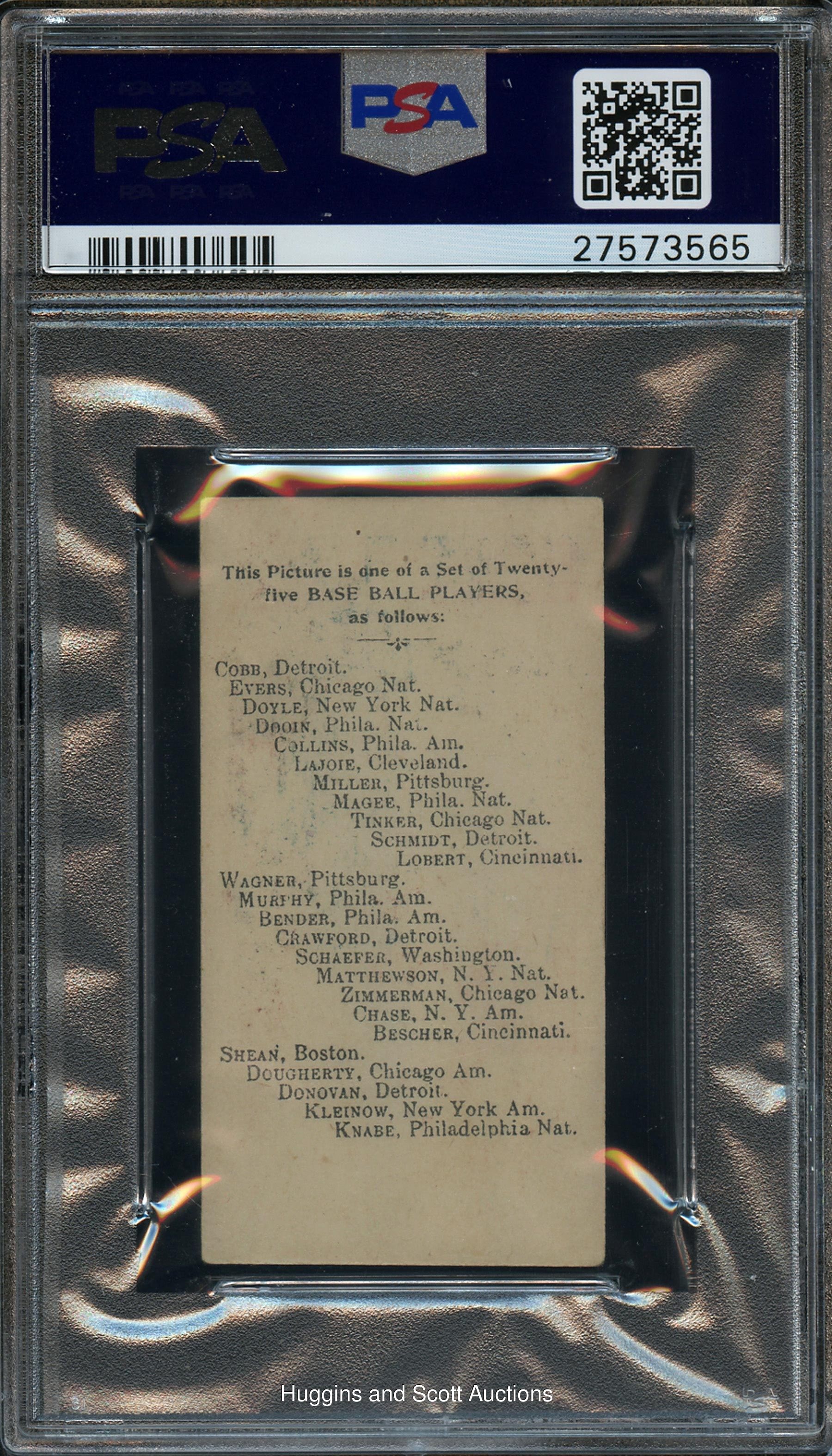 Graded VG-EX+ 4.5 by PSA. Only two dozen total copies of the offered 1909 E102 Anonymous Joe Tinker have been evaluated by the grading service. This Hall of Fame shortstop features relatively strong corners, creamy edges and radiant surface hues. The "Set of 25" checklist back is unmarked and clean. Survives as 1 of 2 at the grading level with only two better.