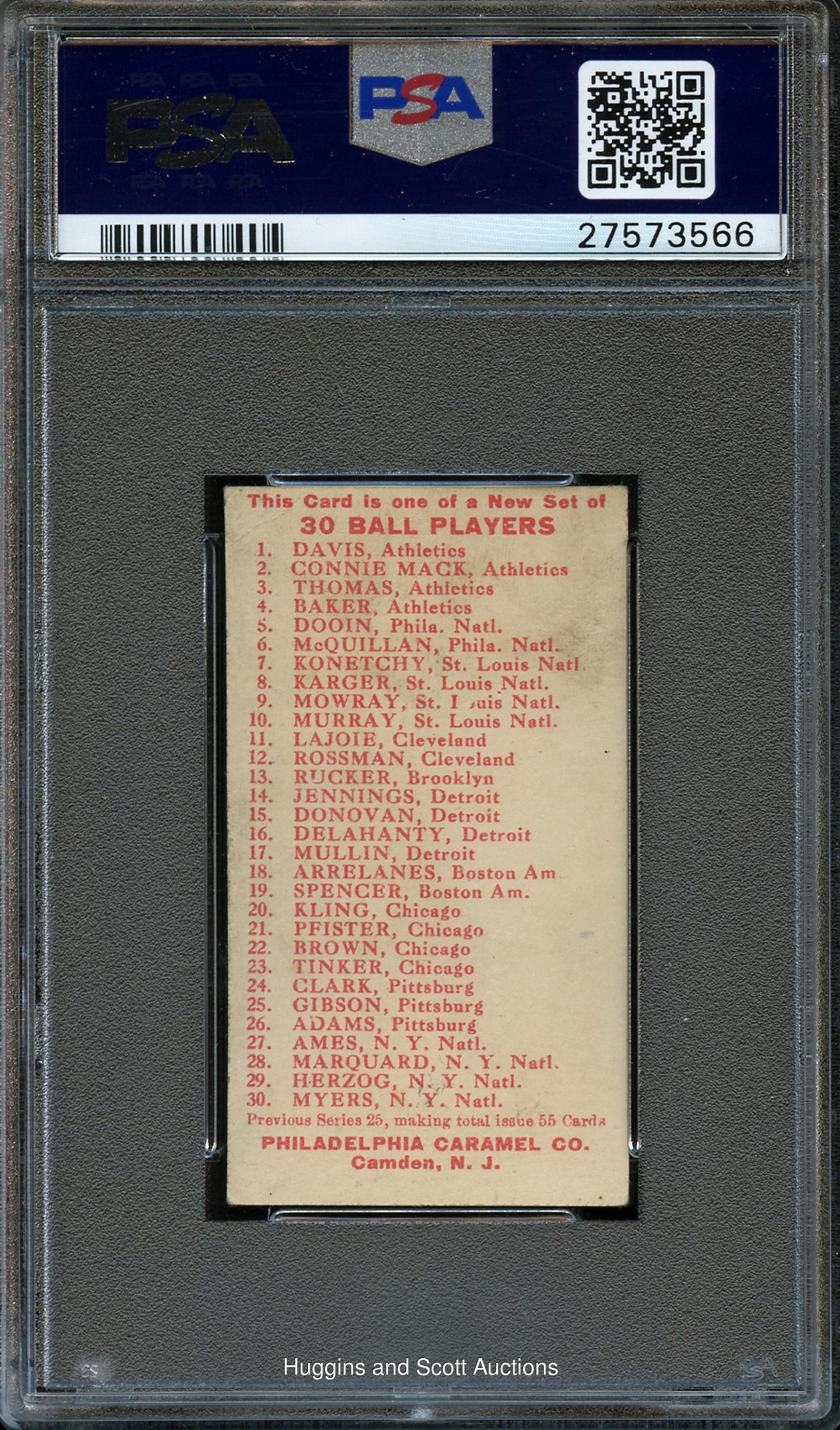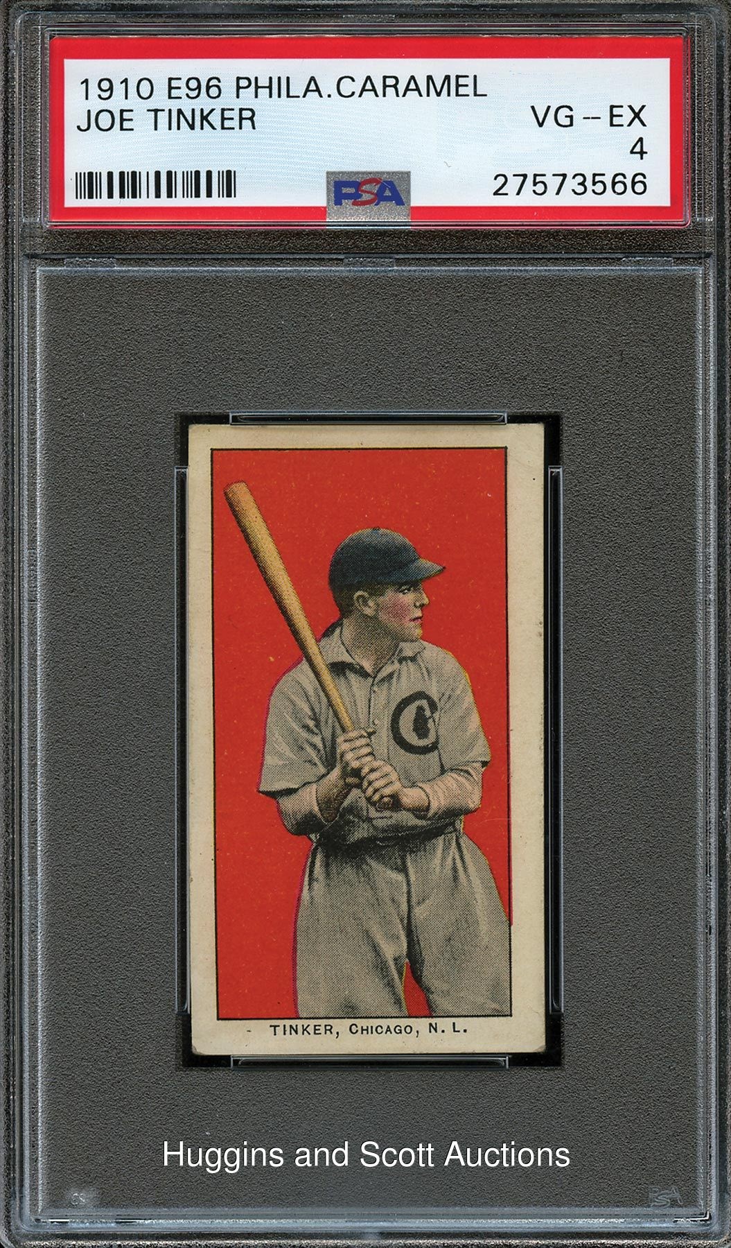 Graded VG-EX 4 by PSA. Radiant 1910 E96 Philadelphia Caramel Joe Tinker. This strong copy of the Hall of Famer exhibits only modest peripheral wear associated with its overall judgment. The red text checklist reverse is unmarked.