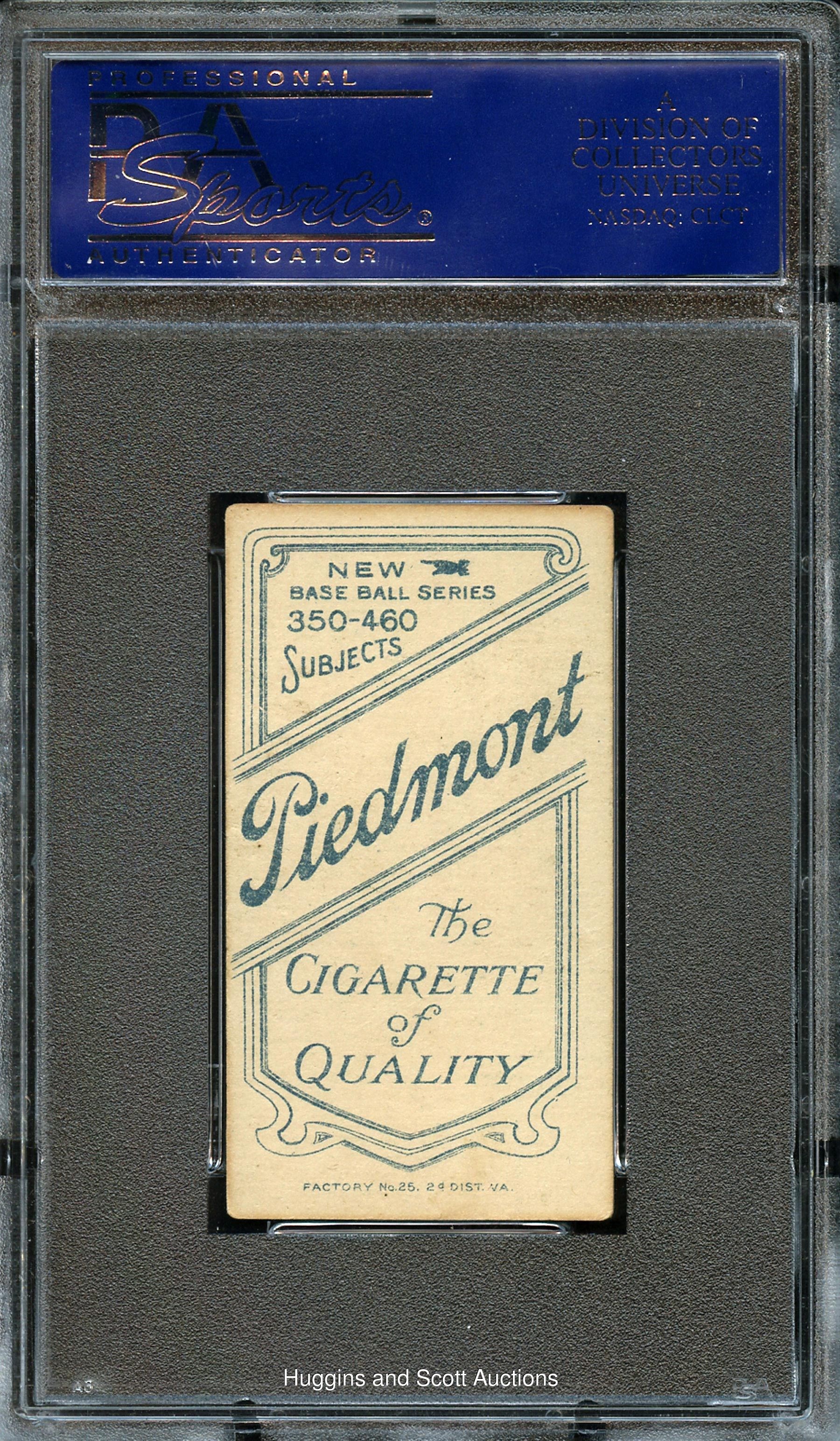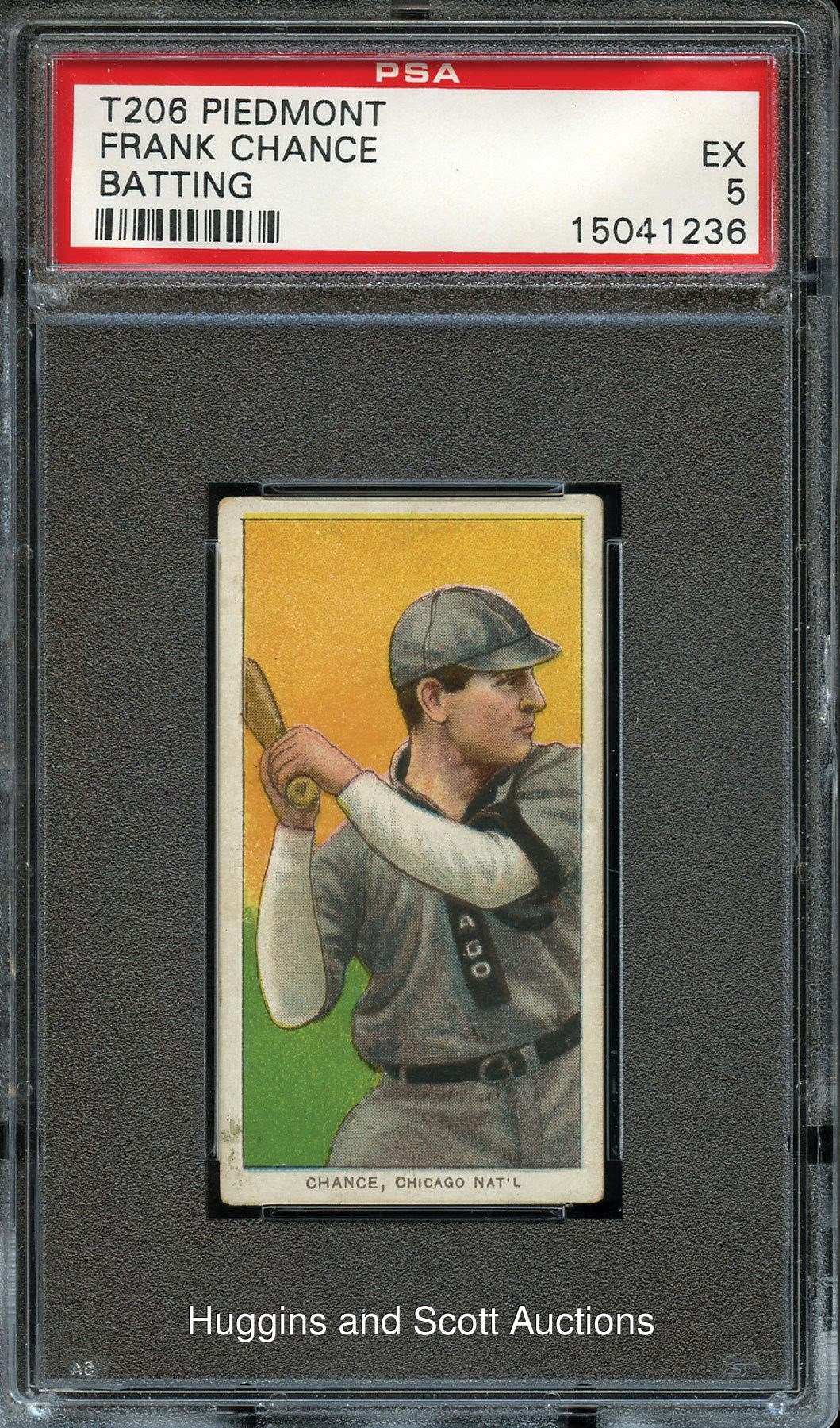 Graded EX 5 by PSA with a Piedmont advertising back. "The Peerless Leader" squares up on this 1909-11 T206 White Borders Frank Chance (Batting) pose. A well centered specimen which exhibits evenly worn corners, relatively clean edges and a perfectly contrasted surface illustration. The reverse is problem-free.