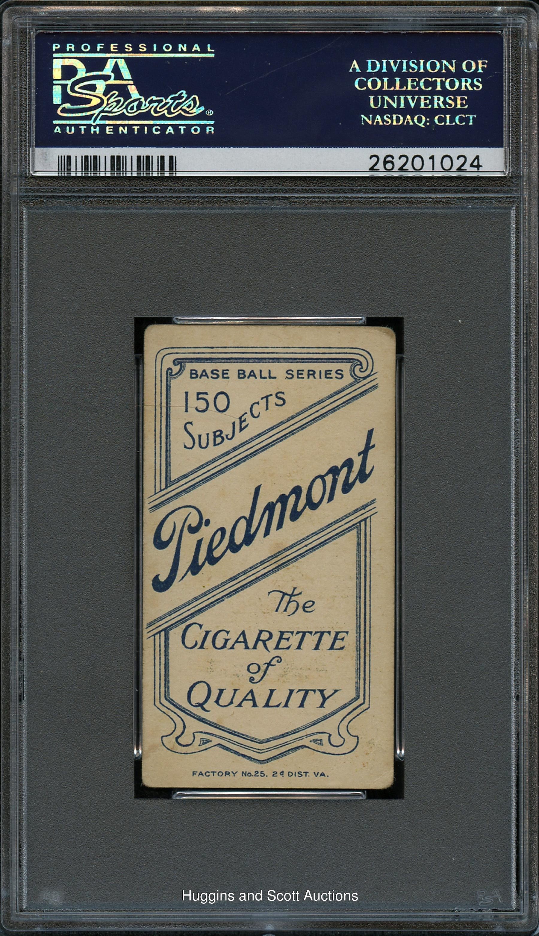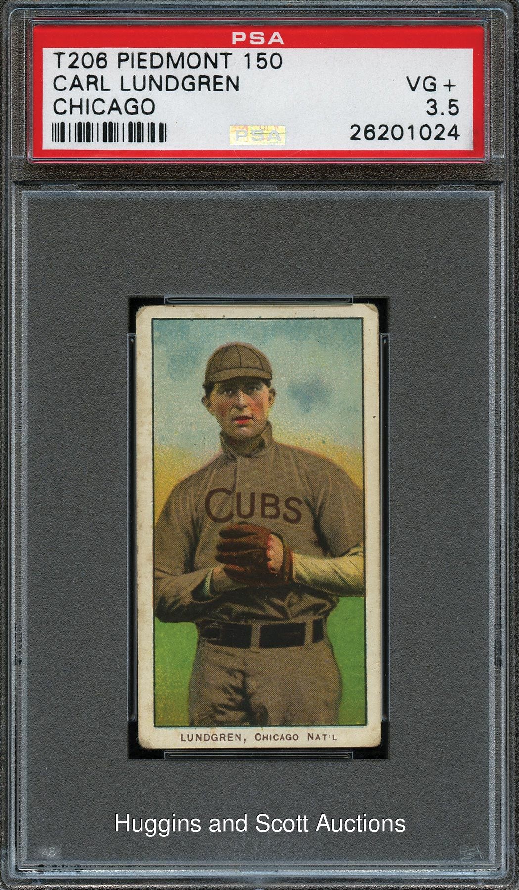 Graded VG+ 3.5 by PSA. Tough 1909-11 T206 White Borders Carl Lundgren (Chicago) team variation. This crease-free antique has sustained moderate corner/edge wear and is backed by a slightly soiled Piedmont 150 Subjects advertising back.