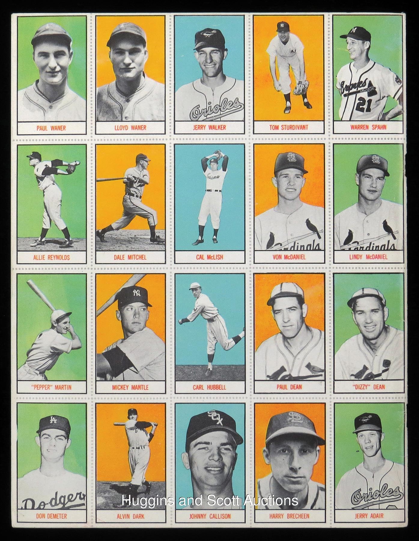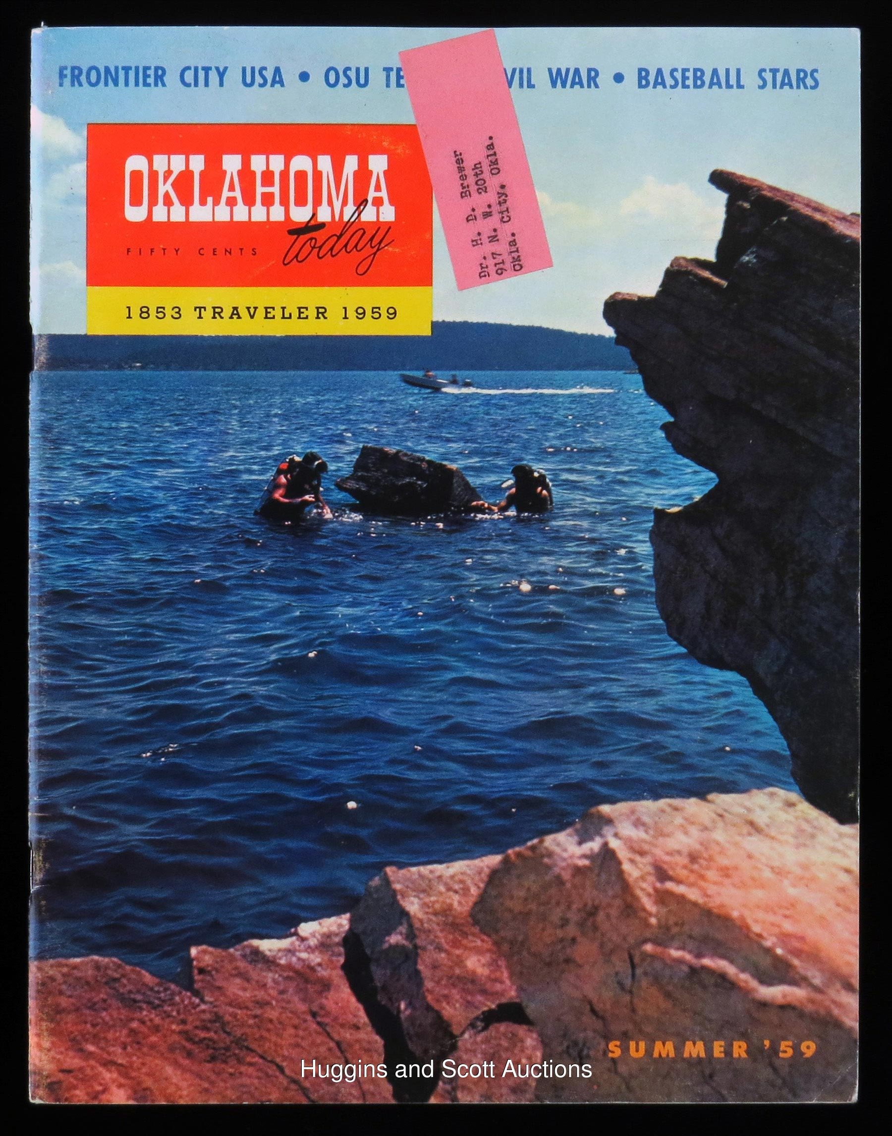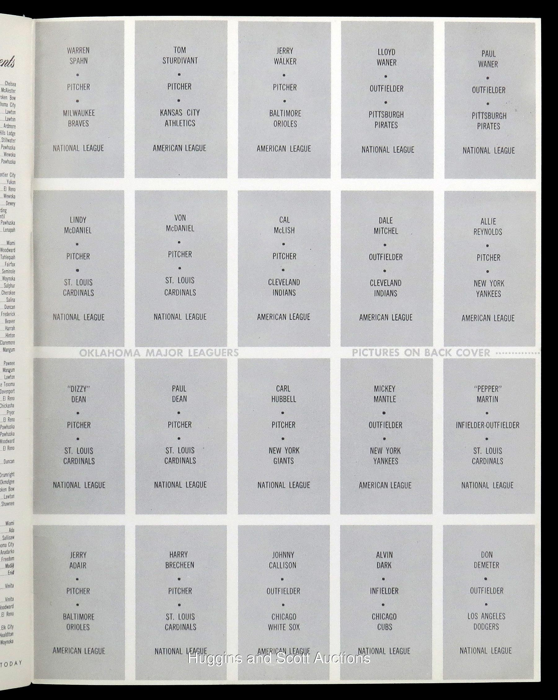 A hotbed for Major League baseball stars, Oklahoma beamed with pride over its native sons and let the world know about it in this Summer 1959 issue of Oklahoma Today magazine. On the back cover, (20) Oklahoma-born stars are portrayed on an uncut sheet of baseball cards with black-and-white likenesses and pastel-colored backgrounds. Among the notables are Dizzy and Paul Dean, Carl Hubbell, Mickey Mantle, Allie Reynolds, Warren Spahn and Lloyd and Paul Waner. With printed identifiers on the reverse (inside back cover), the page presents (NM-MT).