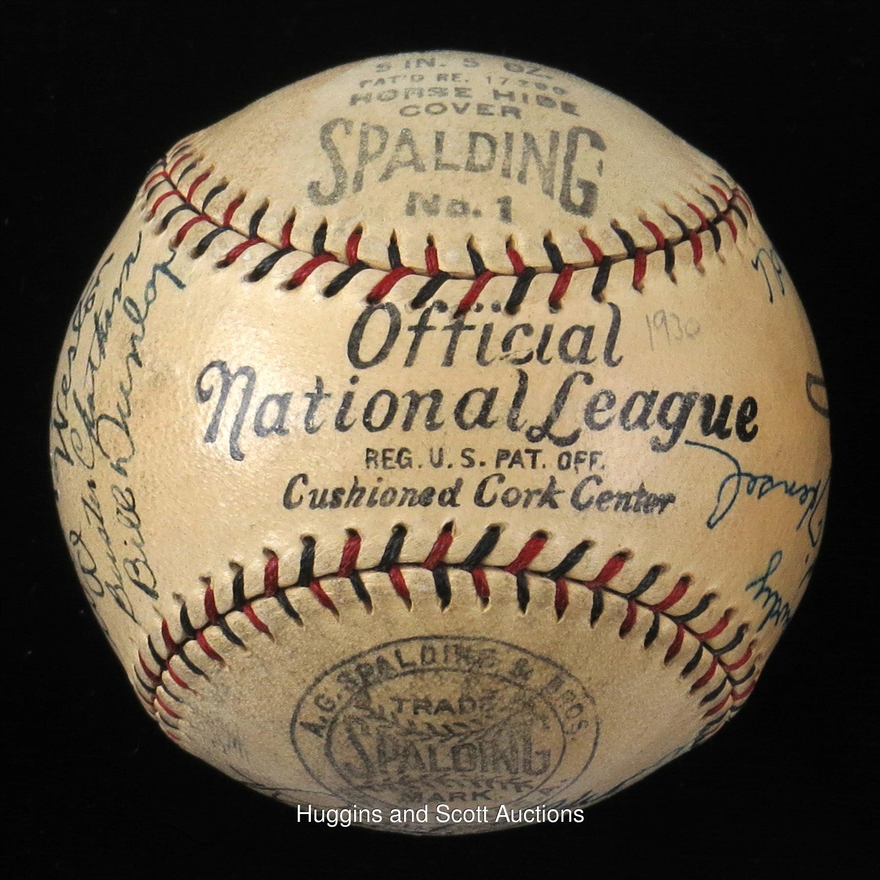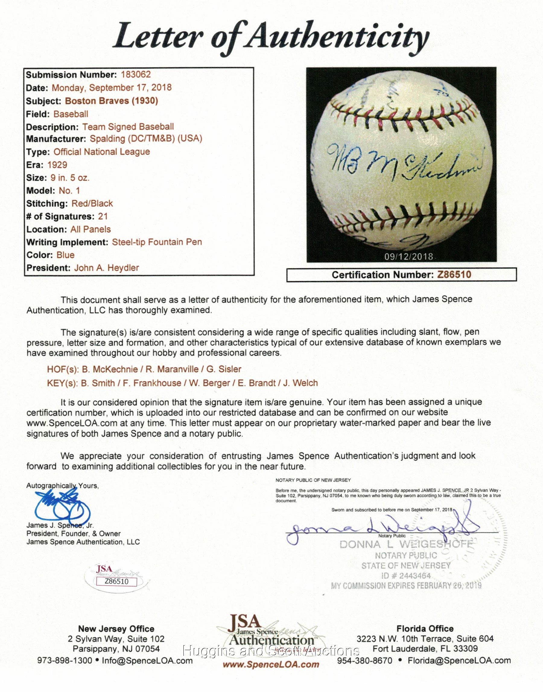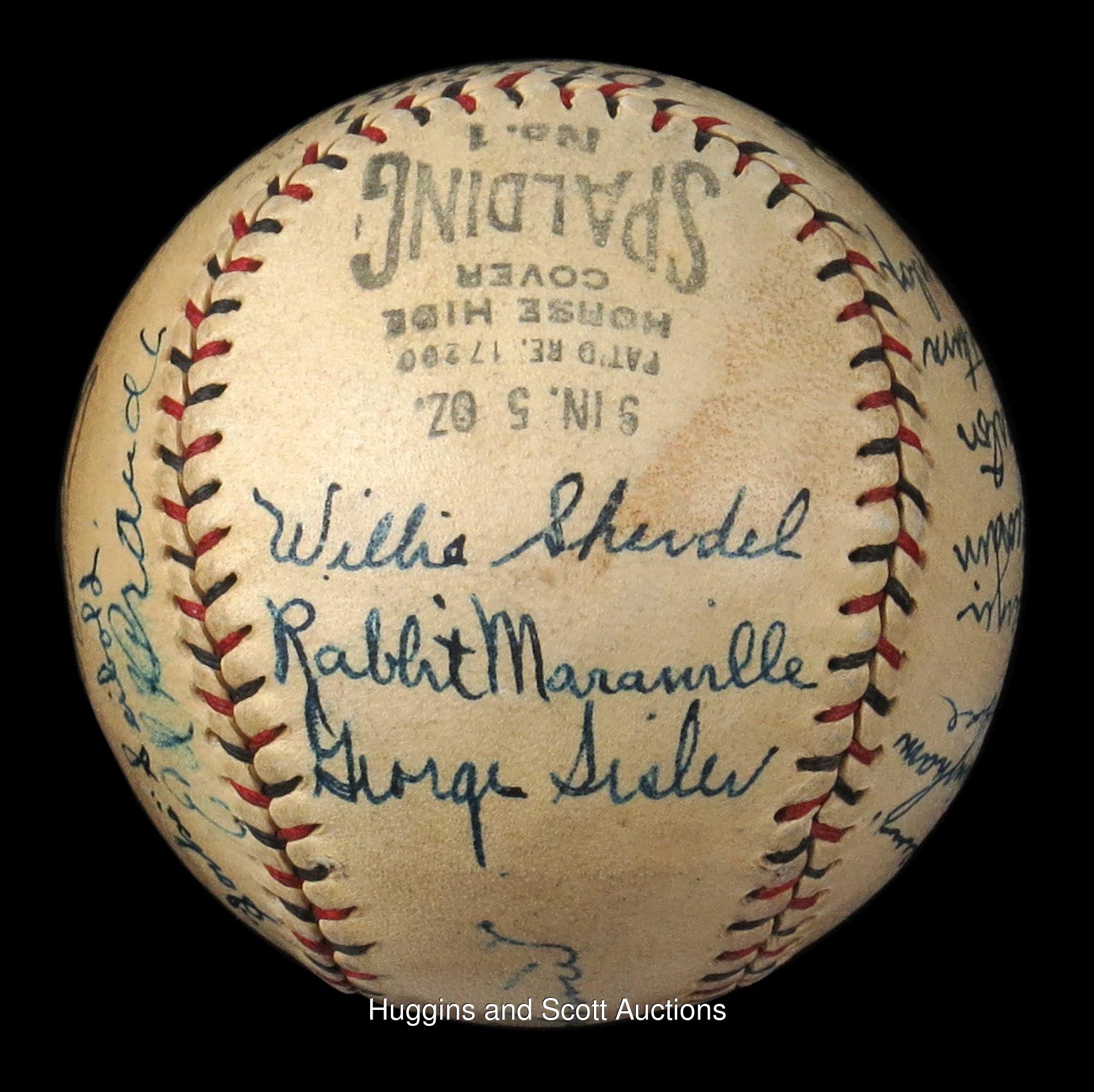 Gorgeous George Sisler"s career can of course be divided into pre-1923 and post-1923—either side of the sinus condition that damaged his optic nerve. Yet somehow, even though his performance dropped off considerably, Sisler still managed to bat over .300 year in and year out—including this, his final campaign of 1930. The medium-toned ONL (Heydler) ball features "8-10" signatures. Sweet Spot: McKechnie North Panel: Hank Gowdy, Ken Jones, J. Hensel, Socks Seibold, Ed Brandt South Panel: Johnny Neun, Bruce Cunningham, Fred Frankhouse, Walter Berger, Bill Cronin, Al Weston, Buster Chatham, Bill Dunlap West Panel: Randy Moore, Fred Maguire, Bob Smith, Jim Welch East Panel: Bill Sherdel, Maranville, Sisler Full LOA from JSA.