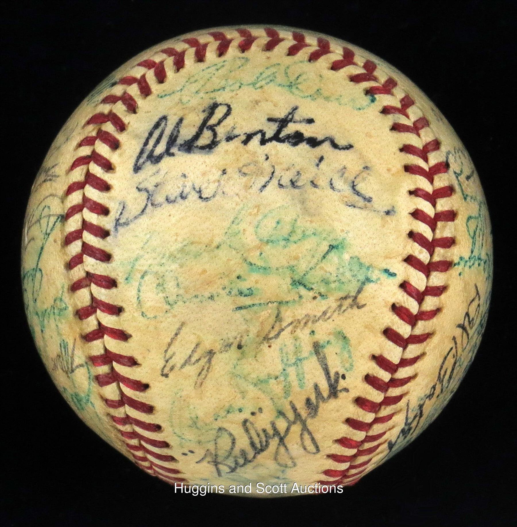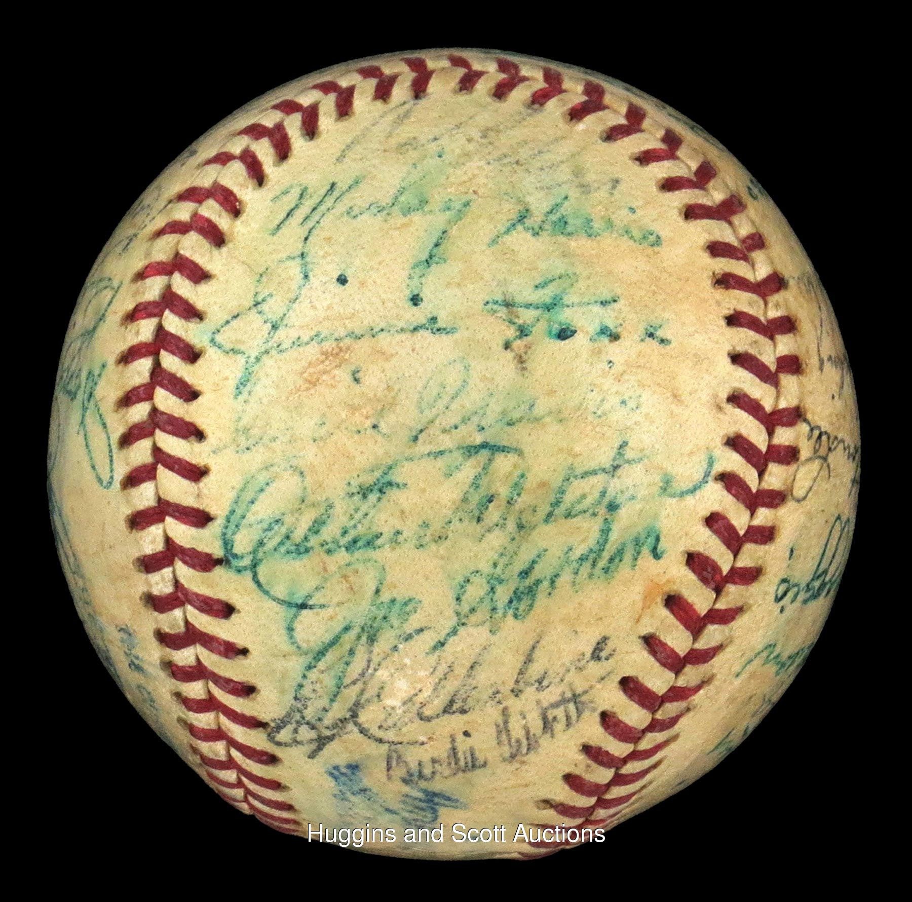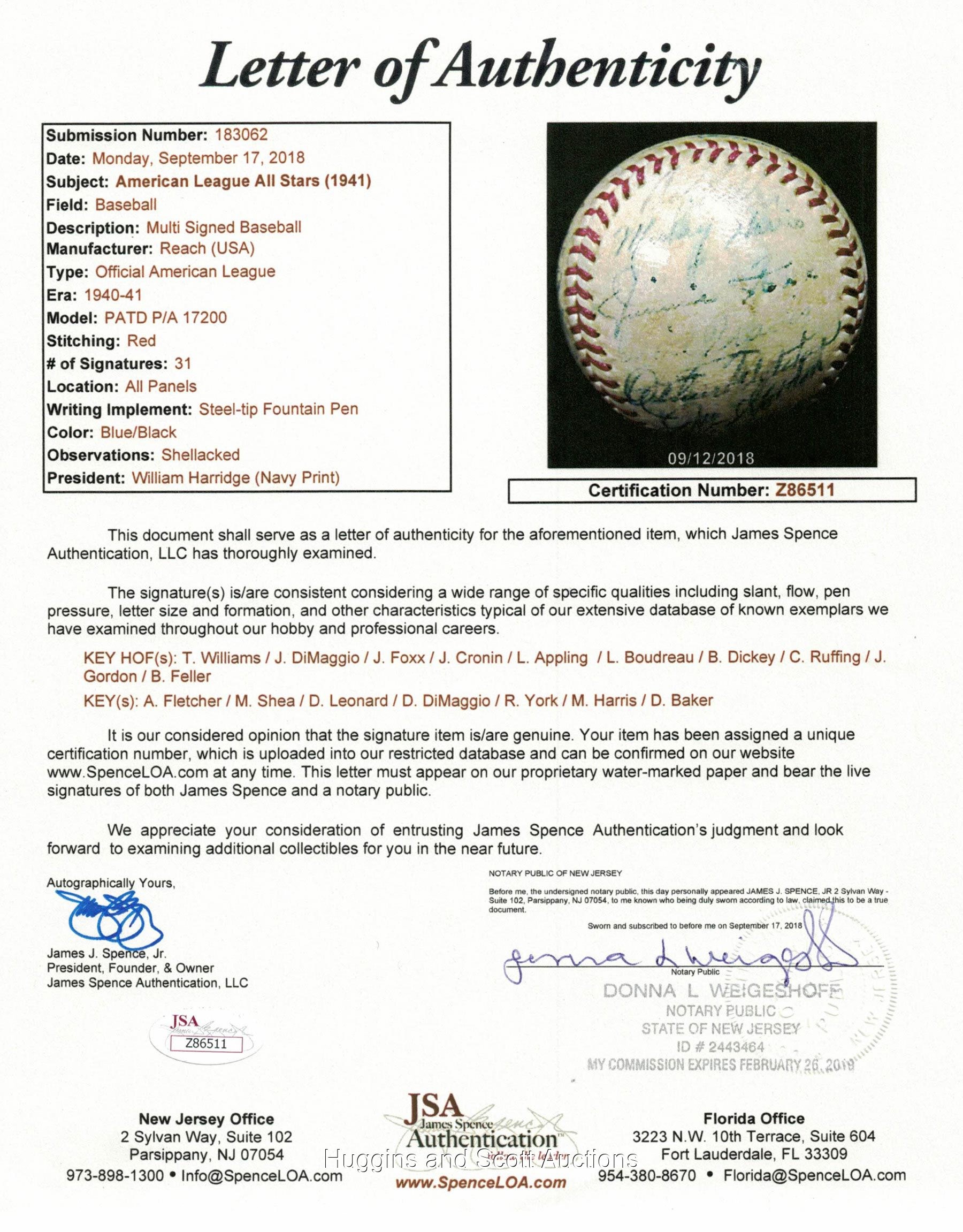 Teddy Ballgame drove in 4 of the junior circuit"s 7 runs in their win at Briggs Stadium. This shellacked, medium-toned OAL (Harridge) features "5-7" signatures. Sweet Spot: Williams ("6"), Dutch Leonard North Panel: Doerr, Al Benton, Steve O"Neill, Frank Hayes, Charlie Keller, Eddie Smith, Ruffing, Rudy York South Panel: Mickey Harris, Foxx ("7-8"), Cecil Travis, Art Fletcher, Gordon, Roy Cullenbine, Birdie Tebbetts West Panel: Del Baker, Dom DiMaggio, Dickey, Ken Keltner, Rudy York East Panel: Cronin, M. Shea (d.1953), Sid Hudson, DiMaggio ("7-8"), Thornton Lee, Appling, Boudreau, Russo Full LOA from JSA.